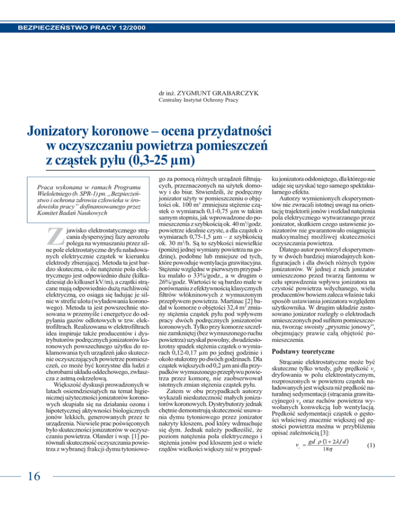 BEZPIECZEÑSTWO PRACY 12/2000 dr in¿. ZYGMUNT GRABARCZYK Centralny Instytut Ochrony Pracy Jonizatory koronowe ocena przydatnoci w oczyszczaniu powietrza pomieszczeñ z cz¹stek py³u (0,3-25 µm) Praca wykonana w ramach Programu Wieloletniego (b. SPR-1) pn. Bezpieczeñstwo i ochrona zdrowia cz³owieka w rodowisku pracy dofinansowanego przez Komitet Badañ Naukowych jawisko elektrostatycznego str¹cania dyspersyjnej fazy aerozolu polega na wymuszaniu przez silne pole elektrostatyczne dryfu na³adowanych elektrycznie cz¹stek w kierunku elektrody zbieraj¹cej. Metoda ta jest bardzo skuteczna, o ile natê¿enie pola elektrycznego jest odpowiednio du¿e (kilkadziesi¹t do kilkuset kV/m), a cz¹stki str¹cane maj¹ odpowiednio du¿¹ ruchliwoæ elektryczn¹, co osi¹ga siê ³aduj¹c je silnie w strefie ulotu (wy³adowania koronowego). Metoda ta jest powszechnie stosowana w przemyle i energetyce do odpylania gazów odlotowych w tzw. elektrofiltrach. Realizowana w elektrofiltrach idea inspiruje tak¿e producentów i dystrybutorów podrêcznych jonizatorów koronowych powszechnego u¿ytku do reklamowania tych urz¹dzeñ jako skutecznie oczyszczaj¹cych powietrze pomieszczeñ, co mo¿e byæ korzystne dla ludzi z chorobami uk³adu oddechowego, zw³aszcza z astm¹ oskrzelow¹. Wiêkszoæ dyskusji prowadzonych w latach osiemdziesi¹tych na temat higienicznej u¿ytecznoci jonizatorów koronowych skupia³a siê na dzia³aniu ozonu i hipotetycznej aktywnoci biologicznych jonów lekkich, generowanych przez te urz¹dzenia. Niewiele prac powiêconych by³o skutecznoci jonizatorów w oczyszczaniu powietrza. Olander i wsp. [1] porównali skutecznoæ oczyszczania powietrza z wybranej frakcji dymu tytoniowe- 16 go za pomoc¹ ró¿nych urz¹dzeñ filtruj¹cych, przeznaczonych na u¿ytek domowy i do biur. Stwierdzili, ¿e podrêczny jonizator u¿yty w pomieszczeniu o objêtoci ok. 100 m3 zmniejsza stê¿enie cz¹stek o wymiarach 0,1-0,75 µm w takim samym stopniu, jak wprowadzone do pomieszczenia z szybkoci¹ ok. 40 m3/godz. powietrze idealnie czyste, a dla cz¹stek o wymiarach 0,75-1,5 µm z szybkoci¹ ok. 30 m3/h. S¹ to szybkoci niewielkie (poni¿ej jednej wymiany powietrza na godzinê), podobne lub mniejsze od tych, które powoduje wentylacja grawitacyjna. Stê¿enie wzglêdne w pierwszym przypadku mala³o o 33%/godz., a w drugim o 26%/godz. Wartoci te s¹ bardzo ma³e w porównaniu z efektywnoci¹ klasycznych filtrów w³ókninowych z wymuszonym przep³ywem powietrza. Martinac [2] bada³ w komorze o objêtoci 32,4 m3 zmiany stê¿enia cz¹stek py³u pod wp³ywem pracy dwóch podrêcznych jonizatorów koronowych. Tylko przy komorze szczelnie zamkniêtej (bez wymuszonego ruchu powietrza) uzyska³ powolny, dwudziestokrotny spadek stê¿enia cz¹stek o wymiarach 0,12-0,17 µm po jednej godzinie i oko³o stukrotny po dwóch godzinach. Dla cz¹stek wiêkszych od 0,2 µm ani dla przypadków wymuszonego przep³ywu powietrza przez komorê, nie zaobserwowa³ istotnych zmian stê¿enia cz¹stek py³u. Zatem w obu przypadkach autorzy wykazali nieskutecznoæ ma³ych jonizatorów koronowych. Dystrybutorzy jednak chêtnie demonstruj¹ skutecznoæ usuwania dymu tytoniowego przez jonizator nakryty kloszem, pod który wdmuchuje siê dym. Jednak nale¿y podkreliæ, ¿e poziom natê¿enia pola elektrycznego i stê¿enia jonów pod kloszem jest o wiele rzêdów wielkoci wiêkszy ni¿ w przypad- ku jonizatora ods³oniêtego, dla którego nie udaje siê uzyskaæ tego samego spektakularnego efektu. Autorzy wymienionych eksperymentów nie zwracali istotnej uwagi na orientacjê trajektorii jonów i rozk³ad natê¿enia pola elektrycznego wytwarzanego przez jonizator, skutkiem czego ustawienie jonizatorów nie gwarantowa³o osi¹gniêcia maksymalnej mo¿liwej skutecznoci oczyszczania powietrza. Dlatego autor powtórzy³ eksperymenty w dwóch bardziej miarodajnych konfiguracjach i dla dwóch ró¿nych typów jonizatorów. W jednej z nich jonizator umieszczono przed twarz¹ fantomu w celu sprawdzenia wp³ywu jonizatora na czystoæ powietrza wdychanego, wielu producentów bowiem zaleca w³anie taki sposób ustawiania jonizatora wzglêdem u¿ytkownika. W drugim uk³adzie zastosowano jonizator rozleg³y o elektrodach umieszczonych pod sufitem pomieszczenia, tworz¹c swoisty prysznic jonowy, obejmuj¹cy prawie ca³¹ objêtoæ pomieszczenia. Podstawy teoretyczne Str¹canie elektrostatyczne mo¿e byæ skuteczne tylko wtedy, gdy prêdkoæ ve dryfowania w polu elektrostatycznym, rozproszonych w powietrzu cz¹stek na³adowanych jest wiêksza ni¿ prêdkoæ naturalnej sedymentacji (str¹cania grawitacyjnego) vg oraz ruchów powietrza wywo³anych konwekcj¹ lub wentylacj¹. Prêdkoæ sedymentacji cz¹stek o gêstoci w³aciwej znacznie wiêkszej od gêstoci powietrza mo¿na w przybli¿eniu opisaæ zale¿noci¹ [3]: (1) BEZPIECZEÑSTWO PRACY 12/2000 gdzie: g sta³a grawitacyjna 9,81 m/s2, d rednica cz¹stki, r rednia masa w³aciwa cz¹stki, l rednia droga swobodna cz¹stki w powietrzu, ok. 10-7 m, h lepkoæ dynamiczna powietrza, ok. 1,7×10-5 kg/(s m). Szybkoæ dryfowania cz¹stek na³adowanych w polu elektrycznym wynosi: (2) gdzie: m ruchliwoæ cz¹stki, zale¿na od jej rednicy i ³adunku elektrycznego, E natê¿enie pola elektrostatycznego. Ruchliwoæ cz¹stki o rednicy z zakresu 0,1 do 25 µm mo¿na opisaæ zale¿noci¹ [4]: (3) gdzie: q ³adunek cz¹stki, e ³adunek elementarny dodatni lub ujemny, równy co do wartoci bezwzglêdnej ³adunkowi elektronu 1,6×10-19 C. Maksymalna liczba ³adunków elementarnych niesionych przez cz¹stkê na³adowan¹ jonami lekkimi w polu elektrostatycznym wynosi: (4) gdzie: entier ( ) wartoæ ca³kowita liczby ( ), A0 przenikalnoæ elektryczna powietrza, Ar wzglêdna, rednia przenikalnoæ elektryczna materia³u cz¹stki. Stosunek prêdkoci str¹cania elektrostatycznego i sedymentacyjnego, wyprowadzony z zale¿noci (1), (2), (3) i (4) wynosi: (5) Zale¿noæ tê pokazano na rys. 1 dla cz¹stek o s³abych w³aci