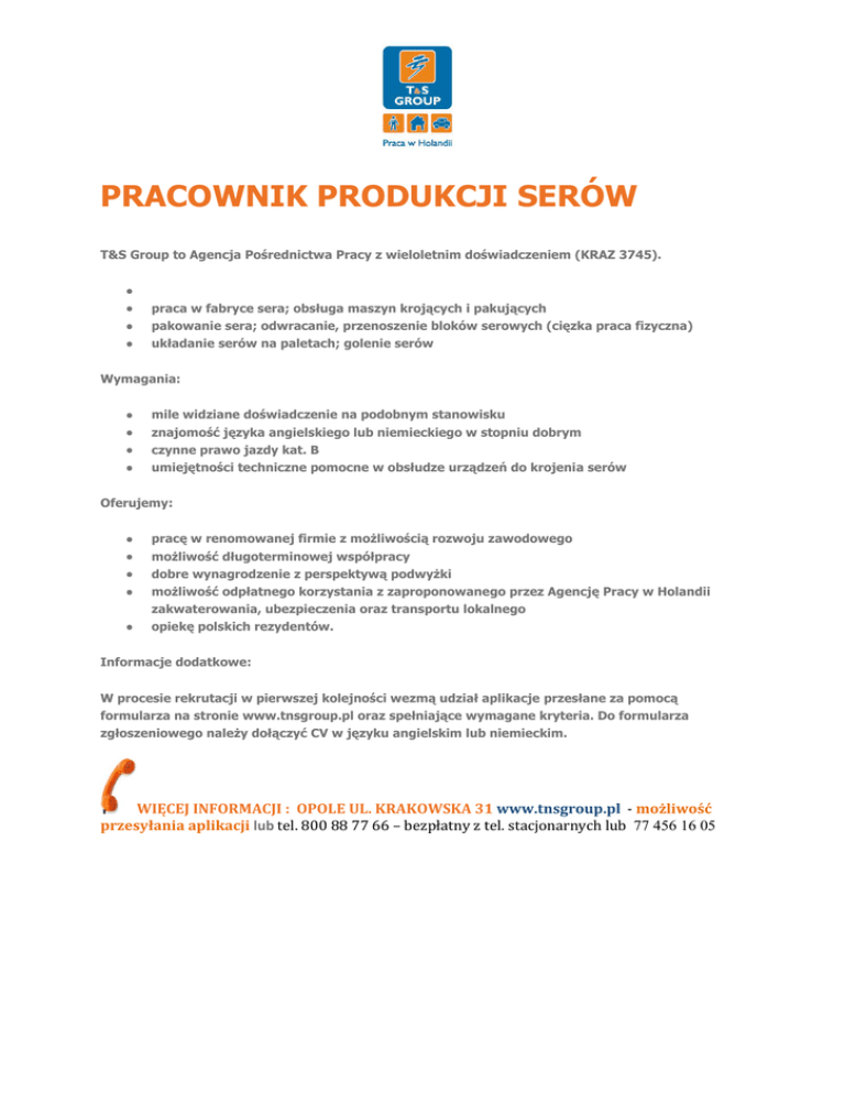 PRACOWNIK PRODUKCJI SERÓW T&S Group to Agencja Pośrednictwa Pracy z wieloletnim doświadczeniem (KRAZ 3745). praca w fabryce sera; obsługa maszyn krojących i pakujących pakowanie sera; odwracanie, przenoszenie bloków serowych (cięzka praca fizyczna) układanie serów na paletach; golenie serów Wymagania: mile widziane doświadczenie na podobnym stanowisku znajomość języka angielskiego lub niemieckiego w stopniu dobrym czynne prawo jazdy kat. B umiejętności techniczne pomocne w obsłudze urządzeń do krojenia serów Oferujemy: pracę w renomowanej firmie z możliwością rozwoju zawodowego możliwość długoterminowej współpracy dobre wynagrodzenie z perspektywą podwyżki możliwość odpłatnego korzystania z zaproponowanego przez Agencję Pracy w Holandii zakwaterowania, ubezpieczenia oraz transportu lokalnego opiekę polskich rezydentów. Informacje dodatkowe: W procesie rekrutacji w pierwszej kolejności wezmą udział aplikacje przesłane za pomocą formularza na stronie www.tnsgroup.pl oraz spełniające wymagane kryteria. Do formularza zgłoszeniowego należy dołączyć CV w języku angielskim lub niemieckim. WIĘCEJ INFORMACJI : OPOLE UL. KRAKOWSKA 31 www.tnsgroup.pl - możliwość przesyłania aplikacji lub tel. 800 88 77 66 – bezpłatny z tel. stacjonarnych lub 77 456 16 05