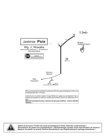 P Drzewo P P Jaskinia Psia v1.4 L W zimie mo¿liwoœæ lawin ! P Wg. J. Nowaka opracowanie graficzne: T. Snopkiewicz http://www.kktj.pl Tatrzañski Park Narodowy jaskinia NIEUDOSTÊPNIONA Wejœcie tylko za zezwoleniem Dyrekcji TPN 38 (8,7,1) Komora G³ówna Sala Kopulasta Z Dno -57 m Na zaporêczowanie wlotówki wystarcza 38 m liny gdy startujemy z batinox'a znajduj¹cego siê w otworze. Jednak przy wysokim stanie œniegu konieczne staje siê zaczepienie liny o drzewo po prawej (drzewo po œrodku jest martwe), potrzeba wówczas 42 m liny. Wariant zaczepienia liny z drzewa nie jest ju¿ mo¿liwy - lawina zabra³a drzewa … Szkice techniczne TYLKO dla osób posiadaj¹cych Kartê Taternika Jaskiniowego ! Wchodzenie do jaskiñ bez przeszkolenia i odpowiedniego sprzêtu mo¿e doprowadziæ do œmierci ! Wejœcie do jaskiñ na terenie Parków Narodowych czy Krajobrazowych wymaga zezwolenia !
