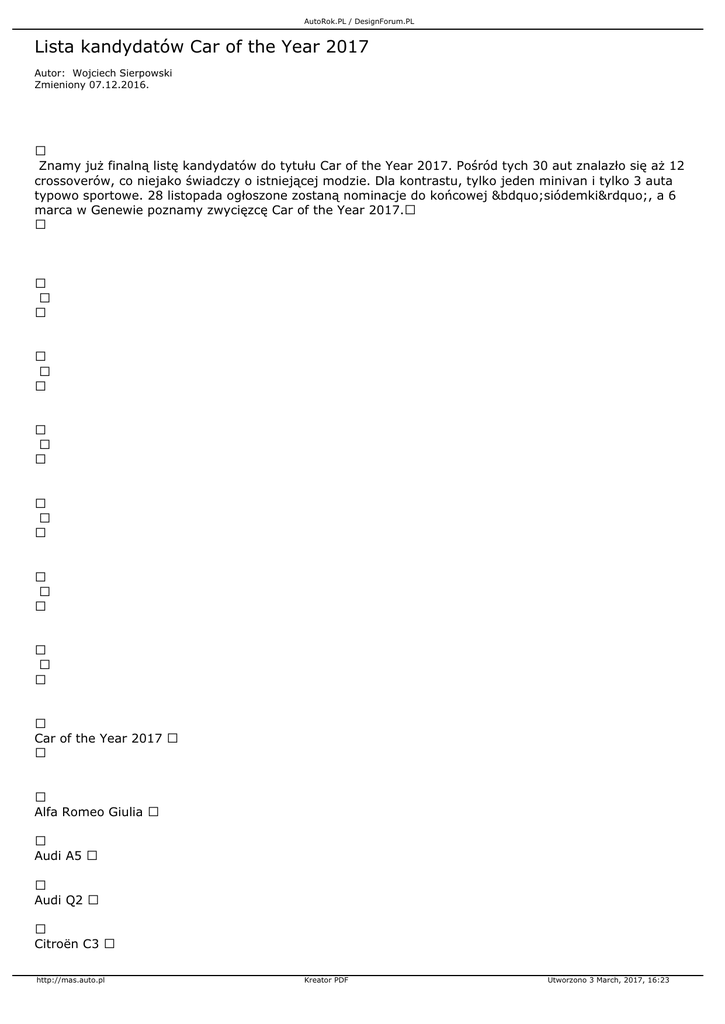 AutoRok.PL / DesignForum.PL Lista kandydatów Car of the Year 2017 Autor: Wojciech Sierpowski Zmieniony 07.12.2016. Znamy już finalną listę kandydatów do tytułu Car of the Year 2017. Pośród tych 30 aut znalazło się aż 12 crossoverów, co niejako świadczy o istniejącej modzie. Dla kontrastu, tylko jeden minivan i tylko 3 auta typowo sportowe. 28 listopada ogłoszone zostaną nominacje do końcowej „siódemki”, a 6 marca w Genewie poznamy zwycięzcę Car of the Year 2017. Car of the Year 2017 Alfa Romeo Giulia Audi A5 Audi Q2 Citroën C3 http://mas.auto.pl Kreator PDF Utworzono 3 March, 2017, 16:23 AutoRok.PL / DesignForum.PL Fiat/Abarth 124 Fiat Tipo Ford Edge Ford Ka + Honda NSX Hyundai Ioniq Jaguar F-Pace Kia Niro Kia Sportage Maserati Levante Mercedes-Benz E-Class Nissan Micra Peugeot 3008 Porsche 718 Boxster/Cayman Porsche Panamera Renault Mégane Renault Scénic Seat Ateca Skoda Kodiaq Suzuki Baleno Tesla Model X http://mas.auto.pl Kreator PDF Utworzono 3 March, 2017, 16:23 AutoRok.PL / DesignForum.PL Toyota C-HR Toyota Mirai Toyota Prius Volkswagen Tiguan Volvo S90/V90 http://mas.auto.pl Kreator PDF Utworzono 3 March, 2017, 16:23