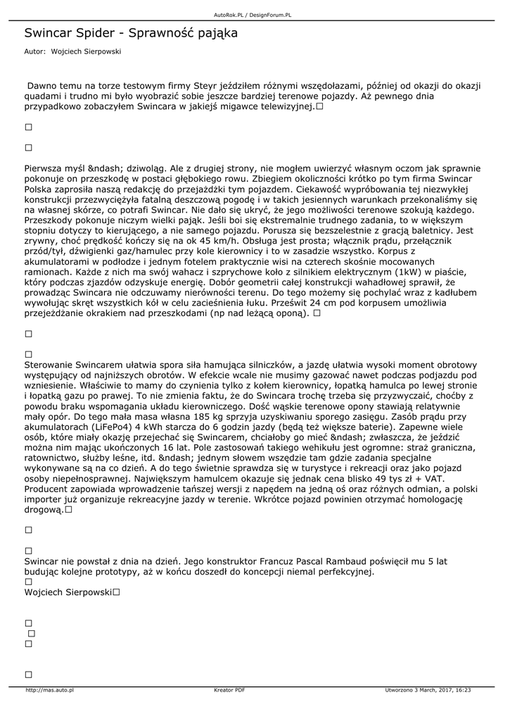 AutoRok.PL / DesignForum.PL Swincar Spider - Sprawność pająka Autor: Wojciech Sierpowski Dawno temu na torze testowym firmy Steyr jeździłem różnymi wszędołazami, później od okazji do okazji quadami i trudno mi było wyobrazić sobie jeszcze bardziej terenowe pojazdy. Aż pewnego dnia przypadkowo zobaczyłem Swincara w jakiejś migawce telewizyjnej. Pierwsza myśl – dziwoląg. Ale z drugiej strony, nie mogłem uwierzyć własnym oczom jak sprawnie pokonuje on przeszkodę w postaci głębokiego rowu. Zbiegiem okoliczności krótko po tym firma Swincar Polska zaprosiła naszą redakcję do przejażdżki tym pojazdem. Ciekawość wypróbowania tej niezwykłej konstrukcji przezwyciężyła fatalną deszczową pogodę i w takich jesiennych warunkach przekonaliśmy się na własnej skórze, co potrafi Swincar. Nie dało się ukryć, że jego możliwości terenowe szokują każdego. Przeszkody pokonuje niczym wielki pająk. Jeśli boi się ekstremalnie trudnego zadania, to w większym stopniu dotyczy to kierującego, a nie samego pojazdu. Porusza się bezszelestnie z gracją baletnicy. Jest zrywny, choć prędkość kończy się na ok 45 km/h. Obsługa jest prosta; włącznik prądu, przełącznik przód/tył, dźwigienki gaz/hamulec przy kole kierownicy i to w zasadzie wszystko. Korpus z akumulatorami w podłodze i jednym fotelem praktycznie wisi na czterech skośnie mocowanych ramionach. Każde z nich ma swój wahacz i szprychowe koło z silnikiem elektrycznym (1kW) w piaście, który podczas zjazdów odzyskuje energię. Dobór geometrii całej konstrukcji wahadłowej sprawił, że prowadząc Swincara nie odczuwamy nierówności terenu. Do tego możemy się pochylać wraz z kadłubem wywołując skręt wszystkich kół w celu zacieśnienia łuku. Prześwit 24 cm pod korpusem umożliwia przejeżdżanie okrakiem nad przeszkodami (np nad leżącą oponą). Sterowanie Swincarem ułatwia spora siła hamująca silniczków, a jazdę ułatwia wysoki moment obrotowy występujący od najniższych obrotów. W efekcie wcale nie musimy gazować nawet podczas podjazdu pod wzniesienie. Właściwie to mamy do czynienia tylko z kołem kierownicy, łopatką hamulca po lewej stronie i łopatką gazu po prawej. To nie zmienia faktu, że do Swincara trochę trzeba się przyzwyczaić, choćby z powodu braku wspomagania układu kierowniczego. Dość wąskie terenowe opony stawiają relatywnie mały opór. Do tego mała masa własna 185 kg sprzyja uzyskiwaniu sporego zasięgu. Zasób prądu przy akumulatorach (LiFePo4) 4 kWh starcza do 6 godzin jazdy (będą też większe baterie). Zapewne wiele osób, które miały okazję przejechać się Swincarem, chciałoby go mieć – zwłaszcza, że jeździć można nim mając ukończonych 16 lat. Pole zastosowań takiego wehikułu jest ogromne: straż graniczna, ratownictwo, służby leśne, itd. – jednym słowem wszędzie tam gdzie zadania specjalne wykonywane są na co dzień. A do tego świetnie sprawdza się w turystyce i rekreacji oraz jako pojazd osoby niepełnosprawnej. Największym hamulcem okazuje się jednak cena blisko 49 tys zł + VAT. Producent zapowiada wprowadzenie tańszej wersji z napędem na jedną oś oraz różnych odmian, a polski importer już organizuje rekreacyjne jazdy w terenie. Wkrótce pojazd powinien otrzymać homologację drogową. Swincar nie powstał z dnia na dzień. Jego konstruktor Francuz Pascal Rambaud poświęcił mu 5 lat budując kolejne prototypy, aż w końcu doszedł do koncepcji niemal perfekcyjnej. Wojciech Sierpowski http://mas.auto.pl Kreator PDF Utworzono 3 March, 2017, 16:23 AutoRok.PL / DesignForum.PL Galeria zdjęć http://mas.auto.pl Kreator PDF Utworzono 3 March, 2017, 16:23