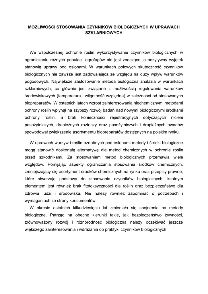 MOŻLIWOŚCI STOSOWANIA CZYNNIKÓW BIOLOGICZNYCH W UPRAWACH SZKLARNIOWYCH We współczesnej ochronie roślin wykorzystywanie czynników biologicznych w ograniczaniu różnych populacji agrofagów nie jest znaczące, a pozytywny wyjątek stanowią uprawy pod osłonami. W warunkach polowych skuteczność czynników biologicznych nie zawsze jest zadowalająca ze względu na duży wpływ warunków pogodowych. Największe zastosowanie metoda biologiczna znalazła w warunkach szklarniowych, co głównie jest związane z możliwością regulowania warunków środowiskowych (temperatura i wilgotność względna) w zależności od stosowanych biopreparatów. W ostatnich latach wzrost zainteresowania niechemicznymi metodami ochrony roślin wpłynął na szybszy rozwój badań nad nowymi biologicznymi środkami ochrony roślin, a brak konieczności rejestracyjnych dotyczących nicieni pasożytniczych, drapieżnych roztoczy oraz pasożytniczych i drapieżnych owadów spowodował zwiększenie asortymentu biopreparatów dostępnych na polskim rynku. W uprawach warzyw i roślin ozdobnych pod osłonami metody i środki biologiczne mogą stanowić doskonałą alternatywę dla metod chemicznych w ochronie roślin przed szkodnikami. Za stosowaniem metod biologicznych przemawia wiele względów. Pomijając aspekty ograniczania stosowania środków chemicznych, zmniejszający się asortyment środków chemicznych na rynku oraz przepisy prawne, które stwarzają podstawy do stosowania czynników biologicznych, istotnym elementem jest również brak fitotoksyczności dla roślin oraz bezpieczeństwo dla zdrowia ludzi i środowiska. Nie należy również zapominać o potrzebach i wymaganiach ze strony konsumentów. W okresie ostatnich kilkudziesięciu lat zmieniało się spojrzenie na metody biologiczne. Patrząc na obecne kierunki takie, jak bezpieczeństwo żywności, zrównoważony rozwój i różnorodność biologiczną należy oczekiwać jeszcze większego zainteresowania i wdrażania do praktyki czynników biologicznych Biopreparaty oparte na żywych organizmach (makroorganizmy) dostępne na polskim rynku polecane do stosowania w uprawach pod osłonami. Nazwa i charakterystyka Zakres stosowania żywego organizmu Dawka muchówki z rodziny ziemiórkowatych w uprawach warzyw i roślin ozdobnych pod osłonami oraz w pieczarkarniach Steinernema feltiae pasożytniczy nicień Steinernema carpocapsae pasożytniczy nicień Phasmarhabditis hermaphrodita pasożytniczy nicień Heterorhabditis bacteriophora pasożytniczy nicień zapobiegawczo: 0,5 mln sztuk nicieni/m2; interwencyjnie: 1 mln sztuk nicieni/m2, opakowanie zawierające 50 mln gąsienice motyli w sztuk nicieni uprawach szklarniowych rozpuszczone w 100 litrach wody wystarczy do podlania około 100 m2 powierzchni ślimaki w uprawach warzyw i roślin ozdobnych pod osłonami larwy chrząszczy (głównie ogrodnicy niszczylistki, kopyciaka i chrabąszcza majowego) w uprawach warzywnych ziemiórki oraz poczwarki 2 osobniki/m2 wyłożyć wciornastków w uprawach na podłoże, powtórzyć warzyw i roślin ozdobnych w razie konieczności pod osłonami Atheta coriaria drapieżna biedronka wełnowce oraz czerwce w 2–10 osobników/m2, uprawach roślin dwukrotnie, co 14 dni biedronka ozdobnych pod osłonami Cryptolaemus montrouzieri drapieżna (wełnowcowa) Adalia bipunctata drapieżna biedronka (dwukropka) mszyce w uprawach 3–5 larw w gniazda warzyw i roślin ozdobnych mszyc, powtarzać w pod osłonami razie konieczności mączliki w uprawach około warzyw i roślin ozdobnych osobników/roślinę drapieżna biedronka (mączlikowa) pod osłonami Delphastus pusillus 10 Stethorus punctilium drapieżna biedronka przędziorkowiec) Aphelinus abdominalis drapieżna mszycowy) błonkówka Episyrphus balteatus drapieżna muchówka przędziorki w uprawach od 10 sztuk do 200 (skulik warzyw pod osłonami sztuk na roślinę na tydzień przez 3-4 tygodni w zależności od nasilenia mszyce w uprawach 2 osobniki/m2, warzyw i roślin ozdobnych trzykrotna introdukcja (osiec pod osłonami co 2 tygodnie mszyce w uprawach 50–100 osobników/ha, warzyw i roślin ozdobnych dwukrotnie co 7 dni pod osłonami mszyce, mączliki, wciornastki i przędziorki w drapieżna muchówka uprawach warzyw i roślin ozdobnych pod osłonami Feltiella acarisuga przędziorki w uprawach warzyw i roślin ozdobnych drapieżna muchówka pod osłonami (pryszczarek miniarkowaty) Sphaerophoria rueppellii 50–100 osobników/ha, dwukrotnie co 7 dni 500–2500 szt./ha/tydzień przez kolejne 6 tygodni mszyce w uprawach po zauważeniu mszyc: warzyw i roślin ozdobnych 2–3 poczwarki/m2 co drapieżna muchówka pod osłonami 1–2 tygodnie; kolejne (pryszczarek mszycojad) introdukcje: 0,5 2 poczwarki/m Aphidoletes aphidimyza O. laevigatus, O. majusculus, wciornastki w uprawach 0,5–3 O. insidiosus, O. strigicollis warzyw i roślin ozdobnych osobników/roślinę (w pod osłonami zależności od nasilenia drapieżne pluskwiaki szkodnika) dwukrotnie (dziubałeczki) co 3 tygodnie Macrolophus melanotoma lub mączliki, przędziorki, pygmeus drapieżny pluskwiak wciornastki w uprawach (dziubałeczek mączlikowy) warzyw i roślin ozdobnych pod osłonami 2–3 szt./roślinę/sezon, 10 tys. szt./ha w 2–3 porcjach, co 2–3 tygodnie mączliki i Tuta absoluta w 2–3 szt./roślinę/sezon, uprawie pomidora 10 tys. szt./ha w 2–3 drapieżny pluskwiak szklarniowego porcjach, co 2–3 tygodnie Phytoseiulus persimilis przędziorki w uprawach 3–9 szt./roślinę w warzyw i roślin ozdobnych gniazda przędziorków, drapieżny roztocz (dobroczynek pod osłonami introdukcję powtarzać szklarniowy) w miarę konieczności, Nesidiocoris tenuis nie można stosować profilaktycznie ziemiórki oraz poczwarki wciornastków w uprawach warzyw i roślin ozdobnych pod osłonami całkowita dawka – 50– 100 szt./roślinę, profilaktycznie co 1–2 tygodnie od momentu posadzenia roślin przędziorki, inne roztocza roślinożerne oraz drapieżny