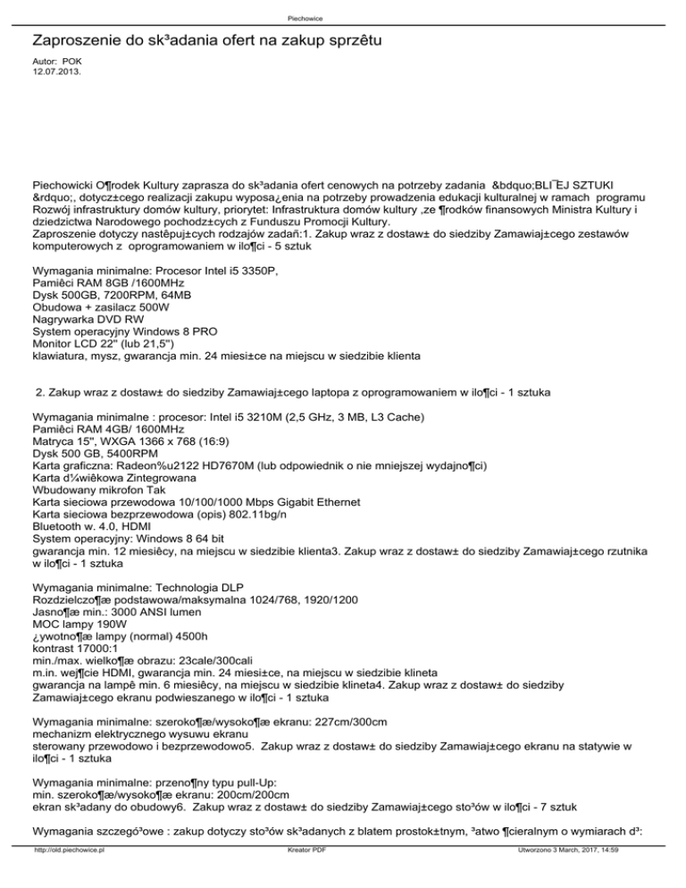 Piechowice Zaproszenie do sk³adania ofert na zakup sprzêtu Autor: POK 12.07.2013. Piechowicki O¶rodek Kultury zaprasza do sk³adania ofert cenowych na potrzeby zadania „BLI¯EJ SZTUKI ”, dotycz±cego realizacji zakupu wyposa¿enia na potrzeby prowadzenia edukacji kulturalnej w ramach programu Rozwój infrastruktury domów kultury, priorytet: Infrastruktura domów kultury ,ze ¶rodków finansowych Ministra Kultury i dziedzictwa Narodowego pochodz±cych z Funduszu Promocji Kultury. Zaproszenie dotyczy nastêpuj±cych rodzajów zadañ:1. Zakup wraz z dostaw± do siedziby Zamawiaj±cego zestawów komputerowych z oprogramowaniem w ilo¶ci - 5 sztuk Wymagania minimalne: Procesor Intel i5 3350P, Pamiêci RAM 8GB /1600MHz Dysk 500GB, 7200RPM, 64MB Obudowa + zasilacz 500W Nagrywarka DVD RW System operacyjny Windows 8 PRO Monitor LCD 22'' (lub 21,5'') klawiatura, mysz, gwarancja min. 24 miesi±ce na miejscu w siedzibie klienta 2. Zakup wraz z dostaw± do siedziby Zamawiaj±cego laptopa z oprogramowaniem w ilo¶ci - 1 sztuka Wymagania minimalne : procesor: Intel i5 3210M (2,5 GHz, 3 MB, L3 Cache) Pamiêci RAM 4GB/ 1600MHz Matryca 15'', WXGA 1366 x 768 (16:9) Dysk 500 GB, 5400RPM Karta graficzna: Radeon%u2122 HD7670M (lub odpowiednik o nie mniejszej wydajno¶ci) Karta d¼wiêkowa Zintegrowana Wbudowany mikrofon Tak Karta sieciowa przewodowa 10/100/1000 Mbps Gigabit Ethernet Karta sieciowa bezprzewodowa (opis) 802.11bg/n Bluetooth w. 4.0, HDMI System operacyjny: Windows 8 64 bit gwarancja min. 12 miesiêcy, na miejscu w siedzibie klienta3. Zakup wraz z dostaw± do siedziby Zamawiaj±cego rzutnika w ilo¶ci - 1 sztuka Wymagania minimalne: Technologia DLP Rozdzielczo¶æ podstawowa/maksymalna 1024/768, 1920/1200 Jasno¶æ min.: 3000 ANSI lumen MOC lampy 190W ¿ywotno¶æ lampy (normal) 4500h kontrast 17000:1 min./max. wielko¶æ obrazu: 23cale/300cali m.in. wej¶cie HDMI, gwarancja min. 24 miesi±ce, na miejscu w siedzibie klineta gwarancja na lampê min. 6 miesiêcy, na miejscu w siedzibie klineta4. Zakup wraz z dostaw± do siedziby Zamawiaj±cego ekranu podwieszanego w ilo¶ci - 1 sztuka Wymagania minimalne: szeroko¶æ/wysoko¶æ ekranu: 227cm/300cm mechanizm elektrycznego wysuwu ekranu sterowany przewodowo i bezprzewodowo5. Zakup wraz z dostaw± do siedziby Zamawiaj±cego ekranu na statywie w ilo¶ci - 1 sztuka Wymagania minimalne: przeno¶ny typu pull-Up: min. szeroko¶æ/wysoko¶æ ekranu: 200cm/200cm ekran sk³adany do obudowy6. Zakup wraz z dostaw± do siedziby Zamawiaj±cego sto³ów w ilo¶ci - 7 sztuk Wymagania szczegó³owe : zakup dotyczy sto³ów sk³adanych z blatem prostok±tnym, ³atwo ¶cieralnym o wymiarach d³: http://old.piechowice.pl Kreator PDF Utworzono 3 March, 2017, 14:59 Piechowice 140- 150 cm x szer. 70-72 cm i wysoko¶ci ca³kowitej sto³u 70-72 cm, stela¿ metalowy – sk³adany, kolor blatu jasny ( buk , olcha). Ca³o¶æ trwa³a i solidna z mo¿liwo¶ci± sk³adowana w stosie. 7. Zakup wraz z dostaw± do siedziby Zamawiaj±cego krzese³ w ilo¶ci - 35 sztuk Wymagania szczegó³owe : zakup dotyczy krzese³ tapicerowanych tkanin± o wysokiej odporno¶ci na ¶cieralno¶æ i plamo odporn± w kolorach np. melan¿ czarny z szarym, br±zowy z be¿owym lub szarym, stela¿ metalowy. Ca³o¶æ trwa³a i solidna z mo¿liwo¶ci± sztaplowania. Termin sk³adania ofert: 25 lipca 2013r.Termin wykonania us³ugi dla zadañ nr 1 - 7: 12 sierpnia 2013r. 8. Monta¿ w siedzibie Zamawiaj±cego zestawów komputerowych wymienionych w pkt.1 i ekranu podwieszanego wymienionego w pkt. 4. Wymagania szczegó³owe : materia³y i narzêdzia niezbêdne do wykonania monta¿u zabezpiecza wykonawca us³ugi.Termin sk³adania ofert: 25 lipca 2013r.Termin wykonania us³ugi dla zadania nr 8 : 01-15 wrze¶nia 2013r.Oferty nale¿y sk³adaæ: osobi¶cie do Piechowickiego O¶rodka Kultury, ul. ¯ymierskiego 53, 58-573 Piechowice lub przes³aæ poczt± elektroniczn± na adres : [email protected] Dodatkowe informacje pod nr tel. 75 76 17 201. Do pobrania formularz ofertowy » http://old.piechowice.pl Kreator PDF Utworzono 3 March, 2017, 14:59