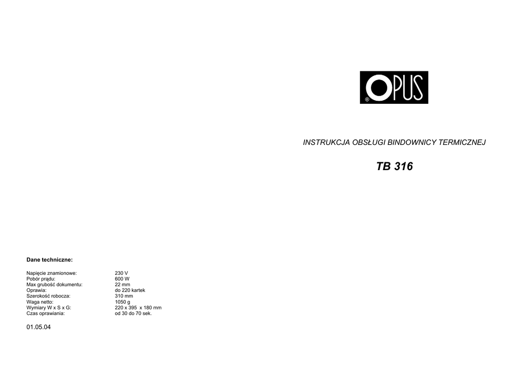 INSTRUKCJA OBSŁUGI BINDOWNICY TERMICZNEJ TB 316 Dane techniczne: Napięcie znamionowe: Pobór prądu: Max grubość dokumentu: Oprawia: Szerokość robocza: Waga netto: Wymiary W x S x G: Czas oprawiania: 01.05.04 230 V 600 W 22 mm do 220 kartek 310 mm 1050 g 220 x 395 x 180 mm od 30 do 70 sek. Zasady bezpieczeństwa • • • • • • • • • • • • • • • • • Przed rozpoczęciem pracy z urządzeniem, należy zapoznać się z zasadami bezpieczeństwa, zaleceniami producenta i instrukcją obsługi. Instrukcje te należy zachować i korzystać z nich w przypadku jakichkolwiek wątpliwości dotyczących obsługi urządzenia Urządzenie należy ustawić na stabilnym podłożu w pobliżu gniazdka o napięciu 230V Urządzenie należy chronić przed wilgocią i kurzem Nie wolno ustawiać urządzenia w pobliżu urządzeń grzejnych lub wentylacyjnych Nie wolno używać urządzenia w pobliżu łatwopalnych gazów lub cieczy Należy chronić przewód zasilający urządzenie przed uszkodzeniem, nie używać kabla do przenoszenia urządzenia i wyciągania wtyczki z gniazdka Urządzenie należy wyłączyć z sieci, jeśli nie jest używane przez dłuższy czas lub gdy jest przenoszone Całkowite wyłączenie urządzenia następuje po wyjęciu wtyczki z sieci Urządzenie należy trzymać poza zasięgiem dzieci Urządzenie zawiera elementy grzejne, należy zachować ostrożność Nie wolno używać urządzenia do innych celów niż określone w instrukcji obsługi Należy kontrolować sprawność urządzenia. W przypadku zauważenia jakichkolwiek nieprawidłowości w pracy, należy skontaktować się z serwisem Urządzenie jest przeznaczone wyłącznie do pracy w pomieszczeniach zamkniętych, w temperaturze powyżej 8° C Przed zdjęciem jakiejkolwiek osłony, należy wyjąć wtyczkę z gniazdka sieciowego Stosowanie niewłaściwych substancji smarujących stwarza zagrożenie pożarowe Urządzenie należy obsługiwać zawsze zgodnie z ogólnymi zasadami BHP Wszelkich napraw urządzenia może dokonywać jedynie osoba uprawniona Przygotowanie maszyny Oprawianie • • • • • Wyjmij cztery plastikowe elementy, znajdujące się pod podstawą urządzenia i zamocuj je w rowkach stojaka do bindowania oraz stojaka do chłodzenia dokumentów Włóż wtyczkę do gniazdka sieciowego Naciśnij przycisk 0/1 - zapali się czerwona lampka WAIT (Czekaj). Po 30 sekundach nagrzewania zapali się zielona lampka READY (Gotowy), w tej samej chwili uruchomi się sygnał dźwiękowy. Urządzenie jest gotowe do pracy Do szczeliny grzewczej możesz włożyć dokumentację (kilka opraw z dokumentami jednocześnie) o max grubości 22 mm • • • Chłodzenie dokumentu Przygotowanie dokumentu do oprawy • • • • Przy pomocy niżej podanej tabeli wybierz odpowiedni rozmiar termookładki Plik kartek wyrównaj i włóż do okładki tak, by wszystkie kartki równomiernie stykały się z paskiem kleju umieszczonym w grzbiecie okładki Czas nagrzewania (przycisk TIME) 30 sek. Rozmiar okładki Rozmiar Liczba kartek mini~3mm 40 sek. 4~10mm 50 sek. 12~15mm 60 sek. 18~20mm 70 sek. 20~22mm Mini/1~15 kartek 3mm/16~30 kartek 4mm/31~40 kartek 6mm/51~60kartek 8mm/71~80 kartek 10mm/91~100 kartek 12mm/101~120 kartek 14mm/141~150 kartek 18mm/161~180 kartek 20mm/181~200 kartek 22mm/201~220 kartek Równo ułożone kartki dokumentacji w okładce włóż do szczeliny termobindownicy grzbietem w dół Naciśnij przycisk TIME i ustaw czas grzania zgodnie z rozmiarem dokumentacji Naciśnij przycisk BIND (Bindowanie), aby rozpocząć proces oprawiania (zapali się czerwona lampka WAIT) Dokumentacja jest gotowa gdy zapali się zielona lampka READY i usłyszysz sygnał dźwiękowy Wyjmij oprawiony dokument i uderz jego grzbietem o płaską powierzchnię, aby wszystkie kartki zatopiły się w kleju Odstaw dokument na podstawkę do chłodzenia, znajdującą się z tyłu urządzenia. Po kilku minutach oprawa jest gotowa Dodatkowe wskazówki • • • W przypadku, gdy pojedyncze kartki nie zostały prawidłowo zbindowane, można powtórzyć proces termobindowania, poprawiając położenie kartek Pierwsza i ostatnia kartka będą prawidłowo zbindowane, gdy natychmiast po oprawieniu ściśniesz grzbiet kciukiem i palcem wskazującym Uwaga !!! Grzbiet może być gorący Ochłodzony dokument należy zgiąć wzdłuż rowka (bigu) na okładce, dzięki temu łatwiej będzie otwierać okładkę
