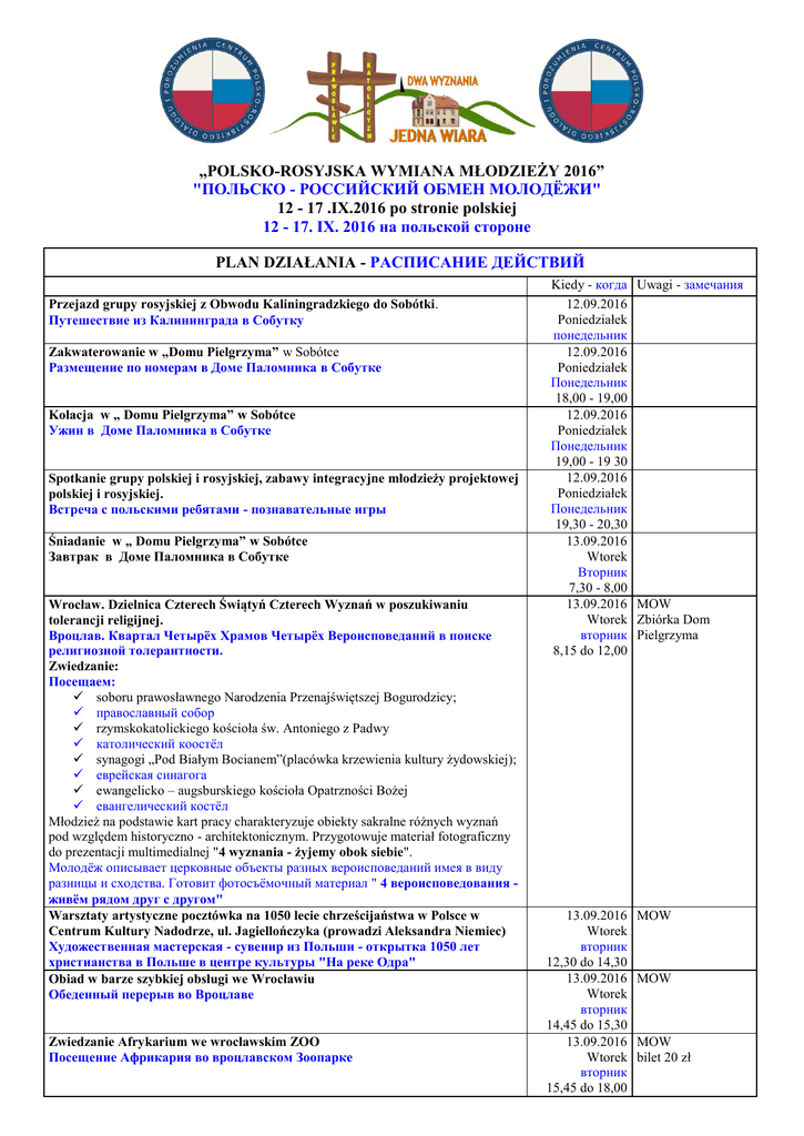 „POLSKO-ROSYJSKA WYMIANA MŁODZIEŻY 2016” "ПОЛЬСКО - РОССИЙСКИЙ ОБМЕН МОЛОДЁЖИ" 12 - 17 .IX.2016 po stronie polskiej 12 - 17. IX. 2016 на польской стороне PLAN DZIAŁANIA - РАСПИСАНИЕ ДЕЙСТВИЙ Przejazd grupy rosyjskiej z Obwodu Kaliningradzkiego do Sobótki. Путешествие из Калининграда в Собутку Zakwaterowanie w „Domu Pielgrzyma” w Sobótce Размещение по номерам в Доме Паломника в Собутке Kolacja w „ Domu Pielgrzyma” w Sobótce Ужин в Доме Паломника в Собутке Spotkanie grupy polskiej i rosyjskiej, zabawy integracyjne młodzieży projektowej polskiej i rosyjskiej. Встреча с польскими ребятами - познавательные игры Śniadanie w „ Domu Pielgrzyma” w Sobótce Завтрак в Доме Паломника в Собутке Wrocław. Dzielnica Czterech Świątyń Czterech Wyznań w poszukiwaniu tolerancji religijnej. Вроцлав. Квартал Четырёх Храмов Четырёх Вероисповеданий в поиске религиозной толерантности. Zwiedzanie: Посещаем: soboru prawosławnego Narodzenia Przenajświętszej Bogurodzicy; православный собор rzymskokatolickiego kościoła św. Antoniego z Padwy католический коостёл synagogi „Pod Białym Bocianem”(placówka krzewienia kultury żydowskiej); еврейская синагога ewangelicko – augsburskiego kościoła Opatrzności Bożej евангелический костёл Młodzież na podstawie kart pracy charakteryzuje obiekty sakralne różnych wyznań pod względem historyczno - architektonicznym. Przygotowuje materiał fotograficzny do prezentacji multimedialnej "4 wyznania - żyjemy obok siebie". Молодёж описывает церковные объекты разных вероисповеданий имея в виду разницы и сходства. Готовит фотосъёмочный материал " 4 вероисповедования живём рядом друг с другом" Warsztaty artystyczne pocztówka na 1050 lecie chrześcijaństwa w Polsce w Centrum Kultury Nadodrze, ul. Jagiellończyka (prowadzi Aleksandra Niemiec) Художественная мастерская - сувенир из Польши - открытка 1050 лет христианства в Польше в центре культуры "На реке Одра" Obiad w barze szybkiej obsługi we Wrocławiu Обеденный перерыв во Вроцлаве Zwiedzanie Afrykarium we wrocławskim ZOO Посещение Африкария во вроцлавском Зоопарке Kiedy - когда 12.09.2016 Poniedziałek понедельник 12.09.2016 Poniedziałek Понедельник 18,00 - 19,00 12.09.2016 Poniedziałek Понедельник 19,00 - 19 30 12.09.2016 Poniedziałek Понедельник 19,30 - 20,30 13.09.2016 Wtorek Вторник 7,30 - 8,00 13.09.2016 Wtorek вторник 8,15 do 12,00 13.09.2016 Wtorek вторник 12,30 do 14,30 13.09.2016 Wtorek вторник 14,45 do 15,30 13.09.2016 Wtorek вторник 15,45 do 18,00 Uwagi - замечания MOW Zbiórka Dom Pielgrzyma MOW MOW MOW bilet 20 zł Przejazd do Sobótki Возвращение в Собутку Kolacja w „ Domu Pielgrzyma” w Sobótce Ужин в Доме Паломника в Собутке Свободное время Śniadanie w „ Domu Pielgrzyma” w Sobótce Завтрак в Доме Паломника в Собутке Wycieczka autokarowa do Karpacza. (czas przejazdu ok 4 godz.) (Na trasie Świdnica - kościół Pokoju 1 godz.), (świątynia Wang - Karpacza 1 godz.) (wjazd na Kopę do 16,00 - 2 godz.) (Kowary - park miniatur do 18,00 - 1 godz.) Obiad w Karpaczu Автоэкскурсия в горы Карконоше (евангелическая церковь Мира в городе Свидница, церковь Ванг в городе Карпач, въезд по канатной дороге на гору Копа, музей архитектурных миниатюр в городе Ковары. Обед в Карпаче. Kolacja w „ Domu Pielgrzyma” w Sobótce Ужин в Доме Паломника в Собутке Свободное время Śniadanie w „ Domu Pielgrzyma” w Sobótce Завтрак в Доме Паломника в Собутке Przejazd do Wrocławia Путешествие во Вроцлав Wrocław Starostwo Powiatowe. Spotkanie ze Starostą Powiatu Romanem Potockim Встреча в ведомстве во Вроцлаве со Старостой (начальником) вроцлавской области Zwiedzanie centrum wody Hydropolis. Woda - jako jeden z symboli wiary chrześcijańskiej Посещение музея Центра воды Гидрополис (вода как один из символов христианской веры Wjazd na 48 piętro wieżowca Skytawer - panorama miasta, wieże kościołów wrocławskich z lotu ptaka. Панорамный вид города Вроцлава. Въезд на лифте на 48 этаж. Башни вроцлавских церквей из птичьего полёта. Obiad w barze we Wrocławiu Обеденный перерыв во Вроцлаве Zwiedzanie Ostrowa Tumskiego, Rynku wraz z kościołami Посещение Тумского острова (кафедральный собор), рыночная площадь, ратушаю. Свободное время Kolacja w „Domu Pielgrzyma” w Sobótce Ужин в Доме Паломника в Собутке Przygotowanie do inscenizacji obrządku ślubu katolickiego Подготовка ребят к инсценировке католического брака Śniadanie w „ Domu Pielgrzyma” w Sobótce 