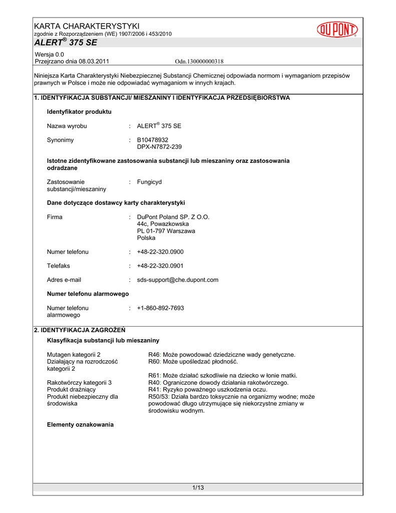 KARTA CHARAKTERYSTYKI zgodnie z Rozporządzeniem (WE) 1907/2006 i 453/2010 ® ALERT 375 SE Wersja 0.0 Przejrzano dnia 08.03.2011 Odn.130000000318 Niniejsza Karta Charakterystyki Niebezpiecznej Substancji Chemicznej odpowiada normom i wymaganiom przepisów prawnych w Polsce i może nie odpowiadać wymaganiom w innych krajach. 1. IDENTYFIKACJA SUBSTANCJI/ MIESZANINY I IDENTYFIKACJA PRZEDSIĘBIORSTWA Identyfikator produktu Nazwa wyrobu : ALERT® 375 SE Synonimy : B10478932 DPX-N7872-239 Istotne zidentyfikowane zastosowania substancji lub mieszaniny oraz zastosowania odradzane Zastosowanie substancji/mieszaniny : Fungicyd Dane dotyczące dostawcy karty charakterystyki Firma : DuPont Poland SP. Z O.O. 44c, Powazkowska PL 01-797 Warszawa Polska Numer telefonu : +48-22-320.0900 Telefaks : +48-22-320.0901 Adres e-mail : [email protected] : +1-860-892-7693 Numer telefonu alarmowego Numer telefonu alarmowego 2. IDENTYFIKACJA ZAGROŻEŃ Klasyfikacja substancji lub mieszaniny Mutagen kategorii 2 Działający na rozrodczość kategorii 2 Rakotwórczy kategorii 3 Produkt drażniący Produkt niebezpieczny dla środowiska R46: Może powodować dziedziczne wady genetyczne. R60: Może upośledzać płodność. R61: Może działać szkodliwie na dziecko w łonie matki. R40: Ograniczone dowody działania rakotwórczego. R41: Ryzyko poważnego uszkodzenia oczu. R50/53: Działa bardzo toksycznie na organizmy wodne; może powodować długo utrzymujące się niekorzystne zmiany w środowisku wodnym. Elementy oznakowania 1/13 KARTA CHARAKTERYSTYKI zgodnie z Rozporządzeniem (WE) 1907/2006 i 453/2010 ® ALERT 375 SE Wersja 0.0 Przejrzano dnia 08.03.2011 Produkt toksyczny Odn.130000000318 Produkt niebezpieczny dla środowiska R40 R46 R60 R61 R50/53 Ograniczone dowody działania rakotwórczego. Może powodować dziedziczne wady genetyczne. Może upośledzać płodność. Może działać szkodliwie na dziecko w łonie matki. Działa bardzo toksycznie na organizmy wodne; może powodować długo utrzymujące się niekorzystne zmiany w środowisku wodnym. Odrębne oznakowanie określonych substancji i mieszanin Przechowywać wyłącznie w oryginalnym opakowaniu w temperaturze nie niższej niż 0°C i nie wyższej niż 30°C. Aby uniknąć ryzyka dla ludzi i środowiska, stosować się do instrukcji użycia. Produkt przeznaczony wyłącznie do użytku zawodowego. S 1/2 S 7/9 S13 S15 S20/21 S26 S27 S36/37/39 S45 Przechowywać pod zamknięciem i chronić przed dziećmi. Przechowywać pojemnik szczelnie zamknięty w miejscu dobrze wentylowanym. Nie przechowywać razem z żywnością, napojami i paszami dla zwierząt. Przechowywać z dala od źródeł ciepła. Nie jeść i nie pić oraz nie palić tytoniu podczas stosowania produktu. Zanieczyszczone oczy przemyć natychmiast dużą ilością wody i zasięgnąć porady lekarza. Natychmiast zdjąć całą zanieczyszczoną odzież. Nosić odpowiednią odzież ochronną, odpowiednie rękawice ochronne i okulary lub ochronę twarzy. W przypadku awarii lub jeżeli źle się poczujesz, niezwłocznie zasięgnij porady lekarza - jeżeli to możliwe, pokaż etykietę. Inne zagrożenia Ta mieszanina nie zawiera substancji uważanych za toksyczne, trwałe w środowisku i ulegające bioakumulacji (PBT). Ta mieszanina nie zawiera substancji uważanych za bardzo trwałe w środowisku i ulegających dużej bioakumulacji (vPvB). 3. SKŁAD/ INFORMACJA O SKŁADNIKACH Substancje nie dotyczy Mieszaniny Numer rejestru Klasyfikacja zgodnie z Dyrektywą Klasyfikacja zgodnie z Rozporządzeniem 1272/2008 2/13 Stężenie KARTA CHARAKTERYSTYKI zgodnie z Rozporządzeniem (WE) 1907/2006 i 453/2010 ® ALERT 375 SE Wersja 0.0 Przejrzano dnia 08.03.2011 Odn.130000000318 67/548/EWG (CLP) Karbaminian metylo-2-benzimidazolu (Nr CAS10605-21-7) (Nr WE234-232-0) Mut.Cat.2;R46 Muta. 1B; H340 Repr.Cat.2;R60 Repr. 1B; H360 R61 Aquatic Acute 1; H400 N;R50 Aquatic Chronic 1; H410 R53 Flusilazol (Nr CAS85509-19-9) Carc.Cat.3;R40 Repr.Cat.2;R61 Xn;R22 N;R51 R53 25 % Carc. 2; H351 Repr. 1B; H360 4; H302 Aquatic Chronic 2; H411 Polyethylene oxide, mono[(1,1,3,3-tetramethylbutyl)phenyl] ether (Nr CAS9036-19-5) Xn;R22 Eye Dam. 1; H318 Xi;R41 4; H302 R52/53 Aquatic Chronic 3; H412 Xi;R38 Skin Irrit. 2; H315 12,5 % >= 5 - < 10 % Polyethylene oxide mono[2,4,6-tris(alpha-methylbenzyl)phenyl]ether, bisulfate, ammonium salt (Nr CAS119432-41-6) Xi;R36 Eye Irrit. 2; H319 >= 1 - < 5 % R52/53 Aquatic Chronic 3; H412 Pełen tekst zwrotów R zawartych w tej Sekcji umieszczonow w Sekcji 16. Pełny tekst zwrotów H przytoczonych w tej Sekcji znajduje się w Sekcji 16. 4. ŚRODKI PIERWSZEJ POMOCY Opis środków pierwszej pomocy Porady ogólne : Nieprzytomnej osobie nigdy nie podawać nic doustnie. Wdychanie : Przenieść na świeże powietrze. W razie potrzeby podać tlen lub zastosować sztuczne oddychanie. Zadzwonić do centrum zatruć lub lekarza o porady dotyczące leczenia. Kontakt przez skórę : Natychmiast zdjąć skażone obuwie i ubranie. Natychmiast zmyć mydłem z dużą ilością wody. W przypadku podrażnienia skóry lub reakcji alergicznych udać się do lekarza. Uprać skażone ubranie przed ponownym użyciem. Kontakt z oczami : Jeżeli to możliwe, usunąć szkła kontaktowe, jeżeli są stosowane/ Trzymać oczy otwarte i przemywać wolno i delikatnie wodą przez 15 - 20 minut. Jeśli podrażnienie oczu utrzymuje się, skonsultować się ze specjalistą. Połknięcie : Uzyskać pomoc lekarską. NIE wywoływać wymiotów, chyba, że zostało to zalecone przez lekarza lub centrum zatruć. Jeśli ofiara jest przytomna: Wypłukać usta wodą. 3/13 KARTA CHARAKTERYSTYKI zgodnie z Rozporządzeniem (WE) 1907/2006 i 453/2010 ® ALERT 375 SE Wersja 0.0 Przejrzano dnia 08.03.2011 Odn.130000000318 Najważniejsze ostre i opóźnione objawy oraz skutki narażenia Objawy : Brak dostępnej informacji. Wskazania dotyczące wszelkiej natychmiastowej pomocy lekarskiej i szczególnego postępowania z poszkodowanym Pierwsza pomoc : Leczenie