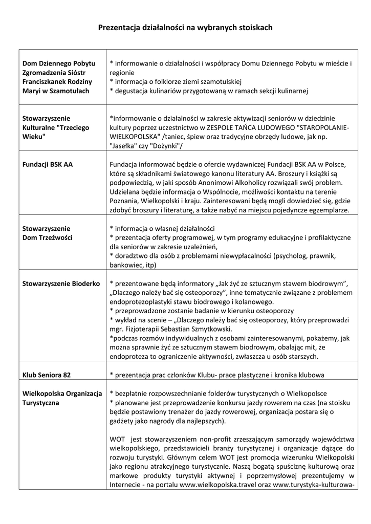 Prezentacja działalności na wybranych stoiskach Dom Dziennego Pobytu Zgromadzenia Sióstr Franciszkanek Rodziny Maryi w Szamotułach * informowanie o działalności i współpracy Domu Dziennego Pobytu w mieście i regionie * informacja o folklorze ziemi szamotulskiej * degustacja kulinariów przygotowaną w ramach sekcji kulinarnej Stowarzyszenie Kulturalne "Trzeciego Wieku" *informowanie o działalności w zakresie aktywizacji seniorów w dziedzinie kultury poprzez uczestnictwo w ZESPOLE TAŃCA LUDOWEGO "STAROPOLANIEWIELKOPOLSKA" /taniec, śpiew oraz tradycyjne obrzędy ludowe, jak np. "Jasełka" czy "Dożynki"/ Fundacji BSK AA Fundacja informować będzie o ofercie wydawniczej Fundacji BSK AA w Polsce, które są składnikami światowego kanonu literatury AA. Broszury i książki są podpowiedzią, w jaki sposób Anonimowi Alkoholicy rozwiązali swój problem. Udzielana będzie informacja o Wspólnocie, możliwości kontaktu na terenie Poznania, Wielkopolski i kraju. Zainteresowani będą mogli dowiedzieć się, gdzie zdobyć broszury i literaturę, a także nabyć na miejscu pojedyncze egzemplarze. Stowarzyszenie Dom Trzeźwości * informacja o własnej działalności * prezentacja oferty programowej, w tym programy edukacyjne i profilaktyczne dla seniorów w zakresie uzależnień, * doradztwo dla osób z problemami niewypłacalności (psycholog, prawnik, bankowiec, itp) Stowarzyszenie Bioderko * prezentowane będą informatory „Jak żyć ze sztucznym stawem biodrowym”, „Dlaczego należy bać się osteoporozy”, inne tematycznie związane z problemem endoprotezoplastyki stawu biodrowego i kolanowego. * przeprowadzone zostanie badanie w kierunku osteoporozy * wykład na scenie – „Dlaczego należy bać się osteoporozy, który przeprowadzi mgr. Fizjoterapii Sebastian Szmytkowski. *podczas rozmów indywidualnych z osobami zainteresowanymi, pokażemy, jak można sprawnie żyć ze sztucznym stawem biodrowym, obalając mit, że endoproteza to ograniczenie aktywności, zwłaszcza u osób starszych. Klub Seniora 82 * prezentacja prac członków Klubu- prace plastyczne i kronika klubowa Wielkopolska Organizacja Turystyczna * bezpłatnie rozpowszechnianie folderów turystycznych o Wielkopolsce * planowane jest przeprowadzenie konkursu jazdy rowerem na czas (na stoisku będzie postawiony trenażer do jazdy rowerowej, organizacja postara się o gadżety jako nagrody dla najlepszych). WOT jest stowarzyszeniem non-profit zrzeszającym samorządy województwa wielkopolskiego, przedstawicieli branży turystycznej i organizacje dążące do rozwoju turystyki. Głównym celem WOT jest promocja wizerunku Wielkopolski jako regionu atrakcyjnego turystycznie. Naszą bogatą spuściznę kulturową oraz markowe produkty turystyki aktywnej i poprzemysłowej prezentujemy w Internecie - na portalu www.wielkopolska.travel oraz www.turystyka-kulturowa- Prezentacja działalności na wybranych stoiskach wlkp.pl, jak również podczas wystąpień targowych w kraju i zagranicą oraz w kilkudziesięciu tytułach wydawniczych. Stowarzyszenie Instytut Zachodni i działające w jego ramach Regionalne Centrum Informacji Europejskiej * działania informacyjne na temat realizowanych projektów i możliwości udziału w nich organizacji pozarządowych, * działania informacyjne na temat członkostwa Polski w UE, w tym dostępnych funduszy WZW PKPS w Poznaniu * informacja o działalności Polskiego Komitetu Pomocy Społecznej * doradztwo w zakresie sposobów , rodzajów i miejsc uzyskania pomocy w sytuacjach kryzysowych dotyczących osób starszych * poradnictwo w zakresie radzenia sobie z chorą osobą starszą w domu * konsultacje w zakresie sprawowania usług opiekuńczych i specjalistycznych usług opiekuńczych w domu podopiecznego PKPS * sprzedaż prac artystycznych wykonanych przez seniorów z DDPS Nr 6 mbU Poznań * działalność informacyjna * co godzinę losowanie małych upominków, z logo naszego mbU * będzie też obecna wizażystka która, będzie służyła radą i wykonywała makijaże Stowarzyszenia "Magnolia" *podniesienie świadomości na temat regularnych badań cytologicznych. Podtekstem w naszej obecności na targach jest oswojenie tematu chorób onkologiczno-ginekologicznych. Rak piersi poprzez działania Amazonek stał się tematem powszechni znanym. Temat chorób onkologiczno-ginekologicznych jest nadal tematem bardzo wstydliwym. WZINR * informacje o działalności własnej organizacji Polskie Stowarzyszenie Protetyków Słuchu * promocja kampanii społecznej „Usłyszeć Świat – usłysz wszystkie rodzaje dźwięków”, * będziemy rozdawać bezpłatną gazetę, wydaną w ramach kampanii * ulotki informacyjne dla pacjentów * zaprezentujemy film pokazujący zagrożenia dla słuchu oraz możliwości dostępnych urządzeń wspomagających słyszenie * przeprowadzimy badanie Słuchu w podstawionym „Audiobusie” Klub Seniora "U Salezjanów" *informowanie o działalności klubu tj. przedstawienie stałej działalności klubu w okresie jesienno - wiosennym (zajęcia stałe oraz spotkania cykliczne) oraz działalność w okresie letnim - wycieczki, spacery, wczasy Europe Direct - Poznan * informowanie o działalności Europe Direct -Poznan * rozpowszechnianie broszury dot. różnych zagadnień dot. Unii Europejskiej * prowadzenie konkursów z wiedzy o Unii Europejskiej Prezentacja działalności na wybranych stoiskach Fundacja na rzecz Osób w Wieku Emerytalnym *informację o działalności własnej organizacji Inkubator Dojrzałej Przedsiębiorczości, organizowanym przez Fundację Promocji Inicjatyw Społecznych POLPROM *informowanie o działalności Inkubatora i organizacjach, które go prowadzą (Fundacja POLPROM i Fundacja "Fundusz Współpracy"). Nasi przedstawiciele będą również udzielać porad/konsultacji w zakresie organizacji szkoleń/doradztwa dla osób 50+ oraz aktywizacji zawodowej poprzez rozwój przedsiębiorczości osób 50+. Polskie Stowarzyszenie Nordic Walking St