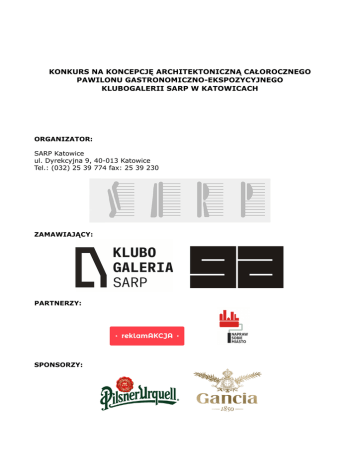 KONKURS NA KONCEPCJĘ ARCHITEKTONICZNĄ CAŁOROCZNEGO PAWILONU GASTRONOMICZNO-EKSPOZYCYJNEGO KLUBOGALERII SARP W KATOWICACH ORGANIZATOR: SARP Katowice ul. Dyrekcyjna 9, 40-013 Katowice Tel.: (032) 25 39 774 fax: 25 39 230 ! ZAMAWIAJĄCY: PARTNERZY: ! SPONSORZY: ! ! ! Spis treści: 1.Założenia 1.1. 1.2. 1.3. 1.4. 1.5 konkursu Rodzaj i forma konkursu. Cel konkursu. Stan istniejący. Obowiązujący zakres opracowania. Kryteria oceny. 2.Nagroda 3.Formalne zasady przeprowadzania konkursu: 3.1. Dane organizacyjne. 3.2. Podstawa prawna. 3.3. Prawa autorskie. 3.4. Sposób opracowania prac konkursowych. 3.5. Składanie prac. 3.6. Kwalifikacja prac do grupy „N” i „O”. 3.7. Sędziowie konkursu – jury. 3.8. Terminy konkursu. 3.9. Zgłaszanie pytań i udzielanie odpowiedzi. 3.10. Wykaz materiałów dostarczonych uczestnikom konkursu oraz wskazanie załączników dostępnych na stronie internetowej. 3.11. Sposób pozyskania warunków konkursu. 1. 1.1. Założenia konkursu Rodzaj i forma konkursu: - ogólnopolski, - dla studentów i absolwentów: akademii sztuk pięknych, wydziałów architektury politechnik, prywatnych szkół architektonicznych - pracowni architektonicznych 1.2. Cel konkursu. Galeria Architektury SARP, Stowarzyszenie Architektów Polskich o. Katowice oraz KluboGaleria działająca w siedzibie Stowarzyszenia poszukują: Koncepcji architektonicznej całorocznego Pawilonu gastronomicznoekspozycyjnego. Istotne jest, aby zaprojektowany Pawilon stał się ważnym punktem na mapie kulturalnej Miasta. Pawilon powinien zachęcać przechodniów do spędzenia czasu w KluboGalerii, zapraszać do wejścia do lokalu, być wizytówką zarówno dla działalności kulturalnej jak i komercyjnej KluboGalerii. Niezbędnym warunkiem konkursu jest zachowanie jak największej przestrzeni dla kontynuacji podstawowej aktywności Galerii Architektury SARP, harmonijnego połączenie i segregacja wszystkich zdarzeń mających miejsce w przestrzeni Galerii z maksymalnym wykorzystaniem możliwości ekspozycyjnych nowego pawilonu. Większa część spotkań i prelekcji odbywa się na parterze budynku czyli w części dostępnej „z ulicy”. Planowany pawilon powinien poszerzyć możliwości dla prowadzonej przez SARP i KluboGalerię działalności dając jednocześnie szansę na funkcjonowanie niezależne od wydarzeń wewnątrz lokalu (w budynku). 1.3. Stan istniejący: Lokal znajduje się na parterze budynku przy ul. Dyrekcyjnej 9. Budynek został wzniesiony na początku wieku i był wielokrotnie przebudowywany, przy czym najpoważniejsze przeróbki parteru miały miejsce w 1925 roku, kiedy to dla potrzeb Banku Francusko – Polskiego wykonano istniejące do dziś słupy o konstrukcji stalowej, uwalniając przestrzeń parteru od ścian nośnych. Na przełomie 2003-2004 wykonane zostały prace modernizacyjne wnętrz i adaptacja na Galerię Architektury SARP. Z pierwotnego wystroju zachowane zostały: plafon części wejściowej, sztukateria sufitów, a także marmurowe okładziny słupów i pilastrów. Posadzka wykonana została z betonu artystycznego w kolorze grafitowym. W roku 2005 zrealizowany został konkurs na „Aranżację Galerii Architektury SARP oraz projekt baru”. Zadania postawione ówcześnie uczestnikom konkursu pozostają aktualne. W Galerii Architektury SARP prowadzone są różnorodne aktywności środowiska architektonicznego. Należy je kontynuować: 1. wystawy stałe i czasowe prezentujące twórczość architektoniczną i urbanistyczną, 2. wystawy i dyskusje związane z konkursami architektonicznymi i urbanistycznymi, 3. uroczystości (przyznawanie nagród, odznaczeń) związane z architektonicznym życiem miasta i regionu, 4. spotkania i dyskusje poświęcone aktualnym problemom polityki przestrzennej i architektury miasta, 5. prelekcje i prezentacje dla młodzieży szkolnej i akademickiej, 6. projekcje filmów video o architekturze. Od tego momentu, oprócz zadań o charakterze popularyzowania szeroko pojętej problematyki architektonicznej, równolegle do Galerii funkcjonował Archibar, pełniący funkcję cafe-baru. W roku 2015 wnętrza przeszły kolejny gruntowny remont, a Archibar został zastąpiony KluboGalerią SARP, rozszerzając swoją działalność o funkcję gastronomiczną, organizację imprez muzycznych i in. W lokalu kontynuowana jest cała dotychczasowa działalność Galerii Architektury. Planowana jest adaptacja części podziemnej budynku na dodatkowe pomieszczenia klubowe. Jednym z realizowanych obecnie działań jest planowane na Maj 2016 roku otwarcie Pawilonu gastronomicznoekspozycyjnego, którego projekt jest przedmiotem niniejszego konkursu. 1.4. Obowiązujący zakres opracowania: - opracowanie rzutu Pawilonu prezentującego jego układ funkcjonalny i położenie względem budynku przy ul. Dyrekcyjnej 9 (siedziby SARP i KluboGalerii) - zaproponowanie koncepcji wyglądu pawilonu w kontekście ulicy i otaczających budynków - zaproponowanie rozwiązań konstrukcyjnych i materiałowych na przekrojach i detalach - zachowanie podstawowej aktywności KluboGalerii, umożliwiając jej niezależne od Pawilonu funkcjonowanie - szczegółowy opis wraz z materiałami użytymi do wykonania Pawilonu, kolorystykę, miejsce i sposób umieszczania logotypów sponsorów i KluboGalerii, informacji dotyczących wyposażenia, mebli itp. elementów mających wpływ na ogólny wizualny odbiór Pawilonu z zewnątrz oraz wewnątrz Schemat zakresu opracowania zostaje określony w załączniku graficznym do Warunków konkursu. 1.4.1 Wytyczne funkcjonalno-przestrzenne. - powierzchnia będąca fragmentem ciągu pieszego o szerokości 4,5m (z zawężeniem w części barowej do 3m na długości 2m) i długości równej elewacji KluboGalerii SARP (13,0m z wejściem) – podkład w formacie PDF i DWG stanowi załącznik do Regulaminu - zapewnienie maksymalnie dużej liczby miejsc siedzących wewnątrz Pawilonu. Zgodnie z analizą optymalna ilość oczekiwana przez Zamawiającego w