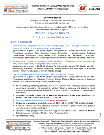 CENTRUM INNOWACJI - AKCELERATOR TECHNOLOGII FUNDACJA UNIWERSYTETU ŁÓDZKIEGO ZAPROSZENIE Centrum Innowacji – Akcelerator Technologii Fundacja Uniwersytetu Łódzkiego zaprasza przedsiębiorców z sektorów kreatywnych, ICT, nowych mediów na bezpłatne szkolenia, z cyklu: WYKREUJ SWÓJ BIZNES 2, 3, 4 października 2012 w Łodzi TEMATY SZKOLEŃ 1. Finansowanie projektów z sektorów kreatywnych, ICT, nowych mediów - jak pozyskać kapitał na ich realizację od inwestorów. 2 października, w godz. 13:00-17:00, Wydział Zarządzania UŁ, Matejki 22/26 Łódź, sala 111 Prowadzący szkolenie: Piotr Berliński, Łukasz Felsztukier – przedstawiciele funduszu zalążkowego StartMoney zarządzanego przez Fundację UŁ Akcelerator Technologii, finansującego pomysłodawców i przedsiębiorstwa we wdrożeniu pomysłów na biznes i innowacji 2. Nowoczesne trendy w designie internetowym - Doświadczenie użytkownika (UX, user experience) w projektowaniu interakcji. 3 października, w godz. 13:00-17:00, Wydział Zarządzania UŁ, Matejki 22/26 Łódź, sala 111 Prowadzący szkolenie: dr Marcin Składanek, Zakład Mediów Elektronicznych w Katedrze Mediów i Kultury Audiowizualnej Uniwersytetu Łódzkiego 3. Gry jako interaktywne formy promocji idei, produktów i usług. 4 października, w godz. 13:00-17:00, Wydział Zarządzania UŁ, Matejki 22/26 Łódź, sala 111 Prowadzący szkolenie: dr Katarzyna Prajzner, Zakład Mediów Elektronicznych w Katedrze Mediów i Kultury Audiowizualnej Uniwersytetu Łódzkiego Na szkolenia zapraszamy przedsiębiorców i pracowników firm. W każdym szkoleniu można uczestniczyć niezależnie od pozostałych szkoleń. Udział w szkoleniu jest bezpłatny (koszt szkolenia jest dofinansowany ze środków UE, w ramach projektu First Motion, z programu Baltic Sea Region). Wszystkie szkolenia odbędą się na Wydziale Zarządzania Uniwersytetu Łódzkiego, ul. Matejki 22/26, Łódź - w sali 111, w godz. 13:00-17:00 Zapisy na szkolenia odbywają się na www.startmoney.pl Kontakt do organizatora: Maria Głowacka, tel. 42 635 49 84, 669 561 710, [email protected] W ramach szkoleń uczestnicy otrzymują materiały szkoleniowe, przewidziana jedna przerwa Elektronicznych (w Katedrze Mediów i Kultury Audiowizualnej) Opis szkoleń poniżej Strona Szkolenia zostały przygotowane przez Fundację we współpracy z UŁ - Zakładem Mediów 1 networkingowa (w tym kawa i kanapki) Centrum Innowacji – Akcelerator Technologii Fundacja Uniwersytetu Łódzkiego Fundusz zalążkowy StartMoney zarządzany przez Fundację oferuje kapitał dla pomysłodawców oraz firm na realizację pomysłów biznesowych ul. J. Matejki 21/23, 90-237 Łódź, tel. + 48 (42) 635 4983, 635 4984, fax: 635 4985 www.ciat.uni.lodz.pl z www.startmoney.pl z e-mail: [email protected] KRS: 0000283917 z REGON: 100383305 z NIP: 7251952859 CENTRUM INNOWACJI - AKCELERATOR TECHNOLOGII FUNDACJA UNIWERSYTETU ŁÓDZKIEGO OPIS SZKOLEŃ 1. Finansowanie projektów z sektorów kreatywnych, ICT i nowych mediów - jak pozyskać kapitał na ich realizację od inwestorów. 2 października, w godz. 13:00-17:00, Wydział Zarządzania UŁ, Matejki 22/26 Łódź, sala 111 W ramach szkolenia zostaną poruszone następujące zagadnienia: Z zakresu planowania biznesu i przygotowania biznes planu: Czy mój pomysł jest dobry – jak go ocenić z zaprezentować Skąd się biorą pieniądze w firmie? Jak planować przychody. Modele biznesowe w biznesie nowych technologii Analiza założeń biznesowych (jak liczba użytkowników, konwersja, obliczanie przychodów, określanie ryzyka, scenariusze rozwoju) Znaczenie technologii vs znaczenie rynku dla sukcesu biznesu Pozyskiwanie finansowania na start: Jak pozyskać finansowanie na nowy biznes w branży nowych technologii? Rodzaje finansowania, wady i zalety każdego z nich. Jakich błędów nie popełniać - jakie pułapki czyhają na pomysłodawcę, który opracowuje pomysł? Uczestnicy szkoleń przeanalizują 3 studia przypadków z branży nowych technologii i przedyskutują wyniki analizy z przedstawicielami funduszu zalążkowego StartMoney. Trenerzy: Piotr Berliński Ekspert i analityk funduszu inwestycyjnego StartMoney prowadzonego przez Akcelerator Technologii Fundację Uniwersytetu Łódzkiego; menedżer projektów; trener z zakresu finansowania i przedsiębiorczości; praktyk biznesu – od kilku lat prowadzi własną firmę. Łukasz Felsztukier Ekspert i analityk funduszu inwestycyjnego StartMoney prowadzonego przez Akcelerator Technologii Fundację Uniwersytetu Łódzkiego; odpowiada za ocenę zgłaszanych projektów pod kątem innowacyjności i zastosowanych technologii; autor licznych publikacji prasowych z zakresu wykorzystania technologii w biznesie oraz marketingu internetowego; prowadzi firmę z obszaru technologii mobilnych. Strona 3 października, w godz. 13:00-17:00, Wydział Zarządzania UŁ, Matejki 22/26 Łódź, sala 111 Szkolenie będzie poświęcone zagadnieniom związanym z grami komputerowymi, rozumianymi jako nowe formy komunikacji. Z uwagi na interaktywność gier komputerowych, ich wymiar perswazyjny ma odmienny charakter od tego, z którym mamy do czynienia w przypadku tradycyjnych form komunikacji. W ramach szkolenia zostaną poruszone następujące zagadnienia: Gra jako forma reklamy Alternate Reality Games - kampanie reklamowe "The Beast" i Tymbark Promocja w postaci gry komputerowej: kampania marki Zozole; gry promujące Pragę i Galerię Zachęta Gra jako forma komunikacji między instytucjami a społeczeństwem. America's Army - gra wydana przez Armię Stanów Zjednoczonych Perswazja w grach komputerowych 2 2. Gry jako interaktywne formy promocji idei, produktów i usług. Centrum Innowacji – Akcelerator Technologii Fundacja Uniwersytetu Łódzkiego Fundusz zalążkowy StartMoney zarządzany przez Fundację oferuje kapitał dla pomysłodawców oraz firm na realizację pomysłów biznesowych ul. J. Matejki 21/23, 90-237 Łódź, tel. + 48 (42) 635 4983,