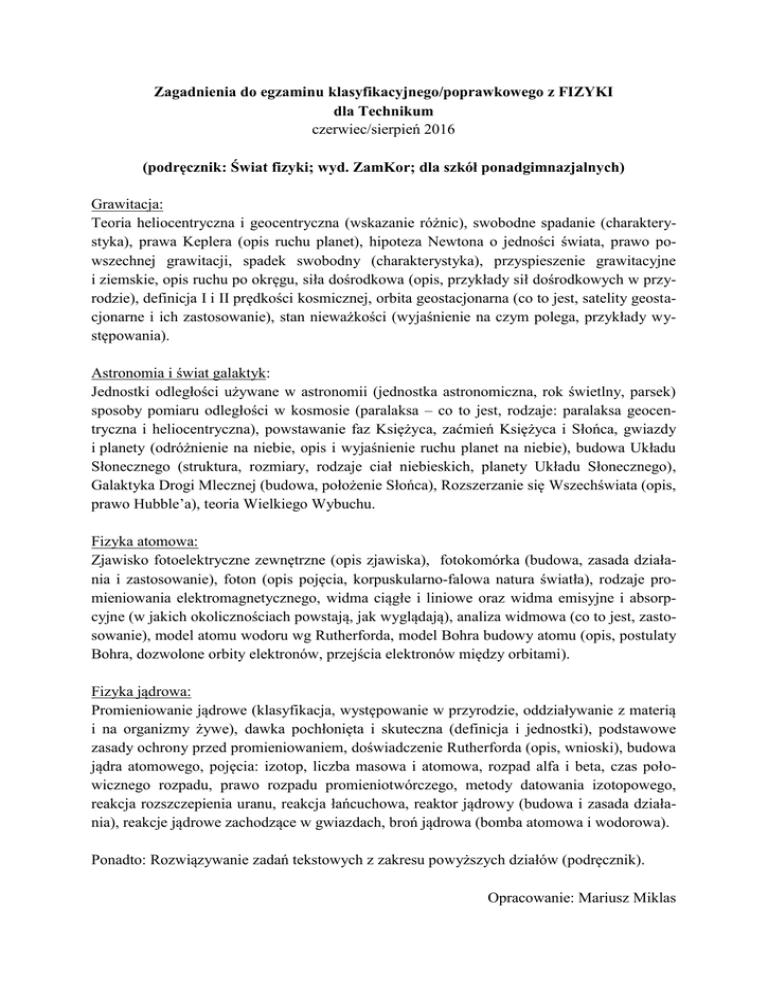 Zagadnienia do egzaminu klasyfikacyjnego/poprawkowego z FIZYKI dla Technikum czerwiec/sierpień 2016 (podręcznik: Świat fizyki; wyd. ZamKor; dla szkół ponadgimnazjalnych) Grawitacja: Teoria heliocentryczna i geocentryczna (wskazanie różnic), swobodne spadanie (charakterystyka), prawa Keplera (opis ruchu planet), hipoteza Newtona o jedności świata, prawo powszechnej grawitacji, spadek swobodny (charakterystyka), przyspieszenie grawitacyjne i ziemskie, opis ruchu po okręgu, siła dośrodkowa (opis, przykłady sił dośrodkowych w przyrodzie), definicja I i II prędkości kosmicznej, orbita geostacjonarna (co to jest, satelity geostacjonarne i ich zastosowanie), stan nieważkości (wyjaśnienie na czym polega, przykłady występowania). Astronomia i świat galaktyk: Jednostki odległości używane w astronomii (jednostka astronomiczna, rok świetlny, parsek) sposoby pomiaru odległości w kosmosie (paralaksa – co to jest, rodzaje: paralaksa geocentryczna i heliocentryczna), powstawanie faz Księżyca, zaćmień Księżyca i Słońca, gwiazdy i planety (odróżnienie na niebie, opis i wyjaśnienie ruchu planet na niebie), budowa Układu Słonecznego (struktura, rozmiary, rodzaje ciał niebieskich, planety Układu Słonecznego), Galaktyka Drogi Mlecznej (budowa, położenie Słońca), Rozszerzanie się Wszechświata (opis, prawo Hubble’a), teoria Wielkiego Wybuchu. Fizyka atomowa: Zjawisko fotoelektryczne zewnętrzne (opis zjawiska), fotokomórka (budowa, zasada działania i zastosowanie), foton (opis pojęcia, korpuskularno-falowa natura światła), rodzaje promieniowania elektromagnetycznego, widma ciągłe i liniowe oraz widma emisyjne i absorpcyjne (w jakich okolicznościach powstają, jak wyglądają), analiza widmowa (co to jest, zastosowanie), model atomu wodoru wg Rutherforda, model Bohra budowy atomu (opis, postulaty Bohra, dozwolone orbity elektronów, przejścia elektronów między orbitami). Fizyka jądrowa: Promieniowanie jądrowe (klasyfikacja, występowanie w przyrodzie, oddziaływanie z materią i na organizmy żywe), dawka pochłonięta i skuteczna (definicja i jednostki), podstawowe zasady ochrony przed promieniowaniem, doświadczenie Rutherforda (opis, wnioski), budowa jądra atomowego, pojęcia: izotop, liczba masowa i atomowa, rozpad alfa i beta, czas połowicznego rozpadu, prawo rozpadu promieniotwórczego, metody datowania izotopowego, reakcja rozszczepienia uranu, reakcja łańcuchowa, reaktor jądrowy (budowa i zasada działania), reakcje jądrowe zachodzące w gwiazdach, broń jądrowa (bomba atomowa i wodorowa). Ponadto: Rozwiązywanie zadań tekstowych z zakresu powyższych działów (podręcznik). Opracowanie: Mariusz Miklas