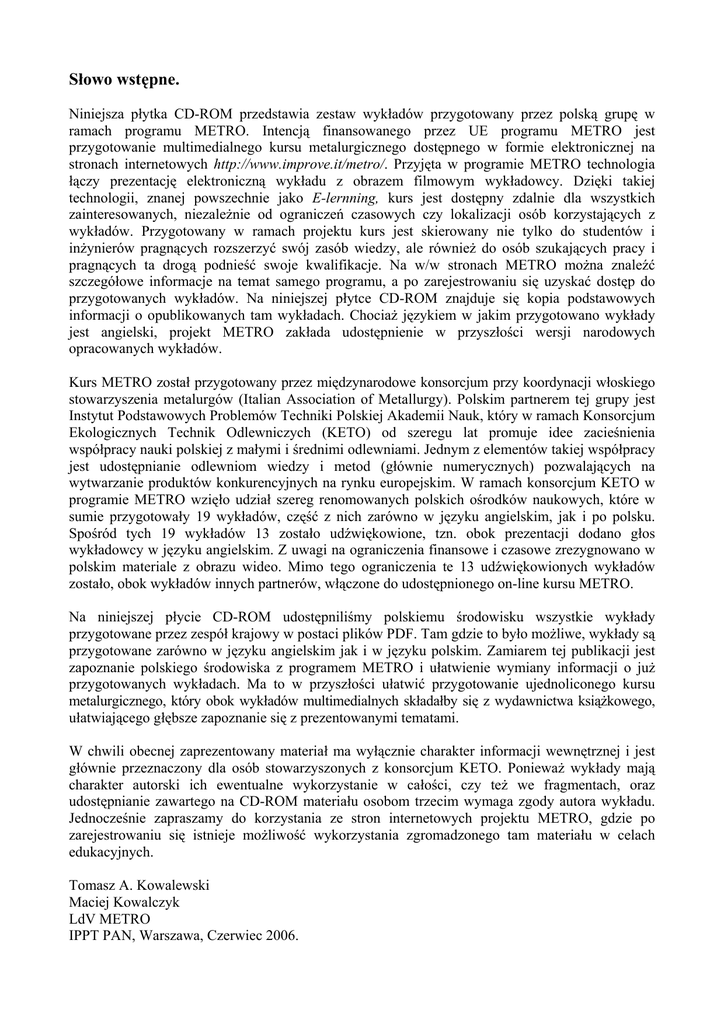 Słowo wstępne. Niniejsza płytka CD-ROM przedstawia zestaw wykładów przygotowany przez polską grupę w ramach programu METRO. Intencją finansowanego przez UE programu METRO jest przygotowanie multimedialnego kursu metalurgicznego dostępnego w formie elektronicznej na stronach internetowych http://www.improve.it/metro/. Przyjęta w programie METRO technologia łączy prezentację elektroniczną wykładu z obrazem filmowym wykładowcy. Dzięki takiej technologii, znanej powszechnie jako E-lernning, kurs jest dostępny zdalnie dla wszystkich zainteresowanych, niezależnie od ograniczeń czasowych czy lokalizacji osób korzystających z wykładów. Przygotowany w ramach projektu kurs jest skierowany nie tylko do studentów i inżynierów pragnących rozszerzyć swój zasób wiedzy, ale również do osób szukających pracy i pragnących ta drogą podnieść swoje kwalifikacje. Na w/w stronach METRO można znaleźć szczegółowe informacje na temat samego programu, a po zarejestrowaniu się uzyskać dostęp do przygotowanych wykładów. Na niniejszej płytce CD-ROM znajduje się kopia podstawowych informacji o opublikowanych tam wykładach. Chociaż językiem w jakim przygotowano wykłady jest angielski, projekt METRO zakłada udostępnienie w przyszłości wersji narodowych opracowanych wykładów. Kurs METRO został przygotowany przez międzynarodowe konsorcjum przy koordynacji włoskiego stowarzyszenia metalurgów (Italian Association of Metallurgy). Polskim partnerem tej grupy jest Instytut Podstawowych Problemów Techniki Polskiej Akademii Nauk, który w ramach Konsorcjum Ekologicznych Technik Odlewniczych (KETO) od szeregu lat promuje idee zacieśnienia współpracy nauki polskiej z małymi i średnimi odlewniami. Jednym z elementów takiej współpracy jest udostępnianie odlewniom wiedzy i metod (głównie numerycznych) pozwalających na wytwarzanie produktów konkurencyjnych na rynku europejskim. W ramach konsorcjum KETO w programie METRO wzięło udział szereg renomowanych polskich ośrodków naukowych, które w sumie przygotowały 19 wykładów, część z nich zarówno w języku angielskim, jak i po polsku. Spośród tych 19 wykładów 13 zostało udźwiękowione, tzn. obok prezentacji dodano głos wykładowcy w języku angielskim. Z uwagi na ograniczenia finansowe i czasowe zrezygnowano w polskim materiale z obrazu wideo. Mimo tego ograniczenia te 13 udźwiękowionych wykładów zostało, obok wykładów innych partnerów, włączone do udostępnionego on-line kursu METRO. Na niniejszej płycie CD-ROM udostępniliśmy polskiemu środowisku wszystkie wykłady przygotowane przez zespół krajowy w postaci plików PDF. Tam gdzie to było możliwe, wykłady są przygotowane zarówno w języku angielskim jak i w języku polskim. Zamiarem tej publikacji jest zapoznanie polskiego środowiska z programem METRO i ułatwienie wymiany informacji o już przygotowanych wykładach. Ma to w przyszłości ułatwić przygotowanie ujednoliconego kursu metalurgicznego, który obok wykładów multimedialnych składałby się z wydawnictwa książkowego, ułatwiającego głębsze zapoznanie się z prezentowanymi tematami. W chwili obecnej zaprezentowany materiał ma wyłącznie charakter informacji wewnętrznej i jest głównie przeznaczony dla osób stowarzyszonych z konsorcjum KETO. Ponieważ wykłady mają charakter autorski ich ewentualne wykorzystanie w całości, czy też we fragmentach, oraz udostępnianie zawartego na CD-ROM materiału osobom trzecim wymaga zgody autora wykładu. Jednocześnie zapraszamy do korzystania ze stron internetowych projektu METRO, gdzie po zarejestrowaniu się istnieje możliwość wykorzystania zgromadzonego tam materiału w celach edukacyjnych. Tomasz A. Kowalewski Maciej Kowalczyk LdV METRO IPPT PAN, Warszawa, Czerwiec 2006.