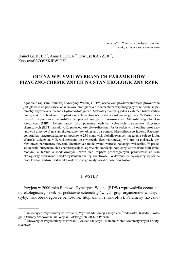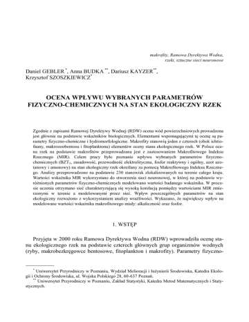 makrofity, Ramowa Dyrektywa Wodna, rzeki, sztuczne sieci neuronowe Daniel GEBLER *, Anna BUDKA **, Dariusz KAYZER**, Krzysztof SZOSZKIEWICZ* OCENA WPŁYWU WYBRANYCH PARAMETRÓW FIZYCZNO-CHEMICZNYCH NA STAN EKOLOGICZNY RZEK Zgodnie z zapisami Ramowej Dyrektywy Wodnej (RDW) ocena wód powierzchniowych prowadzona jest głównie na podstawie wskaźników biologicznych. Elementami wspomagającymi tę ocenę są parametry fizyczno-chemiczne i hydromorfologiczne. Makrofity stanowią jeden z czterech (obok ichtiofauny, makrozoobentosu i fitoplanktonu) elementów oceny stanu ekologicznego rzek. W Polsce ocena rzek na podstawie makrofitów przeprowadzana jest z zastosowaniem Makrofitowego Indeksu Rzecznego (MIR). Celem pracy było poznanie wpływu wybranych parametrów fizycznochemicznych (BZT5, zasadowość, przewodność elektrolityczna, fosfor reaktywny i ogólny, azot azotanowy i amonowy) na stan ekologiczny rzek określany za pomocą Makrofitowego Indeksu Rzecznego. Analizy przeprowadzono na podstawie 230 stanowisk zlokalizowanych na terenie całego kraju. Wartości wskaźnika MIR wykorzystano do stworzenia sieci neuronowej, w której na podstawie wyróżnionych parametrów fizyczno-chemicznych modelowano wartości badanego wskaźnika. W procesie uczenia otrzymano sieć charakteryzującą się wysoką korelacją pomiędzy wartościami MIR zmierzonymi w terenie a modelowanymi przez sieć. Wpływ poszczególnych parametrów na stan ekologiczny rozważono z wykorzystaniem analizy wrażliwości. Wykazano, że największy wpływ na modelowane wartości wskaźnika makrofitowego miały: alkaliczność oraz fosfor. 1. WSTĘP Przyjęta w 2000 roku Ramowa Dyrektywa Wodna (RDW) wprowadziła ocenę stanu ekologicznego rzek na podstawie czterech głównych grup organizmów wodnych (ryby, makrobezkręgowce bentosowe, fitoplankton i makrofity). Parametry fizyczno__________ * Uniwersytet Przyrodniczy w Poznaniu, Wydział Melioracji i Inżynierii Środowiska, Katedra Ekologii i Ochrony Środowiska, ul. Wojska Polskiego 28, 60-637 Poznań. ** Uniwersytet Przyrodniczy w Poznaniu, Zakład Statystyki, Katedra Metod Matematycznych i Statystycznych. 182 D. GEBLER i in. chemiczne, na podstawie których w przeszłości opierała się ocena wód powierzchniowych, funkcjonują obecnie jako elementy wspomagające ocenę biologiczną [2]. W monitoringu środowiska prowadzonym w naszym kraju ocenę stanu ekologicznego rzek pod względem makrofitów wykonuje się w oparciu o Makrofitowy Indeks Rzeczny (MIR) [3].Wskaźnik ten wskazuje na stopień degradacji ekosystemów rzecznych substancjami biogennymi, a w szczególności fosforanami [14]. Do analizy danych ekologicznych wykorzystywane są narzędzia statystyki matematycznej. Obecnie coraz szerzej stosowane są metody sztucznej inteligencji, w szczególności sztuczne sieci neuronowe. Metody te symulują działanie komórki mózgowej i są one zdolne do odwzorowania najbardziej skomplikowanych procesów, w których klasyczne modele regresji nie znajdują zastosowania. Wykorzystanie sieci neuronowych w modelowaniu procesów ekologicznych było przedmiotem wielu badań [7]. Wielokrotnie stosowano je w badaniach różnych typów ekosystemów wodnych [4,6]. W odniesieniu do wodnych organizmów roślinnych sieci neuronowe były wykorzystywane głównie w badaniach nad fitoplanktonem [6,15]. Nie była podejmowana dotychczas próba wykorzystania sztucznych sieci neuronowych w odniesieniu do makrofitów. Celem niniejszej pracy było przetestowanie możliwości predykcji wartości Makrofitowego Indeksu Rzecznego w oparciu o parametry fizyczno-chemiczne wody oraz ocena wpływu poszczególnych parametrów na wskaźnik MIR. Sztuczne sieci neuronowe zostały użyte jako narzędzie realizacji powyższych założeń. 2. MATERIAŁY I METODY Badania terenowe prowadzono w sezonach wegetacyjnych w latach 2007-2009 na 230 docinkach rzek zlokalizowanych na obszarze całego kraju. Analizowane stanowiska reprezentowały szeroki gradient warunków ekologicznych polskich rzek. Na każdym stanowisku wykonano badania roślinności wodnej oraz analizy jakości wody. Badania botaniczne przeprowadzono w oparciu o Makrofitową Metodę Oceny Rzek [14]. Polega ona na jakościowej i ilościowej (w 9-stoniowen skali pokrycia) inwentaryzacji roślinności wodnej w obrębie 100 m odcinka badawczego. Na podstawie zebranych w formularzu terenowym danych wylicza się Makrofitowy Indeks Rzeczny (MIR). Wykorzystuje on 153 taksony (103 rośliny nasienne, 3 paprotniki, 20 mchów, 10 wątrobowców i 17 glonów), którym przypisane są dwie liczby wskaźnikowe: L i W. Liczba wartości wskaźnikowej (L) wskazuje na poziom trofii środowiska, w którym dany takson występuje. Jej wartości rozciągają się w przedziale od 1 (hipertrofia) do 10 (oligotrofia). Współczynnik wagowy (W) jest miarą tolerancji ekologicznej poszczególnych taksonów. Przyjmuje on wartości od 1 (gatunki stenotopowe) do 3 (gatunki eurytopowe). MIR wylicza się na podstawie obu liczb wskaźni- Ocena wpływu wybranych parametrów fuzyczno-chemicznych na stan ekologiczny rzek 183 kowych (Li i Wi) oraz pokrycia powierzchni przez dany takson (Pi) (gdzie i odnosi się do poszczególnych gatunków wskaźnikowych odnotowanych w badaniach) zgodnie z wzorem 1: MIR ( Li Wi Pi ) 10 (Wi Pi ) (1) Wskaźnik MIR przyjmuje wartości od 10 w rzekach najbardziej zeutrofizowanych, do 100 w rzekach najmniej zdegradowanych. Badania botaniczne uzupełniono o ocenę parametrów fizyczno-chemicznych. Próbki wody pobierano w terminie badań makrofitowych. Wodę analizowano pod względem następujących parametrów: zasadowość (alkal.), przewodność elektrolityczna (zasad.), fosforany (Preakt.), fosfor ogólny (Pog.), azotany (N-NO3), azot amonowy (N-NH4) oraz biochemiczne zapotrzebowanie na tlen po pięciu dobach (BZT5). Wartości parametrów fizyko–chemicznych oraz MIR analizowane były z użyciem pakietu Automatyczne sieci neuronowe programu STATISTICA [12].