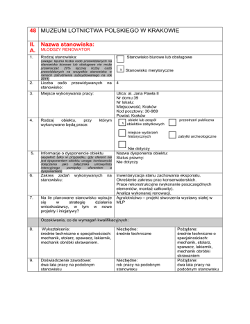 48 MUZEUM LOTNICTWA POLSKIEGO W KRAKOWIE II. Nazwa stanowiska: A. MŁODSZY RENOWATOR 1. Rodzaj stanowiska: Stanowisko biurowe lub obsługowe (uwaga: łączna liczba osób przewidzianych na stanowiska biurowe lub obsługowe nie może przekraczać 20% łącznej liczby osób przewidzianych na wszystkie stanowiska w ramach zatrudnienia subsydiowanego na rok 2011) 2. Liczba osób stanowisko: 3. Miejsce wykonywania pracy: 4. Rodzaj obiektu, przy wykonywane będą prace: 5. przewidywanych na x Stanowisko merytoryczne 4 Ulica: al. Jana Pawła II Nr domu:39 Nr lokalu: Miejscowość; Kraków Kod pocztowy: 30-969 Powiat: Kraków którym Informacje o dysponencie obiektu (wypełnić tylko w przypadku, gdy oferent nie jest dysponentem obiektu; uwaga: konieczność dołączenia jako załącznika umowy/listu intencyjnego pomiędzy oferentem a dysponentem) 6. Zakres zadań stanowisku: wykonywanych na 7. Na ile planowane stanowisko wpisuje się w strategię działania wnioskodawcy, w tym w nowe projekty i inicjatywy? obiekt lub zespół przestrzeń publiczna miejsce wydarzeń historycznych zabytki archeologiczne x obiektów zabytkowych Nie dotyczy Nazwa dysponenta obiektu: Status prawny: Nie dotyczy Inwentaryzacja stanu zachowania eksponatu. Określenie zakresu prac konserwatorskich. Prace rekonstrukcyjne (wykonanie poszczególnych elementów, montaż całkowity). Analiza wykonanej renowacji. Agrolotnictwo – projekt stworzenia wystawy stałej w MLP Oczekiwania, co do wymagań kwalifikacyjnych: 8. Wykształcenie: średnie techniczne o specjalnościach: mechanik, stolarz, spawacz, lakiernik, mechanik obróbki skrawaniem. Niezbędne: średnie techniczne 9. Doświadczenie zawodowe: dwa lata pracy na podobnym stanowisku Niezbędne: rok pracy na podobnym stanowisku Pożądane: średnie techniczne o specjalnościach: mechanik, stolarz, spawacz, lakiernik, mechanik obróbki skrawaniem Pożądane: dwa lata pracy na podobnym stanowisku 10. Umiejętności: manualne, umiejętność czytania dokumentacji technicznej, dokładność, precyzyjność, Niezbędne: manualne, umiejętność czytania dokumentacji technicznej, dokładność 11. Cechy osobowe: dokładność, precyzyjność, sumienność, dążenie do celu, otwartość, umiejętność działania i współpracy w zespole, odpowiedzialność i poszanowanie dla eksponatów powierzonych do pracy Oferta jest kierowana również do osób z niepełnosprawnością Wstępne wymagania dotyczące sprawności kandydata (np. stopień sprawności fizycznej, intelektualnej, wzroku, słuchu, odporność na stres itp.) Umiejętności, które osoba nabędzie na stanowisku: Niezbędne: odpowiedzialność i poszanowanie dla eksponatów powierzonych do pracy 12. 13. 14. Sposób wprowadzenia osoby na stanowisko (szkolenia wewnętrzne, instruktaże): 15. Sposób nadzoru/ monitorowania pracy na stanowisku: 16. Sposób organizacji pracy – czas pracy, np. Czy stanowisko wymaga dyspozycyjności w soboty/ niedzielę/ święta? 17. Czy istnieje możliwość zatrudnienia przez Wnioskodawcę po zatrudnieniu subsydiowanym? W stosunku do ilu osób zgłaszanych na stanowisko objęte niniejszą ofertą Wnioskodawca deklaruje możliwość zatrudnienia. Dodatkowe informacje, które mogą być istotne przy ocenie oferty: 18. Pożądane: manualne, umiejętność czytania dokumentacji technicznej, dokładność, precyzyjność Pożądane: dokładność, precyzyjność, sumienność, dążenie do celu, otwartość, umiejętność działania i współpracy w zespole x Tak Nie Praktyczne poszerzenie wiedzy technicznej w zakresie budowy płatowców, uzbrojenia itp. Poznanie technik naprawy poszyć płóciennych, drewnianych i metalowych w lotnictwie. Szkolenie: p. poż., szkolenie wstępne w dziedzinie BHP ( instruktaż ogólny oraz instruktaż stanowiskowy na stanowisku pracy), szkolenia wewnętrzne przeprowadzone przez opiekuna – Kierownika Działu Konserwacji Muzealiów. Bieżąca kontrola i sprawdzanie efektów i poprawności wykonywania zadań zleconych przez opiekuna – Kierownika Działu Konserwacji Muzealiów. Godziny pracy: 7:30 – 15:30 Dni tygodnia: poniedziałek - piątek Tak x Nie Liczba osób: …. W związku z rozwojem Muzeum w przyszłości istnieje szansa na zatrudnienie pracownika. Zatrudnienie uzależnione jest od wielkości przychodów instytucji, a w szczególności od wzrostu dotacji z województwa małopolskiego oraz uzyskania dotacji na projekty z innych źródeł w tym z MKiDN.