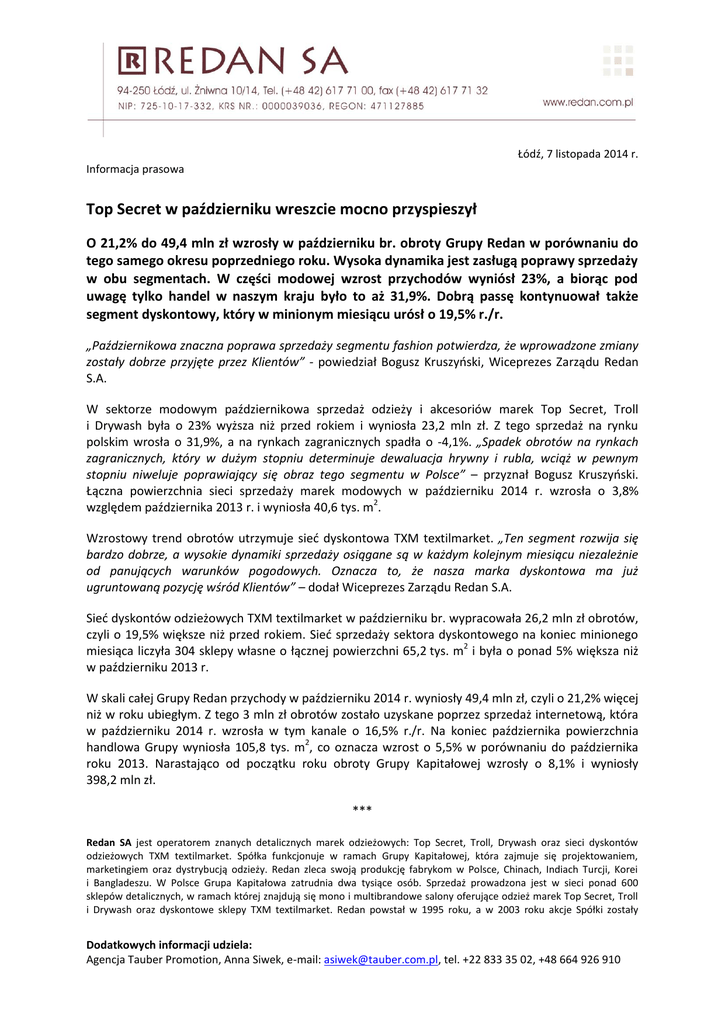 Łódź, 7 listopada 2014 r. Informacja prasowa Top Secret w październiku wreszcie mocno przyspieszył O 21,2% do 49,4 mln zł wzrosły w październiku br. obroty Grupy Redan w porównaniu do tego samego okresu poprzedniego roku. Wysoka dynamika jest zasługą poprawy sprzedaży w obu segmentach. W części modowej wzrost przychodów wyniósł 23%, a biorąc pod uwagę tylko handel w naszym kraju było to aż 31,9%. Dobrą passę kontynuował także segment dyskontowy, który w minionym miesiącu urósł o 19,5% r./r. „Październikowa znaczna poprawa sprzedaży segmentu fashion potwierdza, że wprowadzone zmiany zostały dobrze przyjęte przez Klientów” - powiedział Bogusz Kruszyński, Wiceprezes Zarządu Redan S.A. W sektorze modowym październikowa sprzedaż odzieży i akcesoriów marek Top Secret, Troll i Drywash była o 23% wyższa niż przed rokiem i wyniosła 23,2 mln zł. Z tego sprzedaż na rynku polskim wrosła o 31,9%, a na rynkach zagranicznych spadła o -4,1%. „Spadek obrotów na rynkach zagranicznych, który w dużym stopniu determinuje dewaluacja hrywny i rubla, wciąż w pewnym stopniu niweluje poprawiający się obraz tego segmentu w Polsce” – przyznał Bogusz Kruszyński. Łączna powierzchnia sieci sprzedaży marek modowych w październiku 2014 r. wzrosła o 3,8% względem października 2013 r. i wyniosła 40,6 tys. m2. Wzrostowy trend obrotów utrzymuje sieć dyskontowa TXM textilmarket. „Ten segment rozwija się bardzo dobrze, a wysokie dynamiki sprzedaży osiągane są w każdym kolejnym miesiącu niezależnie od panujących warunków pogodowych. Oznacza to, że nasza marka dyskontowa ma już ugruntowaną pozycję wśród Klientów” – dodał Wiceprezes Zarządu Redan S.A. Sieć dyskontów odzieżowych TXM textilmarket w październiku br. wypracowała 26,2 mln zł obrotów, czyli o 19,5% większe niż przed rokiem. Sieć sprzedaży sektora dyskontowego na koniec minionego miesiąca liczyła 304 sklepy własne o łącznej powierzchni 65,2 tys. m2 i była o ponad 5% większa niż w październiku 2013 r. W skali całej Grupy Redan przychody w październiku 2014 r. wyniosły 49,4 mln zł, czyli o 21,2% więcej niż w roku ubiegłym. Z tego 3 mln zł obrotów zostało uzyskane poprzez sprzedaż internetową, która w październiku 2014 r. wzrosła w tym kanale o 16,5% r./r. Na koniec października powierzchnia handlowa Grupy wyniosła 105,8 tys. m2, co oznacza wzrost o 5,5% w porównaniu do października roku 2013. Narastająco od początku roku obroty Grupy Kapitałowej wzrosły o 8,1% i wyniosły 398,2 mln zł. *** Redan SA jest operatorem znanych detalicznych marek odzieżowych: Top Secret, Troll, Drywash oraz sieci dyskontów odzieżowych TXM textilmarket. Spółka funkcjonuje w ramach Grupy Kapitałowej, która zajmuje się projektowaniem, marketingiem oraz dystrybucją odzieży. Redan zleca swoją produkcję fabrykom w Polsce, Chinach, Indiach Turcji, Korei i Bangladeszu. W Polsce Grupa Kapitałowa zatrudnia dwa tysiące osób. Sprzedaż prowadzona jest w sieci ponad 600 sklepów detalicznych, w ramach której znajdują się mono i multibrandowe salony oferujące odzież marek Top Secret, Troll i Drywash oraz dyskontowe sklepy TXM textilmarket. Redan powstał w 1995 roku, a w 2003 roku akcje Spółki zostały Dodatkowych informacji udziela: Agencja Tauber Promotion, Anna Siwek, e-mail: [email protected], tel. +22 833 35 02, +48 664 926 910 dopuszczone do publicznego obrotu na Giełdzie Papierów Wartościowych w Warszawie. Spółka aktywnie wspiera Fundację „Happy Kids”. Dodatkowych informacji udziela: Agencja Tauber Promotion, Anna Siwek, e-mail: [email protected], tel. +22 833 35 02, +48 664 926 910