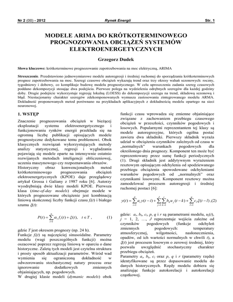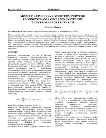 Nr 2 (00) - 2012 Rynek Energii Str. 1 MODELE ARIMA DO KRÓTKOTERMINOWEGO PROGNOZOWANIA OBCIĄŻEŃ SYSTEMÓW ELEKTROENERGETYCZNYCH Grzegorz Dudek Słowa kluczowe: krótkoterminowe prognozowanie zapotrzebowania na moc elektryczną, ARIMA Streszczenie. Przedstawiono jednowymiarowe modele autoregresji i średniej ruchomej do sporządzania krótkoterminowych prognoz zapotrzebowania na moc. Szeregi czasowe obciążeń wykazują trend oraz trzy okresy wahań sezonowych: roczny, tygodniowy i dobowy, co komplikuje budowę modelu prognostycznego. W celu uproszczenia zadania szereg czasowych poddano dekompozycji stosując dwa podejścia. Pierwsze polega na wydzieleniu odrębnych szeregów dla każdej godziny doby. Drugie podejście wykorzystuje regresję lokalną (LOESS) do dekompozycji szeregu na trend, składową sezonową i błąd. Niestacjonarny charakter szeregów zdekomponowanych wymusza zastosowania zintegrowanego modelu ARMA. Dokładność proponowanych metod porównano na przykładach aplikacyjnych z dokładnością modelu opartego na sieci neuronowej. 1. WSTĘP Znaczenie prognozowania obciążeń w bieżącej eksploatacji systemu elektroenergetycznego i funkcjonowaniu rynków energii przekłada się na ogromną liczbę publikacji opisujących modele prognostyczne dedykowane temu problemowi. Obok klasycznych rozwiązań wykorzystujących metody analizy statystycznej, regresji i wygładzania pojawiają się modele oparte na intensywnie ostatnio rozwijanych metodach inteligencji obliczeniowej, uczenia maszynowego czy rozpoznawania obrazów. Historyczny obraz konwencjonalnych metod krótkoterminowego prognozowania obciążeń elektroenergetycznych (KPOE) daje przeglądowy artykuł Grossa i Galiany z 1987 roku [6]. Autorzy wyodrębniają dwie klasy modeli KPOE. Pierwsza klasa (time-of-day models) obejmuje modele w których prognozowane obciążenie jest kombinacją liniową skończonej liczby funkcji czasu fi(t) i białego szumu ξ(t): n P (t ) = ∑ α i f i (t ) + ξ (t ), t ∈ T , (1) i =1 gdzie T jest okresem prognozy (np. 24 h). Funkcje fi(t) są najczęściej sinusoidalne. Parametry modelu (wagi poszczególnych funkcji) można oszacować poprzez regresję liniową w oparciu o dane historyczne. Zaletą tych modeli jest czytelna struktura i prosty sposób aktualizacji parametrów. Wśród wad wymienia się ograniczoną dokładność w odwzorowaniu stochastycznej natury procesu oraz ignorowanie dodatkowych zmiennych objaśniających, np. pogodowych. W drugiej klasie modeli (dymanic models) obok funkcji czasu wprowadza się zmienne objaśniające związane z zachowaniem przebiegu czasowego obciążeń w przeszłości, czynników pogodowych i losowych. Popularnymi reprezentantem tej klasy są modele autoregresyjne, których ogólna postać zawiera dwa składniki. Pierwszy składnik wyraża udział w obciążeniu czynników zależnych od czasu w „normalnych” warunkach pogodowych dla określonego dnia prognozy. Komponent ten może być reprezentowany przez sumę funkcji periodycznych (1). Drugi składnik jest addytywnym wyrażeniem resztowym opisującym odchylenia od spodziewanego przebiegu obciążenia spowodowane odchyleniami warunków pogodowych od „normalnych” oraz czynnikami losowymi. Komponent resztowy można zamodelować procesem autoregresji i średniej ruchomej postaci [6]: p J r q y (t ) = ∑ ai y (t − i) + ∑ ∑ bk u j (t − k ) + ∑ cl ξ (t − l ) ,(2) i =1 j =1 k =1 l =1 gdzie: ai, bk, cl, p, q i r są parametrami modelu, uj(t), j = 1, 2, …, J reprezentuje wejścia zależne od czynników pogodowych (funkcje odchyleń zmiennych pogodowych: temperatury atmosferycznej, wilgotności, nasłonecznienia, opadów, od ich wartości normalnych w chwili t), a ξ(t) jest procesem losowym o zerowej średniej, który pozwala uwzględnić stochastyczny charakter przebiegu obciążeń. Parametry ai, bk, cl oraz p, q i r (parametry rzędu) identyfikowane są przez dopasowanie modelu do danych historycznych. Rzędy modelu dobiera się analizując funkcje autokorelacji i autokorelacji cząstkowej. Str. 2 Rynek Energii Ponieważ szeregi czasowe obciążeń z reguły są niestacjonarne, aby zastosować model autoregresji i średniej ruchomej bezpośrednio do modelowania tych szeregów przekształca się je na stacjonarne poprzez różnicowanie (szeregi zintegrowane). Autoregresyjne modele z powodzeniem stosowane są w KPOE do dzisiaj, często w połączeniu z innymi metodami. Np. w [5] zastosowano periodyczny model autoregresyjny (PAR) rozbijając równanie autoregresji na indywidualne równania dla każdej godziny doby i wprowadzając zmienne egzogeniczne reprezentujące dzień tygodnia, miesiąc kalendarzowy i temperatury atmosferyczne. Dekompozycję modelu autoregresyjnego na poszczególne godziny doby zastosowano także w [12]. Model prognostyczny stanowi tutaj kombinację funkcji sinusoidalnych i reszt modelowanych procesem autoregresyjnym. Dwustopniową procedurę prognostyczną zaproponowano w [10]. W pierwszym kroku usuwa się sezonowości i trend używając metody średniej ruchomej. Otrzymany w wyniku komponent stochastyczny będący realizacją procesu stacjonarnego modeluje się za pomocą metody ARMA. Złożenie prognozy komponentu stochastycznego z trendem i komponentem sezonowym daje prognozę obciążenia. W [2] opisano autoregresyjny model z gładkim przejściem (smooth transition periodic autoregressive – STPAR), gdzie sezonowość wyrażają wagi stojące przy zmiennych opóźnionych. Wagi wyznacza się z sumy funkcji sinusoidalnych o okresach odpowiadających okresowi dobowemu i tygodniowemu. Dodatkowy składnik modelu, wyrażony za pomocą funkcji logistycznej, pozwala uwzględniać nieliniowy wpływ zmiennych egzogenicznych. W [1] do estymacji paramartów modelu autoregresyjnego ze zmiennymi pogodowymi (temperaturą i prędkością wiatru), który konstruowano dla każdej prognozowanej wartości obciążenia godzinowego, użyto filtru Kalmana. W [14] zapropo