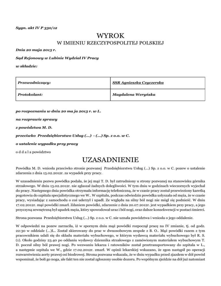 Sygn. akt IV P 330/12 WYROK W IMIENIU RZECZYPOSPOLITEJ POLSKIEJ Dnia 20 maja 2013 r. Sąd Rejonowy w Lubinie Wydział IV Pracy w składzie: Przewodniczący: SSR Agnieszka Czyczerska Protokolant: Magdalena Weryńska po rozpoznaniu w dniu 20 ma ja 2013 r. w L. na rozprawie sprawy z powództwa M. D. przeciwko Przedsiębiorstwo Usług (...) - (...) Sp. z o.o. w C. o ustalenie wypadku przy pracy o d d a l a powództwo UZASADNIENIE Powódka M. D. wniosła przeciwko stronie pozwanej Przedsiębiorstwu Usług (...) Sp. z o.o. w C. pozew o ustalenie zdarzenia z dnia 13.02.2012r. za wypadek przy pracy. W uzasadnieniu pozwu powódka podała, że jej mąż T. D. był zatrudniony u strony pozwanej na stanowisku górnika strzałowego. W dniu 13.02.2012r. nie zgłaszał żadnych dolegliwości. W tym dniu w godzinach wieczornych wyjechał do pracy. Następnego dnia powódka otrzymała informację telefoniczną, że w czasie pracy został przewieziony karetką pogotowia do szpitala specjalistycznego we W.. W szpitalu, podczas odwiedzin powódka usłyszała od męża, że w czasie pracy, wysiadając z samochodu o coś uderzył i upadł. Ze względu na silny ból nogi nie mógł się podnieść. W dniu 17.02.2012r. mąż powódki zmarł. Zdaniem powódki, zdarzenie z dnia 20.07.2012r. jest wypadkiem przy pracy, a jego przyczyną zewnętrzną był upadek męża, który spowodował uraz i ból nogi, oraz dalsze konsekwencji w postaci śmierci. Strona pozwana Przedsiębiorstwu Usług (...) Sp. z o.o. w C. nie uznała powództwa i wniosła o jego oddalenie. W odpowiedzi na pozew zarzuciła, iż w spornym dniu mąż powódki rozpoczął pracę na IV zmianie, tj. od godz. 22:30 w oddziale (...)L.. Został skierowany do prac w dwuosobowym zespole z B. O.. Mąż powódki razem z tym pracownikiem udali się do składu materiału wybuchowego, w którym wydawcą materiału wybuchowego był R. S. (1). Około godziny 23.40 po oddaniu wydawcy dziennika strzałowego z zamówionym materiałem wybuchowym T. D. poczuł silny ból prawej nogi. Po wezwaniu lekarza i ratowników został przetransportowany do szpitala w L., a następnie szpitala we W., gdzie 17.02.2012r. zmarł. W opinii lekarskiej wskazano, że zgon nastąpił po operacji rozwarstwienia aorty prawej osi biodrowej. Strona pozwana wskazała, że w dniu wypadku przed zjazdem w dół powód wspominał, że boli go noga, ale fakt ten nie został zgłoszony osobie dozoru. Po wspólnym zjeździe na dół już natomiast nie wspominał o bólu nogi. Strona pozwana zarzuciła, że w spornym dniu nie doszło do zdarzenia spełniającego przesłanki wypadku przy pracy. T. D. odbył badania profilaktyczne w czasie których nie wskazano przeciwwskazań do pracy. Z pisma lekarza M. G. z dnia 13.07.2012r. wynika, że ból kończyny dolnej u T. D. był skutkiem rozwarstwienia ściany aorty brzusznej, najprawdopodobniej w jej dolnym odcinku i tętnicy biodrowej wspólnej i był wynikiem ostrego niedokrwienia kończyny. Sąd ustalił następujący stan faktyczny: Mąż powódki T. D. był zatrudniony u strony pozwanej od marca 2010r. na stanowisku górnika strzałowego pod ziemią. T. D. był przeszkolony z zakresu BHP, zapoznany z kartą oceny ryzyka zawodowego, przeszedł wymagane badania lekarskie w trakcie których nie stwierdzono przeciwwskazań do zatrudnienia. W dniu 13.02.2012r. T. D. pracował na czwartą zmianę rozpoczynającą się od godz. 22:30. Skarżył się w tym dniu na ból prawej nogi. Został skierowany do pracy w zespole dwuosobowym z B. O.. Po podziale pracy pracownicy zjechali pod ziemię. Z podszybia udali się pieszo w kierunku dworca osobowego. Z dworca pojechali do składu materiałowego kopalni. Praca T. D. polegała na ręcznym załadowaniu materiału wybuchowego – dynamitu z palety na maszynę. Było 12 kartonów z materiałem o wadze ok. 24 kg każdy. Około godziny 23:40 T. D. oddał wydawcy dziennik strzałowego z zamówionym materiałem wybuchowym. Zaraz potem T. D. poczuł silny ból nogi prawej. Wezwano pomoc. Po około 30 minutach dotarła pomoc, a następnie T. D. został przewieziony do szpitala. W dniu 17.02.2012r. T. D. zmarł. Przyczyną zgonu T. D. było rozległe, masywne rozwarstwienie ściany aorty piersiowej i brzusznej z krwiakiem śródściennym oraz drobne pęknięcie ściany tego naczynia tuż powyżej zastawki aortalnej z następową tamponadą serca, skutkujące niewydolnością krążeniowo-oddechową. Zgon był wynikiem schorzenia samoistnego, mógł nastąpić w tym samym czasie, ale w innych okolicznościach. U T. D. występowały predyspozycje do rozwoju choroby, która spowodowały jego zgon. Zespół powypadkowy badający okoliczności i przyczyny wypadku nie uznał zdarzenia za wypadek przy pracy z uwagi na brak przyczyn zewnętrznej. Dowód: akta powypadkowe T. D. Opinia biegłej sądowej B. P., k.66-68 Zeznania świadków: - B. O., k. 51verte - R. S. (2), k. 51verte-52 - S. O., k. 52 Sąd zważył, co następuje: Powództwo nie zasługiwało na uwzględnienie. Zgodnie z treścią art. 3 ust. 1 pkt. 1 ustawy z dn. 30.10.2002 r. o ubezpieczeniu społecznym z tytułu wypadków przy pracy i chorób zawodowych, za wypadek przy pracy uważa się nagłe zdarzenie wywołane przyczyną zewnętrzną powodujące uraz lub śmierć, które nastąpiło w związku z pracą podczas lub w związku z wykonywaniem przez pracownika zwykłych czynności lub poleceń przełożonych. Zdarzenie spełniające kryterium nagłości musi zatem zostać wywołane przyczyną zewnętrzną, co oznacza, że nie może pochodzić z organizmu pracownika dotkniętego schorzeniem samoistnym. W ocenie Sądu, w rozpoznawanej sprawie nie zaistniała niezbędna dla uznania zdarzenia za wypadek przy pracy przesłanka spowodowania zdarzenia przez przyczynę zewnętrzną. Ocenę powyższą Sąd oparł przede wszystkim na opinii powołanej w sprawie biegłej sądowej B. P.. Z opinii tej jednoznacznie wynika, iż przyczyną bólu nogi zmarłego męża powódki, 