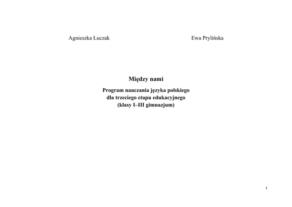 Agnieszka Łuczak Ewa Prylińska Między nami Program nauczania języka polskiego dla trzeciego etapu edukacyjnego (klasy I–III gimnazjum) 1 SPIS TREŚCI Charakterystyka programu i procedury osiągania celów 3 Cele edukacyjne 7 Treści nauczania 11 Lektura 44 Sprawdzanie i ocenianie osiągnięć uczniów 51 Planowane osiągnięcia uczniów 53 2 CHARAKTERYSTYKA PROGRAMU I PROCEDURY OSIĄGANIA CELÓW METODY NAUCZANIA Zapewnienie wszechstronnego rozwoju osobowości i przygotowanie do życia w społeczeństwie odbywają się w dużej mierze przez wychowanie językowe, któremu są podporządkowane treści kształcenia językowego i kulturalno-literackiego. Dlatego nauczanie języka polskiego w gimnazjum powinno być nastawione na kształcenie sprawności komunikowania się w aspekcie praktycznym i kulturowym. W kształceniu umiejętności przewidzianych w programie należy wykorzystać różnorodne techniki nauczania, między innymi indywidualną i zbiorową pracę z tekstem, dyskusję, przekłady intersemiotyczne, dramę, projekty, gry dydaktyczne, demonstracje, mapy mentalne, wizualizacje. Ważne jest również rozwijanie samodzielności uczniów (np. w docieraniu do różnego typu informacji), rozwijanie ich zainteresowań i zdolności. Dobór metod zależy od możliwości uczniów oraz tego, jakie umiejętności nauczyciel chce kształcić w danej chwili. Wybierając techniki, warto pamiętać o tym, że poszczególne treści kształcenia najlepiej wprowadzać równolegle i w integracji ze wszystkimi działami. Dlatego najlepsze wydają się te metody, które będą aktywizowały i motywowały ucznia oraz dawały możliwość praktycznego zastosowania zdobytej wiedzy i szeroko pojętego uczestnictwa w kulturze. UWAGI O REALIZACJI PROGRAMU Informacje ogólne Nadrzędną rolą nauczyciela jest kierowanie pracą na lekcji tak, aby uczniowie sukcesywnie zdobywali umiejętności zawarte w założeniach podstawy programowej i programie Między nami. Należy wdrażać uczniów do systematycznej pracy oraz do planowania działań edukacyjnych, np. wyznaczając czas na napisanie dłuższej pracy pisemnej, przygotowanie wystawy czy 3 słuchowiska. Na najważniejsze zagadnienia, ujęte w podstawie programowej, należy poświęcić tyle czasu, by każdy uczeń opanował je jak najlepiej. Oprócz kształcenia umiejętności ważnym zadaniem nauczyciela jest kierowanie rozwojem osobowości ucznia, przygotowywanie go do odgrywania ról społecznych oraz dokonywania pozytywnych wyborów i ocen. Należy pamiętać o nawiązywaniu więzi ucznia z najbliższym otoczeniem, regionem, kulturą i tradycją narodu, by w ten sposób przygotować go do świadomego uczestnictwa w kulturze i tradycji europejskiej. Program zakłada integrację treści z zakresu kształcenia polonistycznego (kształcenie literackie, językowe, kulturowe), korelację z innymi przedmiotami oraz odwoływanie się do pozaszkolnych doświadczeń uczniów. Łączenie różnych działów kształcenia polonistycznego pozwala uczniom dostrzec związek między literaturą a językiem. Uczeń ma przede wszystkim nabywać umiejętności językowe, pogłębiać świadomość własnego języka, w którym się komunikuje z rówieśnikami oraz z otoczeniem i za pomocą którego opisuje na przykład dzieło sztuki. Rozumienie językowego obrazu świata pozwoli lepiej zrozumieć literaturę. Ideą programu jest więc możliwie najściślejsze połączenie zagadnień językowych z analizą i interpretacją tekstów literackich oraz wiadomości gramatycznych z formułowaniem precyzyjnych wypowiedzi pisanych i mówionych. Program zawiera również treści ścieżek edukacyjnych: edukację filozoficzną, medialną, czytelniczą, regionalną, kulturę polską na tle tradycji śródziemnomorskiej. Ich realizacji służą zarówno zaproponowane w podręcznikach i ćwiczeniach teksty kultury, informacje dodatkowe (np. poszerzające konteksty), jak i zadania dla ucznia. Dążąc do osiągnięcia celów programu, należy korzystać z różnorodnych pomocy dydaktycznych: słowników, encyklopedii, internetu, nagrań, reprodukcji dzieł sztuki. Trzeba również używać programów komputerowych, zwłaszcza edytorów tekstu. Realizację programu Między nami umożliwia korzystanie z podręczników i zeszytów ćwiczeń Między nami Agnieszki Łuczak, Ewy Prylińskiej i Rolanda Maszki. Dodatkowymi pomocami dydaktycznymi serii, pomagającymi nauczycielowi w 4 osiąganiu celów edukacyjnych wyznaczonych przez podstawę programową i program, są poradniki zawierające m.in. karty pracy, płyty CD, gry edukacyjne. Kształcenie literackie i kulturowe Nadrzędnym kryterium doboru tekstów literackich i innych tekstów kultury w programie Między nami są możliwości percepcyjne ucznia, walory artystyczne dzieł oraz sposób prowadzenia dialogu ze współczesnością. Bardzo ważnym aspektem jest również funkcja wychowawcza – wartości, do których się odwołują wybrane teksty kultury, mają pomóc młodemu człowiekowi w dokonywaniu mądrych wyborów, skłaniają do samodzielnych refleksji i ocen, rozwijają wrażliwość i zamiłowania artystyczne, a tym samym uczą aktywnego uczestnictwa w kulturze, szacunku dla tradycji, wpływają na rozwój osobowości ucznia. Zamieszczone w programie teksty literackie i inne teksty kultury mają układ tematyczny i problemowy. Takie ujęcie materiału pozwoli uczniom nie tylko rozwijać umiejętności analizy i interpretacji, ale także służy zapamiętaniu i uporządkowaniu poznanych treści. Stwarza to również możliwość omawiania tych samych dzieł w różnych zestawieniach, odwoływania się do doświadczeń uczniów, porównywania kontekstów i tym samym postrzegania złożoności zjawisk w literaturze, kulturze i w świecie, w którym żyjemy. Łączenie treści językowych z kształceniem literacko-kulturowym w myśl koncepcji programu nie powinno być oderwane od codziennych doświadczeń młodzieży. Dlateg