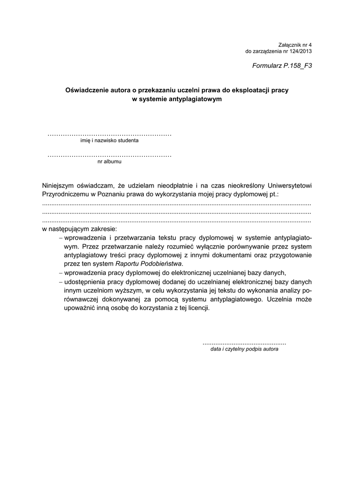 Załącznik nr 4 do zarządzenia nr 124/2013 Formularz P.158_F3 Oświadczenie autora o przekazaniu uczelni prawa do eksploatacji pracy w systemie antyplagiatowym ………………………………………………… imię i nazwisko studenta ………………………………………………… nr albumu Niniejszym oświadczam, Ŝe udzielam nieodpłatnie i na czas nieokreślony Uniwersytetowi Przyrodniczemu w Poznaniu prawa do wykorzystania mojej pracy dyplomowej pt.: .................................................................................................................................................... .................................................................................................................................................... .................................................................................................................................................... w następującym zakresie: − wprowadzenia i przetwarzania tekstu pracy dyplomowej w systemie antyplagiatowym. Przez przetwarzanie naleŜy rozumieć wyłącznie porównywanie przez system antyplagiatowy treści pracy dyplomowej z innymi dokumentami oraz przygotowanie przez ten system Raportu Podobieństwa. − wprowadzenia pracy dyplomowej do elektronicznej uczelnianej bazy danych, − udostępnienia pracy dyplomowej dodanej do uczelnianej elektronicznej bazy danych innym uczelniom wyŜszym, w celu wykorzystania jej tekstu do wykonania analizy porównawczej dokonywanej za pomocą systemu antyplagiatowego. Uczelnia moŜe upowaŜnić inną osobę do korzystania z tej licencji. .............................................. data i czytelny podpis autora