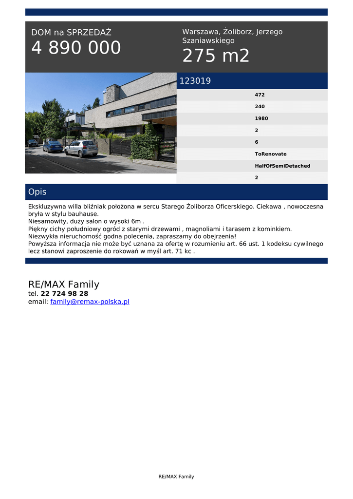 DOM na SPRZEDAŻ 4 890 000 Warszawa, Żoliborz, Jerzego Szaniawskiego 275 m2 123019 472 240 1980 2 6 ToRenovate HalfOfSemiDetached 2 Opis Ekskluzywna willa bliźniak położona w sercu Starego Żoliborza Oficerskiego. Ciekawa , nowoczesna bryła w stylu bauhause. Niesamowity, duży salon o wysoki 6m . Piękny cichy południowy ogród z starymi drzewami , magnoliami i tarasem z kominkiem. Niezwykła nieruchomość godna polecenia, zapraszamy do obejrzenia! Powyższa informacja nie może być uznana za ofertę w rozumieniu art. 66 ust. 1 kodeksu cywilnego lecz stanowi zaproszenie do rokowań w myśl art. 71 kc . RE/MAX Family tel. 22 724 98 28 email: [email protected] RE/MAX Family Powered by TCPDF (www.tcpdf.org)