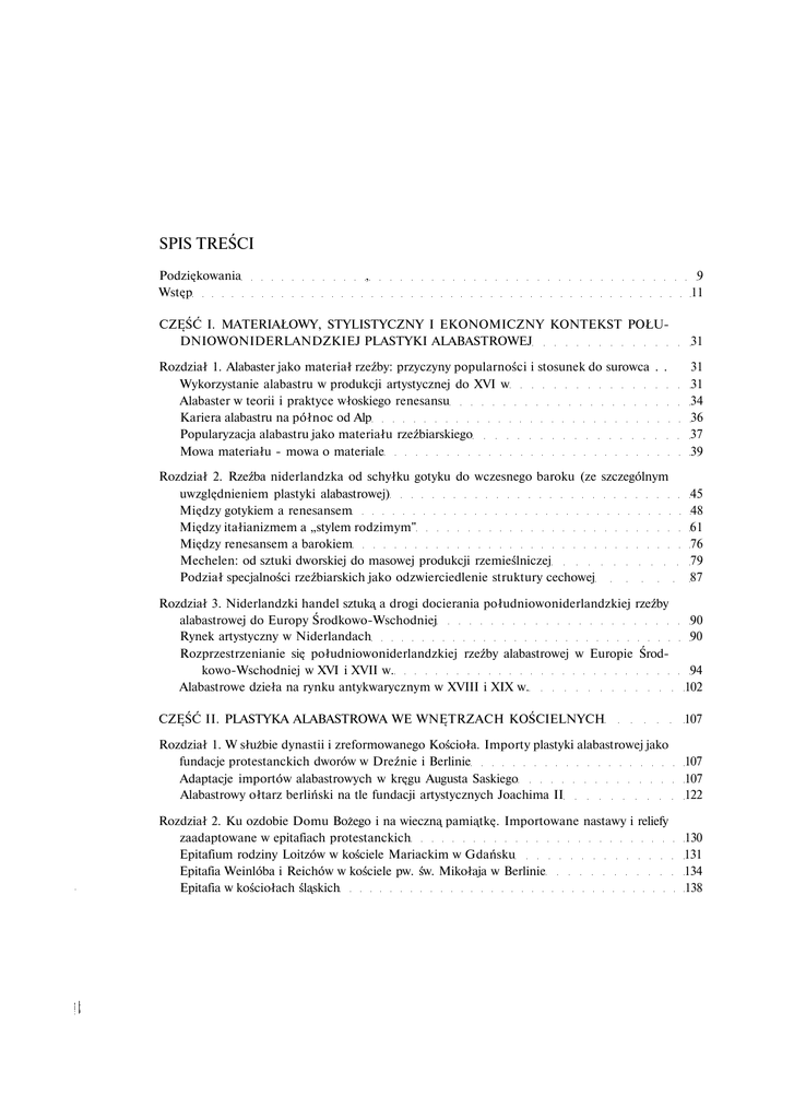 SPIS TREŚCI Podziękowania Wstęp , 9 11 CZĘŚĆ I. MATERIAŁOWY, STYLISTYCZNY I EKONOMICZNY KONTEKST POŁUDNIOWONIDERLANDZKIEJ PLASTYKI ALABASTROWEJ 31 Rozdział 1. Alabaster jako materiał rzeźby: przyczyny popularności i stosunek do surowca . . Wykorzystanie alabastru w produkcji artystycznej do XVI w Alabaster w teorii i praktyce włoskiego renesansu Kariera alabastru na północ od Alp Popularyzacja alabastru jako materiału rzeźbiarskiego Mowa materiału - mowa o materiale 31 31 34 36 37 39 Rozdział 2. Rzeźba niderlandzka od schyłku gotyku do wczesnego baroku (ze szczególnym uwzględnieniem plastyki alabastrowej) Między gotykiem a renesansem Między itałianizmem a „stylem rodzimym" Między renesansem a barokiem Mechelen: od sztuki dworskiej do masowej produkcji rzemieślniczej Podział specjalności rzeźbiarskich jako odzwierciedlenie struktury cechowej 45 48 61 76 79 87 Rozdział 3. Niderlandzki handel sztuką a drogi docierania południowoniderlandzkiej rzeźby alabastrowej do Europy Środkowo-Wschodniej Rynek artystyczny w Niderlandach Rozprzestrzenianie się południowoniderlandzkiej rzeźby alabastrowej w Europie Środkowo-Wschodniej w XVI i XVII w. Alabastrowe dzieła na rynku antykwarycznym w XVIII i XIX w. 94 102 CZĘŚĆ II. PLASTYKA ALABASTROWA WE WNĘTRZACH KOŚCIELNYCH 107 Rozdział 1. W służbie dynastii i zreformowanego Kościoła. Importy plastyki alabastrowej jako fundacje protestanckich dworów w Dreźnie i Berlinie Adaptacje importów alabastrowych w kręgu Augusta Saskiego Alabastrowy ołtarz berliński na tle fundacji artystycznych Joachima II 107 107 122 Rozdział 2. Ku ozdobie Domu Bożego i na wieczną pamiątkę. Importowane nastawy i reliefy zaadaptowane w epitafiach protestanckich Epitafium rodziny Loitzów w kościele Mariackim w Gdańsku Epitafia Weinlóba i Reichów w kościele pw. św. Mikołaja w Berlinie Epitafia w kościołach śląskich 130 131 134 138 90 90 SPIS TREŚCI Rozdział 3. Wyznanie wiary czy kwestia smaku? Importy plastyki alabastrowej zaadaptowane w dziełach fundowanych przez katolików , Ołtarzyk w kościele parafialnym w Uchaniach . . . Ołtarz w kościele pw. Najświętszej Marii Panny na Piasku we Wrocławiu Pomnik w kościele pw. św. Jakuba w Lubiążu 149 151 154 160 CZĘŚĆ III. PLASTYKA ALABASTROWA WE WNĘTRZACH ŚWIECKICH 167 Rozdział 1. Kopie rzeźb antycznych i renesansowych Rozdział 2. Reliefy portretowe Rozdział 3. Plastyka o tematyce mitologicznej Rozdział 4. Reliefy o tematyce religijnej Rozdział 5. Zespoły plastyki alabastrowej we wnętrzach reprezentacyjnych . . . 167 174 177 179 184 , Zakończenie Aneksy źródłowe 189 195 KATALOG 207 I. Południowoniderlandzkie nastawy alabastrowe ok. 1550-1565 II. „Ołtarzyki domowe" ok. 1550-1600 III. Reliefy południowoniderlandzkie 1540-1650 Reliefy Mistrza Historii Dawida i Abigail Reliefy mecheleńskie IV. Obiekty porównawcze Spis skrótów 208 221 233 247 257 281 286 Albumy fotografii i rysunków 287 Bibliografia Spis ilustracji Summary List of Indeks nazw miejscowych Indeks osób 483 514 527 547 561 566 figures CONTENTS Acknowledgements Introduction 9 11 PART I. THE MATERIAŁ, STYLISTIC AND ECONOMIC CONTEXT OF SOUTHERN NETHERLANDISH ALABASTER SCULPTURE 31 Chapter 1. Alabaster as a sculpture materiał: reasons for its popularity and attitudes towards the materiał The use of alabaster in artistic production from antiquity until the 16 century Alabaster in the theory and praxis of the Italian Renaissance Usage of alabaster north of the Alps Popularisation of alabaster as a sculptural materiał The semantics of the materiał 31 31 34 36 37 39 Chapter 2. Netherlandish sculpture from the late Gothic to the early Baroąue (with particular emphasis on alabaster carving) Between the Gothic and the Renaissance Between Italianism and "indigenous style" Between the Renaissance and the Baroąue Mechelen: from court art to mass craft production Specialisation within the sculptural craft as a reflection ofguild structure 45 48 61 76 79 87 Chapter 3. The Netherlandish art trade and routes taken by Southern Netherlandish alabaster sculpture to Central and Eastern Europę The art market in the Netherlands The spread of Southern Netherlandish alabaster sculpture in Central and Eastern Europę inthe 16 t h and 17 th centuries Alabaster works on the antiąuarian market in the 18th and 19 th centuries 94 102 PART II. ALABASTER SCULPTURE IN CHURCH INTERIORS 107 90 90 Chapter 1: In the service of dynasty and the reformed church. Imports of Netherlandish sculpture as commissions of the Protestant courts in Dresden and Berlin Adaptations ofimported alabaster sculpture in the court ofAugustus ofSaxony The Berlin alabaster altarpiece in the context of other artistic commissions of Joachim II of Brandenburg 122 Chapter 2. For the adornment of the house of God and in everlasting memory. Imports of alabaster reliefs adapted in Protestant epitaphs Epitaph of the Loitz family in St. Mary's Church in Gdańsk Epitaph ofWeinlób and Reich in St. Nicholas'Church in Berlin Epitaphs in the Silesian churches 130 131 134 138 107 107 CONTENTS Chapter 3. A ąuestion of faith or a matter of taste? Imported alabaster reliefs adapted in works commissioned by Catholics Smali altarpiece in the parish church in Uchanie Altarpiece in the Church ofthe Blessed Virgin Mary on the Sand in Wrocław Monument in St. James'Church in Lubiąż 149 151 154 160 PART III. ALABASTER SCULPTURE IN SECULAR INTERIORS 167 Chapter 1. Copies of ancient and contemporary works Chapter 2. Relief portraits Chapter 3. Mythological sculpture Chapter 4. Reliefs ofreligious subjects Chapter 5. Assemblages of alabaster sculptures in representative interiors 167 174 177 179 184 Conclusion Archival annex 189 195 CATALOGUE 207 I. Southern Netherlandish altarpieces ca. 1550-1565 II. "Domestic altarpieces" ca. 1550-1600 III. Southern Netherlandish reliefs 1540-1650 Reliefs ofthe Master ofthe Story ofDavid and Abigail Mechelen reli