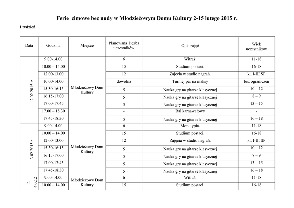 Ferie zimowe bez nudy w Młodzieżowym Domu Kultury 2-15 lutego 2015 r. I tydzień Planowana liczba uczestników Opis zajęć Wiek uczestników 9.00-14.00 6 Witraż. 11-18 10.00 – 14.00 15 Studium postaci. 16-18 12.00-13.00 12 Zajęcia w studio nagrań. kl. I-III SP 10.00-14.00 dowolna Turniej par na maksy bez ograniczeń 5 Nauka gry na gitarze klasycznej 10 – 12 16:15-17:00 5 Nauka gry na gitarze klasycznej 8–9 17:00-17:45 5 - Nauka gry na gitarze klasycznej Bal karnawałowy 13 – 15 Nauka gry na gitarze klasycznej Monotypia. 16 – 18 9.00-14.00 5 6 10.00 – 14.00 15 Studium postaci. 16-18 12.00-13.00 12 Zajęcia w studio nagrań. kl. I-III SP 5 Nauka gry na gitarze klasycznej 10 – 12 16:15-17:00 5 Nauka gry na gitarze klasycznej 8–9 17:00-17:45 5 Nauka gry na gitarze klasycznej 13 – 15 17:45-18:30 5 6 Nauka gry na gitarze klasycznej Witraż. 16 – 18 15 Studium postaci. 16-18 Godzina 2.02.2015 r. Data 15:30-16:15 Miejsce Młodzieżowy Dom Kultury 17.00 – 18.30 15:30-16:15 9.00-14.00 015 4.02.2 r. 3.02.2015 r. 17:45-18:30 10.00 – 14.00 Młodzieżowy Dom Kultury Młodzieżowy Dom Kultury - 11-18 11-18 5.02.2015 r. 6.02.2015 r. 10.00-14.00 dowolna Turniej par na impy bez ograniczeń 12.00-13.00 12 Zajęcia w studio nagrań. kl. I-III SP 15:30-16:15 5 Nauka gry na gitarze klasycznej 10 – 12 16:15-17:00 Nauka gry na gitarze klasycznej 8–9 16:30 – 18:00 5 6 Zajęcia z gitary elektrycznej – grupa średniozaawan. 13 - 19 17:00-17:45 5 Nauka gry na gitarze klasycznej 13 – 15 17:45-18:30 5 16 – 18 18:00 – 18:45 12 9.00-14.00 6 Nauka gry na gitarze klasycznej Konserwacja gitary i nauka prostych czynności lutniczych z zakresu regulacji instrumentu. Monotypia. 10.00 – 14.00 15 Studium postaci. 16-18 5 Nauka gry na gitarze klasycznej 10 – 12 5 Nauka gry na gitarze klasycznej 8–9 17:00-17:45 5 Nauka gry na gitarze klasycznej 13 – 15 17:45-18:30 5 Nauka gry na gitarze klasycznej 16 – 18 15:30-16:15 5 5 - 12 Nauka gry na gitarze klasycznej Zajęcia z gitary elektrycznej – grupa początkujących. 10 – 12 5 13 – 15 5 Nauka gry na gitarze klasycznej Kreowanie brzmienia - praca ze wzmacniaczem i efektami gitarowymi. Planowana liczba uczestników Opis zajęć Wiek uczestników 15:30-16:15 16:15-17:00 15:30 – 17:00 16:15-17:00 Młodzieżowy Dom Kultury Młodzieżowy dom Kultury 17:00 – 17:45 Od 10 11-18 Od 19 Od 19 II tydzień Data Godzina Miejsce 9.02.2015 10.02.2015 2015 11.02. 9.00 – 9.45 4 Zajęcia wokalne. 6-7 9.00-10.30 12 Plastyka 5-12 9.45 – 10.30 4 Zajęcia wokalne. 7-8 10.30-12.00 12 plastyka 5-12 10.35 – 11.20 4 Zajęcia wokalne. 8-9 11.20 – 12.05 4 Zajęcia wokalne. 9-10 12 plastyka 5-12 4 Zajęcia wokalne. 11-12 16.30-17.15 4 Nauka gry na gitarze klasycznej dla początkujących. 17.15-18.00 4 Nauka gry na gitarze klasycznej dla początkujących. 18.00.18.45 3 18.45-19.30 3 Nauka gry na gitarze klasycznej dla średniozaawan. Nauka gry na gitarze klasycznej dla średniozaawan. 19.30-20.15 3 Nauka gry na gitarze klasycznej dla średniozaawan. 9.00-10.30 12 plastyka 5-12 10.30-12.00 12 plastyka 5-12 12.00-15.00 5 fotografia od 12 4 Nauka gry na gitarze klasycznej dla początkujących. 4 12.00-13.30 12.10 – 12.55 Młodzieżowy Dom Kultury 16.30-17.15 17.15-18.00 Młodzieżowy Dom Kultury bez ograniczeń 18.00.18.45 3 Nauka gry na gitarze klasycznej dla początkujących. Nauka gry na gitarze klasycznej dla średniozaawan. 18.45-19.30 3 Nauka gry na gitarze klasycznej dla średniozaawan. 19.30-20.15 3 Nauka gry na gitarze klasycznej dla średniozaawan. 4 Zajęcia wokalne. 6-7 12 Taniec współczesny 13-16 lat 9.00 – 9.45 9.00 - 9.45 Młodzieżowy Dom Kultury bez ograniczeń 9.00 -15.00 15 Wyjście do kina w Galerii Jantar 7-12 9.45 – 10.30 4 Zajęcia wokalne. 7-8 9.50-10.35 15 Muzyka – ruch - przestrzeń (warsztaty ruchowe) 12-16 lat 10.00-13.00 12 Zajęcia plastyczne: techniki malarskie 8-12 lat 10.35 – 11.20 4 Zajęcia wokalne. 8-9 10.40-11.25 20 Dance mix (warsztaty taneczne) 10-16 lat 11.20 – 12.05 4 Zajęcia wokalne. 9-10 12.02.2015 11.30-12.15 Muzyka i plastyka (warsztaty plastyczne) 12.10 – 12.55 4 Zajęcia wokalne. 16.30-17.15 4 Nauka gry na gitarze klasycznej dla początkujących. 17.15-18.00 4 18.00.18.45 3 Nauka gry na gitarze klasycznej dla początkujących. Nauka gry na gitarze klasycznej dla średniozaawan. 18.45-19.30 3 Nauka gry na gitarze klasycznej dla średniozaawan. 19.30-20.15 3 Nauka gry na gitarze klasycznej dla średniozaawan. 9.00 – 9.45 4 Zajęcia wokalne. 6-7 9.00-9.45 15 Rytmika dla smyka 4-5 lat 9.00-10.30 12 plastyka 5-12 9.45 – 10.30 4 Zajęcia wokalne. 7-8 9.50-10.35 15 Rytmika dla smyka 6-7 lat 8 Zajęcia plastyczne: decoupage 8-12 lat 10.30-12.00 12 plastyka 5-12 10.35 – 11.20 4 Zajęcia wokalne. 8-9 10.40-11.25 15 Świat moim instrumentem (warsztaty twórcze) 8-12 lat 11.20 – 12.05 4 Zajęcia wokalne. 9-10 10.00-13.00 Młodzieżowy Dom Kultury 11-12 bez ograniczeń 13.02.2015 11.30-12.15 15 Świat moim instrumentem (warsztaty twórcze). 8-12 lat 12.00-15.00 5 fotografia od 12 12.10 – 12.55 4 Zajęcia wokalne. 11-12 12.20-13.05 15 Muzyka klasyczna dla najmłodszych 6-8 lat 13.10-13.55 20 Dance mix (warsztaty taneczne) 10-16 lat 16.30-17.15 4 Nauka gry na gitarze klasycznej dla początkujących. 17.15-18.00 4 18.00.18.45 3 Nauka gry na gitarze klasycznej dla początkujących. Nauka gry na gitarze klasycznej dla średniozaawan. 18.45-19.30 3 Nauka gry na gitarze klasycznej dla średniozaawan. 19.30-20.15 3 Nauka gry na gitarze klasycznej dla średniozaawan. 9.00 – 9.45 4 Zajęcia wokalne. 6-7 9.00-10.30 12 plastyka 5-12 9.45 – 10.30 4 Zajęcia wokalne. 7-8 10.00-13.00 12 Zajęcia plastyczne: formy przestrzenne 8-12 lat 10.30-12.00 12 plastyka 5-12 10.35 – 11.20 4 Zajęcia wokalne. 8-9 4 Zajęcia wokalne. 9-10 12.00-13.30 10 plastyka 5-12 12.10 – 12.55 4 Zajęcia wokalne. 11-12 16.30-17.15 4 Nauka gry na gitarze klasycznej dla początkujących. 17.15-18.00 4 18.00 - 18.45 3 Nauk
