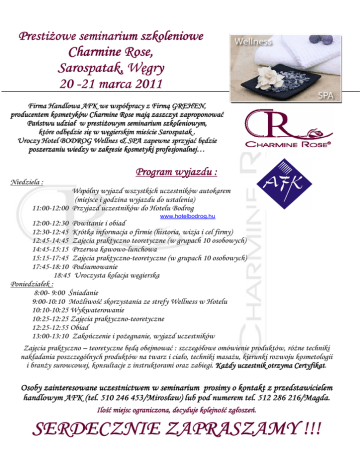 Prestiżowe seminarium szkoleniowe Charmine Rose, Sarospatak, Węgry 20 -21 marca 2011 Firma Handlowa AFK we współpracy z Firmą GREHEN, producentem producentem kosmetyków Charmine Rose mają zaszczyt zaszczyt zaproponować Państwu udział w prestiżowym seminarium szkoleniowym, szkoleniowym, które odbędzie się w węgierskim mieście Sarospatak . Uroczy Hotel BODROG Wellnes & SPA zapewne sprzyjać będzie poszerzaniu wiedzy w zakresie kosmetyki profesjonalnej… profesjonalnej… Program wyjazdu : Niedziela : Wspólny wyjazd wszystkich uczestników autokarem (miejsce i godzina wyjazdu do ustalenia) 11:00-12:00 Przyjazd uczestników do Hotelu Bodrog www.hotelbodrog.hu 12:00-12:30 Powitanie i obiad 12:30-12:45 Krótka informacja o firmie (historia, wizja i cel firmy) 12:45-14:45 Zajęcia praktyczno teoretyczne (w grupach 10 osobowych) 14:45-15:15 Przerwa kawowo-lunchowa 15:15-17:45 Zajęcia praktyczno-teoretyczne (w grupach 10 osobowych) 17:45-18:10 Podsumowanie 18:45 Uroczysta kolacja węgierska Poniedziałek : 8:00- 9:00 Śniadanie 9:00-10:10 Możliwość skorzystania ze strefy Wellness w Hotelu 10:10-10:25 Wykwaterowanie 10:25-12:25 Zajęcia praktyczno-teoretyczne 12:25-12:55 Obiad 13:00-13:10 Zakończenie i pożegnanie, wyjazd uczestników Zajęcia praktyczno – teoretyczne będą obejmować : szczegółowe omówienie produktów, różne techniki nakładania poszczególnych produktów na twarz i ciało, techniki masażu, kierunki rozwoju kosmetologii i branży surowcowej, konsultacje z instruktorami oraz zabiegi. Każdy uczestnik otrzyma Certyfikat. Certyfikat Osoby zainteresowane zainteresowane uczestnictwem w seminarium prosimy o kontakt z przedstawicielem handlowym AFK (tel. (tel. 510 246 453/Mirosław) 453/Mirosław) lub pod numerem tel. 512 286 216/Magda. 216/Magda. Ilość miejsc ograniczona, decyduje kolejność zgłoszeń. SERDECZNIE ZAPRASZAMY !!!