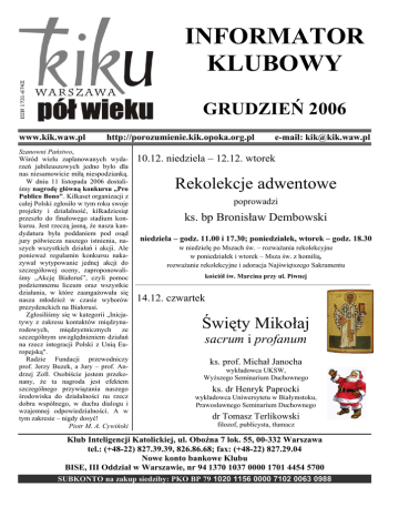 INFORMATOR KLUBOWY GRUDZIEŃ 2006 www.kik.waw.pl http://porozumienie.kik.opoka.org.pl Szanowni Państwo, Wśród wielu zaplanowanych wydarzeń jubileuszowych jedno było dla nas niesamowicie miłą niespodzianką. W dniu 11 listopada 2006 dostaliśmy nagrodę główną konkursu „Pro Publico Bono". Kilkaset organizacji z całej Polski zgłosiło w tym roku swoje projekty i działalność, kilkadziesiąt przeszło do finałowego stadium konkursu. Jest rzeczą jasną, że nasza kandydatura była poddaniem pod osąd jury półwiecza naszego istnienia, naszych wszystkich działań i akcji. Ale ponieważ regulamin konkursu nakazywał wytypowanie jednej akcji do szczegółowej oceny, zaproponowaliśmy „Akcję Białoruś”, czyli pomoc podziemnemu liceum oraz wszystkie działania, w które zaangażowała się nasza młodzież w czasie wyborów prezydenckich na Białorusi. Zgłosiliśmy się w kategorii „Inicjatywy z zakresu kontaktów międzynarodowych, międzyetnicznych ze szczególnym uwzględnieniem działań na rzecz integracji Polski z Unią Europejską". Radzie Fundacji przewodniczy prof. Jerzy Buzek, a Jury – prof. Andrzej Zoll. Osobiście jestem przekonany, że ta nagroda jest efektem szczególnego przywiązania naszego środowiska do działalności na rzecz dobra wspólnego, w duchu dialogu i wzajemnej odpowiedzialności. A w tym zakresie – nigdy dosyć! Piotr M. A. Cywiński e-mail: [email protected] 10.12. niedziela – 12.12. wtorek Rekolekcje adwentowe poprowadzi ks. bp Bronisław Dembowski niedziela – godz. 11.00 i 17.30; poniedziałek, wtorek – godz. 18.30 w niedzielę po Mszach św. – rozważania rekolekcyjne w poniedziałek i wtorek – Msza św. z homilią, rozważanie rekolekcyjne i adoracja Najświętszego Sakramentu kościół św. Marcina przy ul. Piwnej 14.12. czwartek Święty Mikołaj sacrum i profanum ks. prof. Michał Janocha wykładowca UKSW, Wyższego Seminarium Duchownego ks. dr Henryk Paprocki wykładowca Uniwersytetu w Białymstoku, Prawosławnego Seminarium Duchownego dr Tomasz Terlikowski filozof, publicysta, tłumacz Klub Inteligencji Katolickiej, ul. Oboźna 7 lok. 55, 00-332 Warszawa tel.: (+48-22) 827.39.39, 826.86.68; fax: (+48-22) 827.29.04 Nowe konto bankowe Klubu BISE, III Oddział w Warszawie, nr 94 1370 1037 0000 1701 4454 5700 SUBKONTO na zakup siedziby: PKO BP 79 1020 1156 0000 7102 0063 0988 2 INFORMATOR KLUBOWY – grudzień 2006 ♦ POZOSTAŁE ZEBRANIA OGÓLNE ♦ 05.12. wtorek godz. 16.00 Czytamy Nowy Testament dr Stanisława Grabska 08.12. piątek godz. 19.00 Prezentacja książki pt.: „Wypędzeni ze Wschodu” Spotkanie poprowadzi red. Renate Stoessinger 10,11,12 grudnia niedziela – wtorek Zaprasza Sekcja Polsko-Niemiecka REKOLEKCJE ADWENTOWE w kościele św. Marcina przy ul. Piwnej (1 strona) n i e d z i e l a – godz. 11.00 i 17.30; p o n i e d z i a ł e k, w t o r e k – godz. 18.30 10.12. niedziela godz. 10.15 Czytanie Ewangelii wg św. Marka, rozdz. 12 Myśli z Taizé – „Zadziwienie radością” Zaprasza Sekcja Ewangelijn 11.12. poniedziałek godz. 17.30 Spotkanie formacyjne z o. Zygmuntem Perzem SJ Sanktuarium oo. Jezuitów przy ul. Rakowieckiej 61 Zaprasza Sekcja Emaus 12.12. wtorek godz. 16.00 Czytamy Stary Testament dr Stanisława Grabska 14.12. czwartek godz. 18.00 Święty Mikołaj – sacrum i profanum (I strona) ks. prof. Michał Janocha, ks. prof. Henryk Paprocki, dr Tomasz Terlikowski 17.12. niedziela godz. 16.00 godz. 17.00 OPŁATEK KLUBOWY Msza Święta w kościele oo. Paulinów pw. Świętego Ducha przy ul. Długiej 3 Spotkanie opłatkowe w kościele oo. Dominikanów pw. św. Jacka przy ul. Freta 10 17.12. niedziela godz. 11.45 Spotkanie w Nazarecie dzieci do lat siedmiu 19.12. wtorek godz. 16.00 Czytamy Nowy Testament dr Stanisława Grabska godz. 17.00 Wieczór wigilijny – koncert kolęd w wykonaniu chóru „Cantabile” i czytanie poezji Zaprasza Sekcja Kulturalno-Turystyczna 24.12. niedziela godz. 24.00 Wigilia Bożego Narodzenia JUBILEUSZOWA PASTERKA w kościele św. Marcina Uroczystej Mszy Świętej Pasterskiej będzie przewodniczył ks. bp. Bronisław Dembowski Ks. Andrzej Gałka, rektor kościoła św. Marcina, zaprasza na jubileuszową Pasterkę, która odbędzie się w 50. rocznicę posługi i obecności na Piwnej Sióstr Franciszkanek Służebnic Krzyża oraz w 650. rocznicę istnienia kościoła. KLUB NIECZYNNY 25 – 30 grudnia poniedziałek-sobota Zaprasza Sekcja Emaus 28.12. czwartek godz. 17.30 Spotkanie ekumeniczne w Kościele św. Marcina 31.12. niedziela godz. 17.30 godz. 17.30-24.00 godz. 24.00 Ostatni dzień roku Msza Święta w kościele św. Marcina Adoracja Najświętszego Sakramentu Msza Święta o pokój na świecie rys. Dorota Cichocka Zaprasza ks. rektor Andrzej Gałka Szanowni Państwo, W imieniu Zarządu Klubu dziękuję serdecznie za mijający rok wspólnej modlitwy, pracy, dyskusji, dialogu i zabawy. Życzę wszystkim i każdemu z osobna prawdziwie błogosławionych Świąt Bożego Narodzenia. Życzę, aby był to czas spokojniejszy, sprzyjający refleksji nad tym, co minęło, co jest i co przyjdzie. Niech Boże Narodzenie będzie radosnym, nadzwyczajnym przeżyciem w naszej codziennej działalności. Wszystkich Was oddaję pod opiekę Świętej Rodziny. Jakub Kiersnowski 3 INFORMATOR KLUBOWY – grudzień 2006 ♦ KOMUNIKATY I KOMENTARZE ♦ PRO PUBLICO BONO W dniu 11 listopada Klub Inteligencji Katolickiej w Warszawie otrzymał ogólnopolską główną nagrodę w konkursie Pro Publico Bono. Przedstawiciele Klubu w składzie: Piotr M. A. Cywiński – Prezes KIK, Jakub Kiersnowski – Sekretarz KIK i Marek Kielanowski – reprezentant Sekcji Rodzin mieli zaszczyt odebrać ją z rąk Premiera Jerzego Buzka w Teatrze im. Juliusza Słowackiego w Krakowie. KOŚCIÓŁ ŚWIĘTEGO MARCINA W WARSZAWIE Bieżący rok jest rokiem jubileuszowym nie tylko dla Klubu Inteligencji Katolickiej w Warszawie, lecz także dla kościoła św. Marcina przy ul. Piwnej, z którym społec
