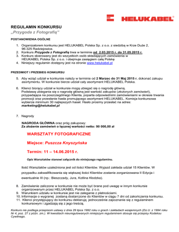 REGULAMIN KONKURSU „Przygoda z Fotografią” POSTANOWIENIA OGÓLNE 1. Organizatorem konkursu jest HELUKABEL Polska Sp. z o.o. z siedzibą w Krze Duże 2, 96-325 Radziejowice. 2. Konkurs Przygoda z Fotografią trwa w terminie od 2.03.2015 r. do 31.05.2015 r. 3. Konkurs skierowany jest do wszystkich osób składających zamówienia w HEUKABEL Polska Sp. z o.o. i obejmuje zasięgiem całą Polskę 4. Niniejszy regulamin dostępny jest na stronie www.helukabel.pl PRZEDMIOT I PRZEBIEG KONKURSU 5. Aby wziąć udział w konkursie należy w terminie od 2 Marzec do 31 Maj 2015 r. dokonać zakupu asortymentu. W konkursie bierze udział cały asortyment HELUKABEL Polska. 6. Klienci biorący udział w konkursie mogą ubiegać się o nagrodę główną. Podstawą ubiegania się o nagrodę główną jest wartość zakupów (złożonych zamówień), przypadająca na poszczególnego Klienta, poparta odpowiednimi zamówieniami w okresie trwania promocji oraz przesłanie hasła promującego asortyment HELUKABEL. Komisja konkursowa wybierze minimum 30 najlepszych haseł. Hasło prosimy przesłać na adres: [email protected] 7. Nagrody NAGRODA GŁÓWNA oraz próg zakupowy: Za złożenie zamówień o łącznej wartości netto: 90 000,00 zł WARSZTATY FOTOGRAFICZNE Miejsce: Puszcza Knyszyńska Termin: 11 – 14.06.2015 r. Opis Warsztatów stanowi załącznik do niniejszego regulaminu. Ilość Warsztatów uzależniona jest od ilości Klientów. Wyjazd zakłada udział 15 Klientów. W przypadku zakwalifikowania się większej ilości Klientów zostanie zorganizowana II Edycja i ewentualnie III (np.: Bieszczady, Jura, Kotlina Kłodzka). 8. Zamówienie zaliczone w konkursie nie może być brane pod uwagę w innym konkursie organizowanym przez HELUKABEL Polska Sp. z o.o. 9. Warunkiem udziału w konkursie jest nie zaleganie z płatnościami. 10. Informacje o wygranej zostaną dostarczone do Klientów w ciągu 7 dni od zakończenia konkursu. 11. Klienci przystępujący do konkursu deklarują jednocześnie zapoznanie się z regulaminem konkursowym i zgadzają się z jego treścią. Konkurs nie podlega przepisom ustawy z dnia 29 lipca 1992 roku o grach i zakładach wzajemnych (Dz.U. z 1994 roku Nr 4, poz. 27 z późn. zm.). W kwestiach nieuregulowanych niniejszym regulaminem stosuje się przepisy Kodeksu Cywilnego. Załącznik – Opis Warsztatów Profesjonalny kurs fotografii Warsztaty mają na celu naukę świadomego i kreatywnego wykorzystywania sprzętu fotograficznego. Wyjaśniane zagadnienia są ilustrowane konkretnymi przykładami, dlatego nie tylko porządkujemy wiedzę, ale także uczymy się stosować ją w praktyce. Celem jest podniesienie świadomości fotograficznej, dlatego jedynym wymaganiem jest zabranie własnego aparatu fotograficznego. O fotograficznym sprzęcie i technice robienia zdjęć będzie można porozmawiać z ekspertami: Fotograf, fotoreporter i operator kamery TV - Maciej Stawski " ... Zależy mi na uchwyceniu chwili. Dobrze jeśli uda się zachować pewien niepowtarzalny nastrój na zdjęciu. Światło jest najważniejsze..." Współpracuje z firmami: Rossmann, East News, Softbox Group. Jego zdjęcia były publikowane w prasie ogólnopolskiej jak i zagranicznej, dzięki współpracy z agencjami: East News, Rex Features, Abaca Press. Prowadził fotograficzne koła zainteresowań dla młodzieży oraz warsztaty z fotografii w łódzkiej WSHE. Fotoreporter - Tomasz Bąk " ...w tej jednej chwili, to wszystko na co patrzymy przez aparat, przez ułamek sekundy, staje się całym naszym światem." Uczeń wrocławskiej szkoły fotografii PHO-BOS. Twórca i Współtwórca wystaw, projektów, imprez z zakresu fotografii, informatyki, mody. Fotograf i fotoreporter - Mirosław Stelmach "... Nie ma dobrych aparatów, zdjęcia rodzą się w głowie fotografa. To nie aparat jest istotny tylko pomysł ..." Mirosław Stelmach jest fotografem z wieloletnim doświadczeniem prasowym. Fotoreporter "Życia Warszawy" Multico Sp. z o.o., AWR „WPROST”, "FORBES". Na zakończenie każdego kursu, uczestnicy otrzymują Certyfikaty. Urokliwa lokalizacja, w której odbędą się Warsztaty pozwoli poznać tajniki fotografii przyrodniczej: Dwudziestohektarowe Gospodarstwo Agroturystycznego w Surażkowie, położone u zbiegu rzek Sokołda i Supraśl - Prezentacja Główne atrakcje: - plenery przyrodnicze: żeremia bobrowe, żubry itp. - arboretum - możliwość nauki jazdy konnej - meczet i wizyta u Tatarów - przejażdżka bryczkami na plenery zdjęciowe i do Supraśla - wizyta w muzeum ikon W przypadku pytań bardzo prosimy o kontakt: Dział Marketingu: Dominika Wirowska: [email protected] 664 949 900 Katarzyna Chrościcka: [email protected] 663 990 701