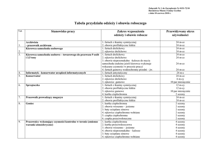 Załącznik Nr 1 do Zarządzenia Nr 0151-72/10 Burmistrza Miasta i Gminy Gryfino z dnia 18 czerwca 2010 r. Tabela przydziału odzieży i obuwia roboczego L.p. 1. 2. 3. Stanowisko pracy Archiwista - pracownik archiwum Kierowca samochodu osobowego Kierowca samochodu osobowo – towarowego do przewozu 9 osób i 3,5 tony 4. 5. Informatyk - konserwator urządzeń informatycznych Konserwator 6. Sprzątaczka 7. Pracownik prowadzący magazyn 8. Goniec 9. Pracownicy wykonujący czynności kontrolne w terenie (zmienne warunki atmosferyczne) Zakres wyposażenia odzieży i obuwie robocze 1. fartuch z tkaniny syntetycznej 2. obuwie profilaktyczne lekkie 1. fartuch drelichowy 2. rękawice drelichowe 1. fartuch drelichowy 2. rękawice drelichowe 3. obuwie nieprzemakalne -kalosze do mycia samochodu (należne jeżeli kierowca wykonuje wskazane czynności w procesie pracy) 4. fartuch gumowy wodoochronny przedni – jw. 1. fartuch antystatyczny 1. fartuch drelichowy 2. rękawice drelichowe 3. rękawice gumowe 1. fartuch z tkaniny syntetycznej 2. obuwie profilaktyczne lekkie 3. rękawice gumowe 4. kurtka ciepłochronna 1. fartuch z tkaniny syntetycznej 2. obuwie profilaktyczne lekkie 1. kurtka ciepłochronna 2. obuwie wiosenno – jesienne 3. buty ocieplane zimowe 4. rękawice ciepłochronne wełniane 5. czapka ciepłochronna 6. czapka przeciwsłoneczna 1. kurtka ciepłochronna 2. kurtka przeciwdeszczowa 3. obuwie wiosenno – jesienne 4. obuwie nieprzemakalne – kalosze 3. buty ocieplane zimowe 4. rękawice ciepłochronne wełniane Przewidywany okres używalności 24 m-ce 24 m-ce 24 m-ce 24 m-ce 24 m-ce 24 m-ce 24 m-ce 24 m-ce 24 m-c 24 m-ce 6 m-cy 10 par miesięcznie 12 m-cy 12 m-cy 10 par miesięcznie 2 sezony 24 m-ce 24 m-ce 2 sezony 2 sezony 2 sezony 2 sezony 2 sezony 2 sezony 4 sezony 4 sezony 4 sezony 4 sezony 4 sezony 4 sezony