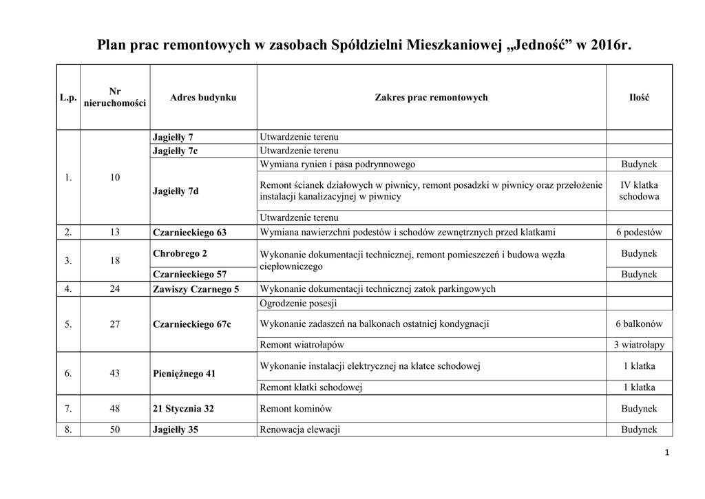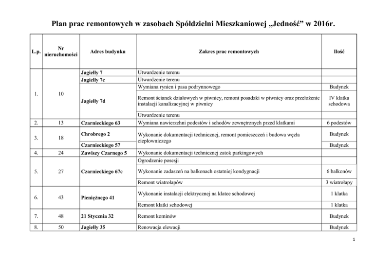 Plan prac remontowych w zasobach Spółdzielni Mieszkaniowej „Jedność” w 2016r. L.p. Nr nieruchomości Adres budynku Jagiełły 7 Jagiełły 7c 1. 10 Jagiełły 7d 2. 13 3. 18 Czarnieckiego 63 Chrobrego 2 4. 24 Czarnieckiego 57 Zawiszy Czarnego 5 5. 27 Czarnieckiego 67c 6. 43 Pieniężnego 41 Zakres prac remontowych Ilość Utwardzenie terenu Utwardzenie terenu Wymiana rynien i pasa podrynnowego Budynek Remont ścianek działowych w piwnicy, remont posadzki w piwnicy oraz przełożenie instalacji kanalizacyjnej w piwnicy IV klatka schodowa Utwardzenie terenu Wymiana nawierzchni podestów i schodów zewnętrznych przed klatkami 6 podestów Wykonanie dokumentacji technicznej, remont pomieszczeń i budowa węzła ciepłowniczego Budynek Budynek Wykonanie dokumentacji technicznej zatok parkingowych Ogrodzenie posesji Wykonanie zadaszeń na balkonach ostatniej kondygnacji 6 balkonów Remont wiatrołapów 3 wiatrołapy Wykonanie instalacji elektrycznej na klatce schodowej 1 klatka Remont klatki schodowej 1 klatka 7. 48 21 Stycznia 32 Remont kominów Budynek 8. 50 Jagiełły 35 Renowacja elewacji Budynek 1 9. 58 10. 71 11. 73 12. 13. Stępowskiego 19 Osiedle Młodych 1 Docieplenie budynku wraz z remontem balkonów Montaż cyfrowego systemu domofonowego Montaż cyfrowego systemu domofonowego Docieplenie stropodachu Osiedle Młodych 2 Docieplenie stropodachu Budynek Osiedle Młodych 5 Osiedle Młodych 6 Nieruchomości gruntowe Nieruchomości budynkowe Docieplenie stropodachu Docieplenie stropodachu Budynek Budynek Stępowskiego 15 Budynek Budynek Wykonanie dokumentacji technicznej miejsc postojowych Wykonawstwo prac instalacyjnych związanych z wymianą poziomów i pionów instalacyjnych w budynkach 2