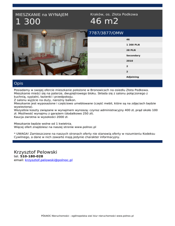 MIESZKANIE na WYNAJEM 1 300 Kraków, os. Złota Podkowa 46 m2 7787/3877/OMW 46 1 300 PLN 28 PLN Secondary 2010 2 2 Adjoining Opis Posiadamy w swojej ofercie mieszkanie położone w Bronowicach na osiedlu Złota Podkowa. Mieszkanie mieści się na paterze, dwupiętrowego bloku. Składa się z salonu połączonego z kuchnią, sypialni, łazienki i przedpokoju. Z salonu wyjście na duży, narożny balkon. Mieszkanie jest wyposażone i częściowo umeblowane (część mebli, które są na zdjęciach będzie wywieziona). Wszystkie koszty związane w wynajmem wynoszą: czynsz administracyjny 400 zł, prąd około 100 zł. Możliwość wynajmu z garażem (dodatkowo 250 zł). Kaucja zwrotna w wysokości 2000 zł. Mieszkanie będzie wolne od 1 kwietnia. Więcej ofert znajdziesz na naszej stronie www.polnoc.pl * UWAGA! Zamieszczone na naszych stronach oferty nie stanowią oferty w rozumieniu Kodeksu Cywilnego, a dane w nich zawarte mają jedynie charakter informacyjny. Krzysztof Pelowski tel. 510-180-028 email: [email protected] PÓŁNOC Nieruchomości - ogólnopolska sieć biur nieruchomości www.polnoc.pl Powered by TCPDF (www.tcpdf.org)
