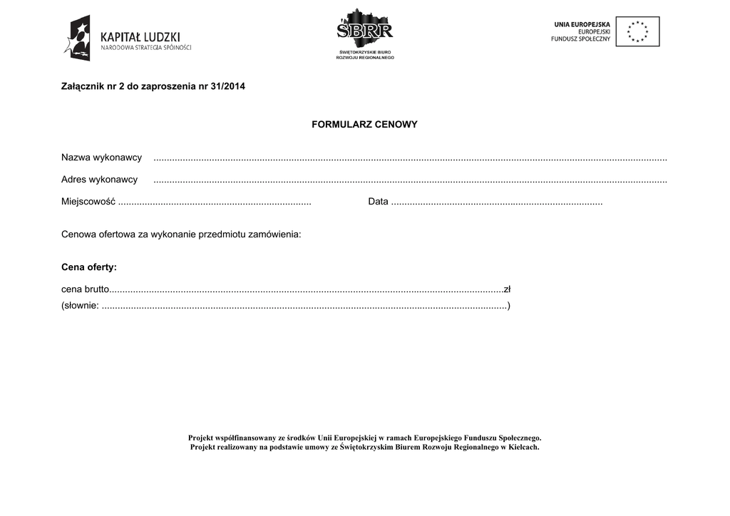 Załącznik nr 2 do zaproszenia nr 31/2014 FORMULARZ CENOWY Nazwa wykonawcy .................................................................................................................................................................................................. Adres wykonawcy .................................................................................................................................................................................................. Miejscowość ......................................................................... Data ................................................................................ Cenowa ofertowa za wykonanie przedmiotu zamówienia: Cena oferty: cena brutto.....................................................................................................................................................zł (słownie: .........................................................................................................................................................) Projekt współfinansowany ze środków Unii Europejskiej w ramach Europejskiego Funduszu Społecznego. Projekt realizowany na podstawie umowy ze Świętokrzyskim Biurem Rozwoju Regionalnego w Kielcach. Dostosowanie pomieszczeń (toalety dla dzieci): zakup wraz z montażem: oddział przedszkolny w Wólce Bałtowskiej Lp. Nazwa Ilość Opis techniczny Cena Wartość Kwota (szt.) jednostkowa netto podatku netto (kol.3xkol.5) VAT 1. Dozownik na mydło 6 Pojemność: 0,5 litra w płynie Materiał obudowy: tworzywo ABS Kolor obudowy: biały Typu dozownik mydła w płynie 0,5l POP lub inny równoważny Dostosowanie pomieszczeń – (toalety dla dzieci) zakup wraz z montażem: oddział przedszkolny w Okole 1. Umywalka z baterią 2 Min. szer. umywalki – 50cm, kolor biały i syfonem 2. Miska ustępowa ze 4 Miska lejowa z odpływem poziomym, kolor spłuczką biały 3. Nakładka sedesowa 4 Miękka w dotyku 4. Podest dziecięcy 4 Wyposażony w powierzchnie antypoślizgowe zapewniające bezpieczeństwo i stabilność. 5. Półeczka na 2 Miejsce na min. 10 kubeczków, zawieszana. kubeczki 6. Podgrzewacz wody 1 Elektryczny, poj. 60l. 7. Lustro 1 Min. wymiar 50 x 60cm 8. Dozownik mydła w 2 Pojemność: 1 litr płynie Materiał obudowy: tworzywo ABS Kolor obudowy: biały, Typu dozownik mydła w płynie 1 l ABS B/S lub inny równoważny. 9. Dozownik na 2 Kolor biały, dozowanie ręczników po jednym ręczniki papierowe listku. Pojemność min. 200szt. ręczników. Typu dozownik mini ręczników Projekt współfinansowany ze środków Unii Europejskiej w ramach Europejskiego Funduszu Społecznego. Projekt realizowany na podstawie umowy ze Świętokrzyskim Biurem Rozwoju Regionalnego w Kielcach. Wartość brutto kol.5+kol.6 wielopanelowych Tork lub inny równoważny. Dostosowanie pomieszczeń – (toalety dla personelu) zakup wraz z montażem: oddział przedszkolny w Okole 1. Umywalka z baterią 2 Min. szer. umywalki – 50cm, kolor biały i syfonem 2. Lustro 2 Min. wymiar 50 x 60cm 3. Podajnik na mydło 2 Pojemność: 1 litr Materiał obudowy: tworzywo ABS Kolor obudowy: biały, Typu dozownik mydła w płynie 1 l ABS B/S lub inny równoważny. 4. Zestaw wc kompakt 4 Zestaw WC kompakt marki Koło Miska kompaktowa z odpływem uniwersalnym - spłuczka z armaturą 3/6l Typu zestaw WC kompakt marki Koło lub inny równoważny. 5. Podajnik ręczników 2 Materiał obudowy: tworzywo ABS Kolor obudowy: biały Typu Podajnik ręczników ZZ ALICANTE lub inny równoważny. Projekt współfinansowany ze środków Unii Europejskiej w ramach Europejskiego Funduszu Społecznego. Projekt realizowany na podstawie umowy ze Świętokrzyskim Biurem Rozwoju Regionalnego w Kielcach.