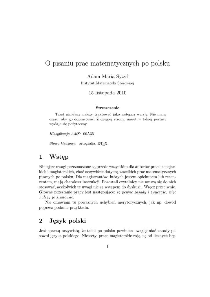 O pisaniu prac matematycznych po polsku Adam Maria Syzyf Instytut Matematyki Stosownej 15 listopada 2010 Streszczenie Tekst niniejszy należy traktować jako wstępną wersję. Nie mam czasu, aby go dopracować. Z drugiej strony, nawet w takiej postaci wydaje się pożyteczny. Klasyfikacja AMS: 00A35 Słowa kluczowe: ortografia, LATEX 1 Wstęp Niniejsze uwagi przeznaczone są przede wszystkim dla autorów prac licencjackich i magisterskich, choć oczywiście dotyczą wszelkich prac matematycznych pisanych po polsku. Dla magistrantów, których jestem opiekunem lub recenzentem, mają charakter instrukcji. Pozostali czytelnicy nie muszą się do nich stosować, aczkolwiek te uwagi nie są wstępem do dyskusji. Wręcz przeciwnie. Główne przesłanie pracy jest następujące: są pewne zasady i zwyczaje, więc należy je szanować. Nie omawiam tu poważnych uchybień merytorycznych, jak np. dowód poprzez podanie przykładu. 2 Język polski Jest sprawą oczywistą, że tekst po polsku powinien uwzględniać zasady pisowni języka polskiego. Niestety, prace magisterskie roją się od licznych błę1 dów, zwłaszcza gramatycznych, interpunkcyjnych i stylistycznych. Wymieńmy kilka najczęściej spotykanych. • Odmiana nazwisk, zwłaszcza obcych. • Rażące jest używanie symboli logicznych takich jak ∀, ∃ itp. jako skrótów odpowiednich wyrażeń. Styl taki, właściwy dla wykładów, kiedy należy szybko coś zapisać na tablicy, jest niedopuszczalny w tekście pisanym. Podobna rzecz ma się z dwukropkiem używanym jako skrót wyrażenia taki, że. • Używanie równoważników zdań zamiast pełnych zdań jest kolejnym przykładem stylu tablicowego. Przykład: Szkielet grafu G - drzewo. • Osobny problem stanowi „amerykanizacja”, która na poziomie ortograficznym przejawia się używaniem dużych liter w takich słowach pospolitych jak twierdzenie, lemat itp. - piszemy je z małej litery także wtedy, gdy mają swój numer, np. twierdzenie 3.2. • Użycie słów w niewłaściwym znaczeniu, np. lemat jako wniosek. • Zbyt lekki styl: zdefiniujemy sobie. 3 Tekst matematyczny Tekst matematyczny nie powinien się składać z ciągu twierdzeń bez żadnych słów pomiędzy nimi. Szczególnie rażące są długie ciągi definicji. Powszechnie przyjmuje się, że symbole matematyczne pisane są kursywą. Pozwala to m.in. na odróżnienie wyrazów jednoliterowych jak „i” lub „a” od symboli i lub a. Z kolei w wyrażeniach typu sin x, „sin” jest słowem (skrótem od słowa „sinus”) i powinno być złożone czcionką zwykłą. Uwaga ta dotyczy oczywiście także innych nazw funkcji i w ogóle wszelkich nazw lub ich skrótów, np. sup (kres górny), lim (granica), czy ln (logarytm naturalny). Wyjątek stanowią nazwy jedoliterowe, np. e. Piszemy zatem f (x), a nie f(x). Warto także pamiętać o różnicy między anglosaską i kontynentalną (zatem polską) pisownią wielu funkcji. Tabela 1. ma charakter przykładowy i nie rości sobie żadnych pretensji do zupełności. Zwrócić należy uwagę na kilka spraw: 2 Nazwa Europa kontynentalna kraje anglosaskie (w tym Polska) tangens tg tan arcus tangens arctg atan tangens hiberboliczny tgh tanh logarytm naturalny ln log rotacja rot curl Tabela 1: Zestawienie funkcji matematycznych, których symbole w języku angielskim i polskim są różne • Nie powinno się rozpoczynać zdania od symbolu matematycznego, np. I jest zwarty. • Dotyczy to także - a może zwłaszcza - początku zdania podrzędnego lub nadrzędnego w zdaniu złożonym. Na przykład: Dla tak określonych funkcji f i g, g ◦ f jest iniekcją i suriekcją. • Należy unikać podawania w postaci cyfr tych liczb, które łatwo wyrazić słownie, tj. piszemy: trzy składowe wektora, a nie: 3 składowe. • W języku polskim używamy przecinka dziesiętnego (nie kropki jak Anglosasi). • Przed liczbami ujemnymi stawiamy znak minus, np. −1 (a nie znak pauzy „-1”). • Przy potęgowym zapisie liczb konieczne jest użycie kropki oznaczającej iloczyn, np. 6, 62 · 10−27 . 3.1 O formie Na zakończenie powiedzmy parę słów o samej formie pisania prac. Forma jest oczywiście przede wszystkim sprawą autora, dlatego uwagi poniższe traktować należy jako sprawy do rozważenia, a nie jako reguły do ścisłego stosowania. W pracach matematycznych przyjął się zwyczaj pisania w pierwszej osobie liczby mnogiej, niezależnie od liczby autorów. 3 Współczesne edytory tekstów (w tym także LATEX) dają niemal nieograniczone możliwości odnośnie wielkości, kroju czy grubości liter, stylów pisma itp. Moim zdaniem, im mniej z tych możliwości korzystamy, tym lepiej. Praktycznie, nie ma potrzeby w „zwykłym tekście” używania więcej niż trzech krojów pisma. Tekst zasadniczy powinien być złożony jedną czcionką. Jak mówiliśmy, do symboli matematycznych, wzorów, tekstów twiedzeń itp. używamy kursywy, a jeżeli chcemy na coś szczególnie zwrócić uwagę, to używamy czcionki pogrubionej (bold). Pamiętajmy, że tekst, który piszemy, zapewne będziemy musieli zreferować. Nie używajmy więc symboli, których napisanie na tablicy może sprawiać problemy. Korzystnym zwyczajem jest numerowanie wzorów końcowych, czy też wyznaczających ważne etapy rozumowania, pozostawiając nienumerowane pośrednie etapy przekształceń. Jako zasadę można przyjąć, aby numerować jedynie te wzory, do których się odwołujemy. W artykułach naukowych numerujemy wzory kolejnymi liczbami naturalnymi. W przypadku dłuższych prac (książki) wprowadzamy numerację podwójną, w której pierwsza liczba jest numerem rozdziału, druga - numerem wzoru wewnątrz rozdziału. Nie należy też nadużywać odwoływań do wzorów, twierdzeń itp. poprzez podanie ich numerów, zwłaszcza jeśli można tego uniknąć po prostu przypominając, co trzeba. Zawsze lepiej się czyta: „...jak wiemy z twierdzenia Pitagorasa, c2 = a2 + b2 ”, niż „...stosujemy wzó