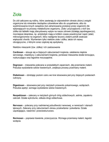 Zioła Do ziół zaliczane są rośliny, które zawierają (w odpowiednim okresie zbioru) związki organiczne lub mineralne niezbędne człowiekowi albo do uzupełnienia, albo do wyeliminowania innych związków (lub zahamowania produkcji przez organizm) źle wpływających na procesy metaboliczne organizmu. Zioła i przyrządzone z nich tzw. ziółka lub tabletki mają zdecydowany wpływ na nasze zdrowie (działają zapobiegawczo), mocniejsze lekarstwa, np. antybiotyki mają w krótkim czasie powstrzymać napór (atak) mikroorganizmów na organizm, który następnie leczony ziołami potrafi zwalczać większość chorób. Wymieniam tylko niektóre zioła i ziółka, także ich nazwy obcojęzyczne, z którymi coraz częściej się spotykamy. Niektóre mieszanki (tzw. ziółka) i ich zastosowanie Cardiosan – stosuje się w lżejszych zaburzeniach krążenia, osłabienia mięśnia sercowego, miażdżycy z zaburzeniami krążenia, ponieważ mieszanka działa tonizująco, rozkurczająco oraz łagodnie moczopędnie. Degrosan – mieszanka polecana w przewlekłych zaparciach, złej przemianie materii. Pobudza wydzielanie soków trawiennych, zwiększa procesy przemiany materii. Diabetosan – obniżając poziom cukru we krwi stosowana jest przy lżejszych postaciach cukrzycy. Digestosan – stosowana jest przy nieżytach przewodu pokarmowego, wzdęciach. Pobudza apetyt, wzmaga wydzielanie soków trawiennych. Neopektosan – zalecany w nieżytach górnych dróg oddechowych, astmie, zapaleniu oskrzeli. Działa wykrztunie, odkaża drogi oddechowe. Nervosan – polecany przy nadmiernej pobudliwości nerwowej, w nerwicach i stanach lękowych. Zalecany przy zaburzeniach okresu przekwitania i pokwitania. Działa uspokajająco, nasennie i przeciwskurczowo. Normosan – poprawia trawienie, przeczyszcza. Wzmaga przemianę materii, łagodzi wzdęcia. Pektosan – polecana w nieżytach górnych dróg oddechowych, przy przeziębieniach z silnym kaszlem. Działa wykrztuśnie, odkażając górne drogi oddechowe. Pulmosan – działa rozkurczająco, przeciwgorączkowo, wzmaga przemianę materii, hamuje krwawienia. Lek uzupełniający przy leczeniu schorzeń płucnych. Pyrosan – mieszanka polecana w grypie, przeziębieniu i stanach gorączkowych. Działa przeciwgorączkowo i napotnie. Rektosan – stosowana jest przy żylakach odbytu. Działa przeciwzapalnie, przeciwkrwotocznie i ściągająco. Reumosan – stosowana w schorzeniach reumatycznych i artretycznych, przy zapaleniu korzonków nerwowych i przy dna. Składniki mieszanki działają przeciwreumatycznie i moczopędnie. Septosan – stosowany do płukania jamy ustnej i gardła w ostrym i przewlekłym nieżycie, przy stanach zapalnych ozębnej, dziąseł, usuwając przy tym przykry zapach z jamy ustnej. Sklerosan – ziółka stosuje się w miażdżycy i nadciśnieniu tętniczym. Wskazują działanie przeciwmiażdżycowe i obniżają ciśnienie krwi. Tannosan – stosujemy w przewlekłej biegunce, nieżycie jelit, bólach żołądka. Jest przeciwbiegunkowa i rozkurczająca. Urosan – stosujemy przy przewlekłych schorzeniach pęcherza moczowego i miedniczek nerkowych. Działa odkażająco na drogi moczowe. Vagosan – działa ściągająco, przeciwzapalnie i przeciwskurczowo. Stosujemy do płukania pochwy w stanach zapalnych, przy upławach oraz do przemywań przymoczek i do nasiadówek. Stosowanie ziół w niektórych najbardziej rozpowszechnionych chorobach Alergia – ziele doględy, kwiat dziewanny, ziele ostrożenia warzywnego, kwiat rumianku, liść szałwii. Astma – świeży liść aloesu, korzeń biedrzeńca, czosnek, liść podbiału, liść pokrzyku, ziele doględy, liść bielunia, ziele stroiczki. Bezsenność – kwiat maku polnego, korzeń kozłka, szyszki chmielowe, liść melisy. Biegunka – liść borówki brusznicy i czernicy, kora dębowa, liść babki lancetowatej, liść jeżyny, orzecha włoskiego i maliny, kora kasztanowca, kłącze pięciornika i wężownika, ziele rzepiku, pięciornika gęsiego i rdestu ptasiego, korzeń rzewienia. Ból głowy – ziele dziurawca, liść melisy i ruty, kłącze tataraku, korzeń waleriany, kwiat lawendy i lipy. Cukrzyca – liść pokrzywy, orzecha włoskiego i borówki czernicy, korzeń łopianu, marchwi i mniszka, czosnek, strąki fasoli, ziele rutwicy. Dna – podagra lub artretyzm – korzeń chrzanu, mniszka, wilżycy, ziele koniczyny czerwonej, marzanki, nawłoci, ogórecznika, owsa, robinii akacjowej, kłącze perzu, owoc pieprzowca. Egzema – ziele skrzypu, rzepiku, nostrzyka, lnicy, bluszczyka, kwiat arniki, dziewanny, krwawnika, nagietka, rumianku, słonecznika, pączki brzozowe, szyszki chmielowe, korzeń łopianu, kłącze tataraku, liść szałwii. Gościec – liść brzozy, aloesu, znamię kukurydzy, kwiat wiązówki, robinii akacjowej, nasienie kasztanowca, gorczycy białej, gorczycy czarnej, ziele koniczyny czerwonej, ostrożenia warzywnego, owsa, rdestu ptasiego i uczepu trójlistkowego. Gruźlica – ziele poziewnika, rdestu ptasiego, miodunki, skrzypu, porost islandzki. Grypa – kwiat słonecznika, wiązówki, bzu czarnego, kwiatostan lipy, owoc maliny, rokitnika, dzikiej róży, ziele ogórecznika i fiołka trójbarwnego, pączki topolowe, kora wierzby. Impotencja – kwiat nagietka, kocanki, ziele dziurawca, nasienie kozieradki, korzeń waleriany, ziele krwawnika, kłącze tataraku. Kamica moczowa – liść mącznicy lekarskiej, berberysu, borówki brusznicy, brzozy, ziele nawłoci, skrzypu, połonicznika, ostrożenia warzywnego, koniczyny czerwonej, owsa, rdestu ptasiego, korzeń pietruszki, wilżycy ciernistej, strąki fasoli, kwiat tarniny i robinii. Kamica żółciowa – liść mięty, berberysu, ziele dymnicy, glistnika, szanty, rdestu ptasiego, korzeń mniszka i świeżej rzodkwii, kwiat kocanki. Kurzajki – korzeń mniszka, ziele glistnika, korzeń glistnika. Liszaje – czosnek świeży, kwiat nagietka, liść orzecha włoskiego, świeży liść aloesu. Ł