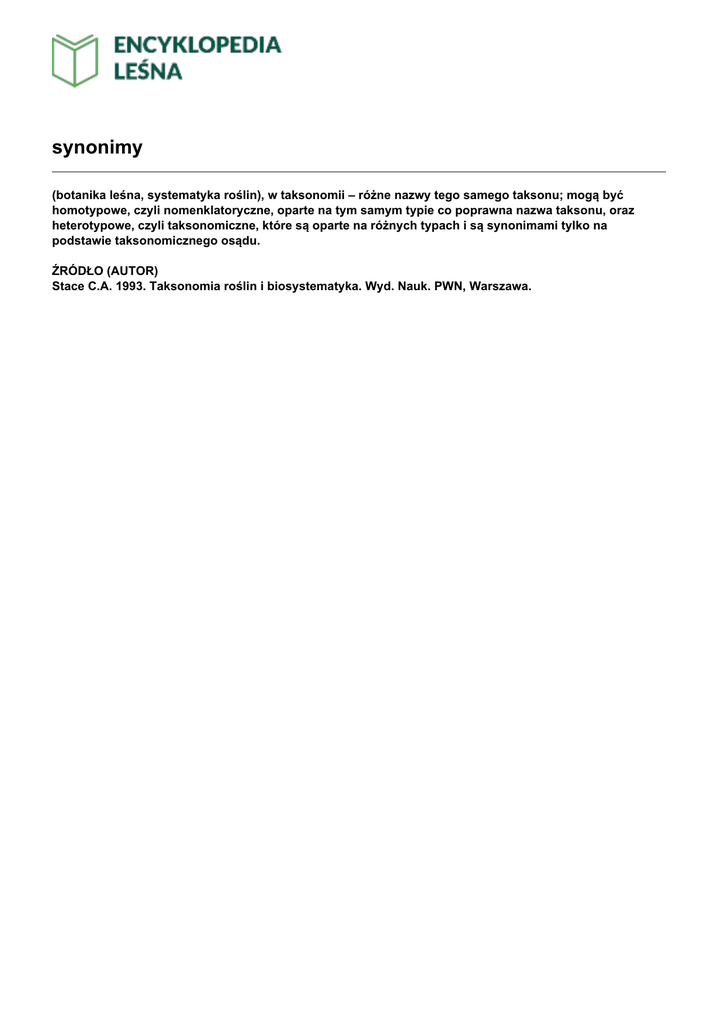synonimy (botanika leśna, systematyka roślin), w taksonomii – różne nazwy tego samego taksonu; mogą być homotypowe, czyli nomenklatoryczne, oparte na tym samym typie co poprawna nazwa taksonu, oraz heterotypowe, czyli taksonomiczne, które są oparte na różnych typach i są synonimami tylko na podstawie taksonomicznego osądu. ŹRÓDŁO (AUTOR) Stace C.A. 1993. Taksonomia roślin i biosystematyka. Wyd. Nauk. PWN, Warszawa.