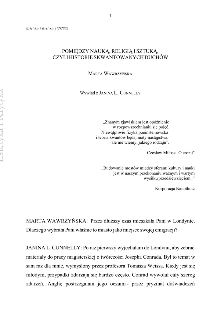 Estetyka i Krytyka 1 Estetyka i Krytyka 1(2)2002 POMIĘDZY NAUKĄ, RELIGIĄ I SZTUKĄ, CZYLI HISTORIE SKWANTOWANYCH DUCHÓW MARTA WAWRZYŃSKA Wywiad z JANINĄ L. CUNNELLY „Znanym zjawiskiem jest opóźnienie w rozpowszechnianiu się pojęć. Niewątpliwie fizyka poeinsteinowska i teoria kwantów będą miały następstwa, ale nie wiemy, jakiego rodzaju”. Czesław Miłosz "O erozji" „Budowanie mostów między sferami kultury i nauki jest w naszym przekonaniu ważnym i wartym wysiłku przedsięwzięciem..” Korporacja Nanothinc MARTA WAWRZYŃSKA: Przez dłuższy czas mieszkała Pani w Londynie. Dlaczego wybrała Pani właśnie to miasto jako miejsce swojej emigracji? JANINA L. CUNNELLY: Po raz pierwszy wyjechałam do Londynu, aby zebrać materiały do pracy magisterskiej o twórczości Josepha Conrada. Był to temat w sam raz dla mnie, wymyślony przez profesora Tomasza Weissa. Kiedy jest się młodym, przypadki zdarzają się bardzo często. Conrad wywołał cały szereg zdarzeń. Anglię postrzegałam jego oczami - przez pryzmat doświadczeń Estetyka i Krytyka 2 emigranta z wyboru. Bardzo mi odpowiadała taka postawa i taka percepcja rzeczywistości. MARTA WAWRZYŃSKA: W Pani twórczości można odnaleźć pewne elementy poetyki Conrada, na przykład liczne sentencje i uogólnienia oraz motywy wierności i zdrady. Na ile jest to Pani własne (artystyczne) doświadczenie, a na ile wpływ autora Lorda Jima? JANINA L. CUNNELLY: Tematem mojej pracy magisterskiej była problematyka wierności i zdrady w twórczości Josepha Conrada. Miałam 23 lata i zagadnienia te wydały mi się ważne, i są dla mnie takimi nadal. Życie każdego człowieka można przedstawić poprzez wierność i zdradę. Są to pojęcia o rodowodzie rycersko-romantycznym, bardzo bliskie kulturze śródziemnomorskiej. Wymagają akceptacji określonej hierarchii wartości, wobec których człowiek się sprawdza. Kultura to domena wartości. MARTA WAWRZYŃSKA: Czy Londyn (nazywany często stolicą polskiej emigracji) stał się dla Pani prywatną ojczyzną, miejscem, z którym można się utożsamiać? JANINA L. CUNNELLY: Londyn nigdy nie był moją ojczyzną, z Anglią nigdy się nie utożsamiałam. Dowodem tego jest fakt, że piszę po polsku, i wybór ten był świadomy. Natomiast w Anglii dojrzałam intelektualnie i tego zmienić nie mogę. Chodzi tu o przywiązanie do pewnego stylu myślenia, z którym wiąże się także sposób postrzegania świata. MARTA WAWRZYŃSKA: Można powiedzieć, że ukształtowały Panią przede wszystkim dwie tradycje: angielska i polska. Która z nich miała dla Pani największe znaczenie? Estetyka i Krytyka 3 JANINA L. CUNNELLY: Tradycje te zostały przemieszane - każdej coś zawdzięczam. Doświadczenie z Anglii wpłynęło na moją młodość. I to było naturalne. Polskie doświadczenie zyskało kontekst, nigdy nie było marginalizowane, ale też ideologiczna ocena rzeczywistości została całkowicie przewartościowana. Zostało to, co najważniejsze, czego naruszać nie wolno. MARTA WAWRZYŃSKA: A jednak w Pani najważniejszej książce - w Ogonie rajskiego ptaka - tradycja polska nie odgrywa tak istotnej roli, jak na przykład aluzje i odniesienia do kultury Zachodu. JANINA L. CUNNELLY: Moja intelektualna dojrzałość związana jest z Anglią. W Ogonie rajskiego ptaka pojawia się bohater z Polski - Piotr. Wchodzi on w rzeczywistość Zachodu tak, jak ja w nią wchodziłam - na równych prawach. To jest moje doświadczenie, stąd też aluzje do kultury Zachodu nie są czymś sztucznym. Pisałam o rzeczywistości, którą znałam, i o rzeczywistości wyobrażonej. Pamiętam, że po powrocie z Anglii spotkałam ludzi, których nie byłam w stanie odnieść do żadnej tradycji. Myślę, że PRL wytworzyła bardzo specyficzną kulturę, czy subkulturę, którą lepiej było ocenić oddalając się od niej. MARTA WAWRZYŃSKA: Podstawową zasadą konstrukcyjną Pani powieści jest gra ze schematem utworu sensacyjnego. Takie zacieranie granic między sztuką wysokoartystyczną a popularną budzi niepokój wielu myślicieli, przekonanych, że jest to świadectwo upadku kultury, a nie jej wyzwolenia. Czy słuszne są te obawy? Co, według Pani, najlepiej uzasadnia wywyższanie (dowartościowanie) sztuki niskiej? JANINA L. CUNNELLY: Nie sądzę, by można było dzisiaj obronić czystość gatunków. Rozwój nauk ścisłych, technologia i zaawansowana komunikacja społeczna, a także postępująca globalizacja tworzą nowe Estetyka i Krytyka 4 zapotrzebowania, gdyż zmienia się percepcja rzeczywistości. Kultura jest sferą dynamiczną, powinna w istocie wyprzedzać społeczne i gospodarcze zmiany. Tej roli, niestety, dziś nie spełnia, nie dlatego, że stoi na straży czystości gatunków, ale dlatego, że nie może się wyleczyć z upadku klasycznej wizji świata. Powieści sensacyjne są zawsze bardzo poczytne, co można tłumaczyć na różne sposoby, ale faktem jest, że są one w swej strukturze bliższe nowoczesnej komunikacji, aniżeli klasyczne powieści obyczajowe. MARTA WAWRZYŃSKA: W Ogonie rajskiego ptaka nauki ścisłe (głównie matematyka, nowa fizyka) występują na wielu płaszczyznach, tłumaczą zachowania bohaterów, współtworzą artystyczną wizję. Jakie znaczenie mają dla literatury? Czy mogą dać odpowiedź na problemy trudne do rozstrzygnięcia, związane ze sferą ducha ? JANINA L. CUNNELLY: Owszem, inspiracją Ogona rajskiego ptaka była nowa fizyka, której usiłuję się nauczyć. Stanowi ona przełom kopernikański w nauce, lecz kultura tego faktu nie odnotowała albo uczyniła to w sposób nieświadomy. Zjawisko cząstek elementarnych zmusza do nowego myślenia o rzeczywistości, zmianie uległa na przykład koncepcja przyczyny i skutku. Filozoficzne implikacje nowej fizyki są ogromne. Wszechświat jawi się jako niepodzielna całość, w której istnieją fale prawdopodobieństwa i one decydują o dynamice całego systemu. Świadomość nie jes