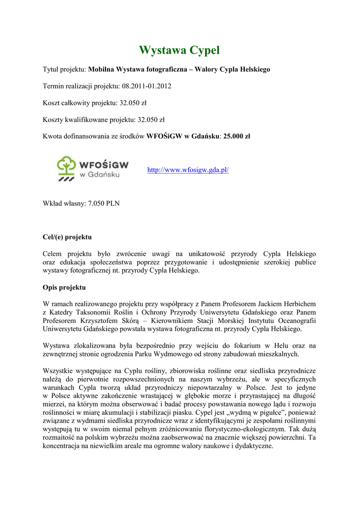 Wystawa Cypel Tytuł projektu: Mobilna Wystawa fotograficzna – Walory Cypla Helskiego Termin realizacji projektu: 08.2011-01.2012 Koszt całkowity projektu: 32.050 zł Koszty kwalifikowane projektu: 32.050 zł Kwota dofinansowania ze środków WFOŚiGW w Gdańsku: 25.000 zł http://www.wfosigw.gda.pl/ Wkład własny: 7.050 PLN Cel/(e) projektu Celem projektu było zwrócenie uwagi na unikatowość przyrody Cypla Helskiego oraz edukacja społeczeństwa poprzez przygotowanie i udostępnienie szerokiej publice wystawy fotograficznej nt. przyrody Cypla Helskiego. Opis projektu W ramach realizowanego projektu przy współpracy z Panem Profesorem Jackiem Herbichem z Katedry Taksonomii Roślin i Ochrony Przyrody Uniwersytetu Gdańskiego oraz Panem Profesorem Krzysztofem Skórą – Kierownikiem Stacji Morskiej Instytutu Oceanografii Uniwersytetu Gdańskiego powstała wystawa fotograficzna nt. przyrody Cypla Helskiego. Wystawa zlokalizowana była bezpośrednio przy wejściu do fokarium w Helu oraz na zewnętrznej stronie ogrodzenia Parku Wydmowego od strony zabudowań mieszkalnych. Wszystkie występujące na Cyplu rośliny, zbiorowiska roślinne oraz siedliska przyrodnicze należą do pierwotnie rozpowszechnionych na naszym wybrzeżu, ale w specyficznych warunkach Cypla tworzą układ przyrodniczy niepowtarzalny w Polsce. Jest to jedyne w Polsce aktywne zakończenie wrastającej w głębokie morze i przyrastającej na długość mierzei, na którym można obserwować i badać procesy powstawania nowego lądu i rozwoju roślinności w miarę akumulacji i stabilizacji piasku. Cypel jest „wydmą w pigułce”, ponieważ związane z wydmami siedliska przyrodnicze wraz z identyfikującymi je zespołami roślinnymi występują tu w swoim niemal pełnym zróżnicowaniu florystyczno-ekologicznym. Tak dużą rozmaitość na polskim wybrzeżu można zaobserwować na znacznie większej powierzchni. Ta koncentracja na niewielkim areale ma ogromne walory naukowe i dydaktyczne. Poniżej przedstawiamy kilka zdjęć wystawy oraz zachęcamy do jej obejrzenia!