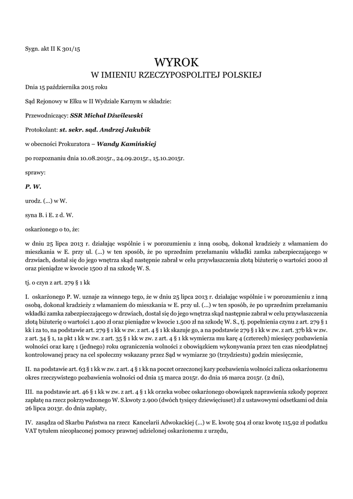 Sygn. akt II K 301/15 WYROK W IMIENIU RZECZYPOSPOLITEJ POLSKIEJ Dnia 15 października 2015 roku Sąd Rejonowy w Ełku w II Wydziale Karnym w składzie: Przewodniczący: SSR Michał Dźwilewski Protokolant: st. sekr. sąd. Andrzej Jakubik w obecności Prokuratora – Wandy Kamińskiej po rozpoznaniu dnia 10.08.2015r., 24.09.2015r., 15.10.2015r. sprawy: P. W. urodz. (...) w W. syna B. i E. z d. W. oskarżonego o to, że: w dniu 25 lipca 2013 r. działając wspólnie i w porozumieniu z inną osobą, dokonał kradzieży z włamaniem do mieszkania w E. przy ul. (...) w ten sposób, że po uprzednim przełamaniu wkładki zamka zabezpieczającego w drzwiach, dostał się do jego wnętrza skąd następnie zabrał w celu przywłaszczenia złotą biżuterię o wartości 2000 zł oraz pieniądze w kwocie 1500 zł na szkodę W. S. tj. o czyn z art. 279 § 1 kk I. oskarżonego P. W. uznaje za winnego tego, że w dniu 25 lipca 2013 r. działając wspólnie i w porozumieniu z inną osobą, dokonał kradzieży z włamaniem do mieszkania w E. przy ul. (...) w ten sposób, że po uprzednim przełamaniu wkładki zamka zabezpieczającego w drzwiach, dostał się do jego wnętrza skąd następnie zabrał w celu przywłaszczenia złotą biżuterię o wartości 1.400 zł oraz pieniądze w kwocie 1.500 zł na szkodę W. S., tj. popełnienia czynu z art. 279 § 1 kk i za to, na podstawie art. 279 § 1 kk w zw. z art. 4 § 1 kk skazuje go, a na podstawie 279 § 1 kk w zw. z art. 37b kk w zw. z art. 34 § 1, 1a pkt 1 kk w zw. z art. 35 § 1 kk w zw. z art. 4 § 1 kk wymierza mu karę 4 (czterech) miesięcy pozbawienia wolności oraz karę 1 (jednego) roku ograniczenia wolności z obowiązkiem wykonywania przez ten czas nieodpłatnej kontrolowanej pracy na cel społeczny wskazany przez Sąd w wymiarze 30 (trzydziestu) godzin miesięcznie, II. na podstawie art. 63 § 1 kk w zw. z art. 4 § 1 kk na poczet orzeczonej kary pozbawienia wolności zalicza oskarżonemu okres rzeczywistego pozbawienia wolności od dnia 15 marca 2015r. do dnia 16 marca 2015r. (2 dni), III. na podstawie art. 46 § 1 kk w zw. z art. 4 § 1 kk orzeka wobec oskarżonego obowiązek naprawienia szkody poprzez zapłatę na rzecz pokrzywdzonego W. S.kwoty 2.900 (dwóch tysięcy dziewięciuset) zł z ustawowymi odsetkami od dnia 26 lipca 2013r. do dnia zapłaty, IV. zasądza od Skarbu Państwa na rzecz Kancelarii Adwokackiej (...) w E. kwotę 504 zł oraz kwotę 115,92 zł podatku VAT tytułem nieopłaconej pomocy prawnej udzielonej oskarżonemu z urzędu, V. zasądza od oskarżonego na rzecz Skarbu Państwa kwotę 619,92 zł tytułem zwrotu kosztów ustanowienia obrońcy z urzędu, VI. zwalnia oskarżonego od ponoszenia pozostałych kosztów sądowych i obciąża nimi Skarb Państwa. Sygn. akt II K 301/15 UZASADNIENIE Na podstawie całokształtu materiału dowodowego zgromadzonego w niniejszej sprawie Sąd ustalił następujący stan faktyczny: w lipcu 2013r. P. W. wraz z innymi osobami postanowił udać się na kilka dni na M. z zamiarem dokonywania kradzieży z włamaniem w przypadkowo wybranych miejscowościach. W wykonaniu ww. ustaleń, w dniu 25 lipca 2013r. w E. przy ul. (...), P. W.działając wspólnie i w porozumieniu z inną osobą, pokonał zamek w drzwiach przy użycia dwuszczękowego klucza nastawnego poprzez przełamanie wkładki zamka. Z mieszkania należącego doW. S. zabrał złotą biżuterię o wartości 1.400 zł oraz pieniądze w kwocie 1.500 zł. W analogiczny sposób postąpił w Z. przy ul. (...), działając wówczas wspólnie i w porozumieniu z P. P. Powyższy stan faktyczny Sąd ustalił na podstawie następujących dowodów: - częściowo wyjaśnień oskarżonego – k. 183, 119-121, 124, - zeznań świadka W. S.– k. 1-3, 9-10, - protokołu oględzin – k. 6-8, - notatki – k. 21, - opinii – k. 26-27, 133-134, - dokumentacji fotograficznej – k. 36, - odpisu wyroku – k. 129-130. OskarżonyP. W.pierwotnie nie przyznał się do popełnienia zarzucanego mu czynu, ale złożył wniosek o wydanie wyroku skazującego bez przeprowadzenia rozprawy. Przesłuchany ponownie, przyznał się do zarzucanego mu czynu i ponowił wniosek o wydanie wyroku skazującego w wymiarze 1 roku i 2 miesięcy pozbawienia wolności oraz orzeczenia obowiązku naprawienia szkody. W postępowaniu sądowym oskarżony odwołał swoje uprzednie przyznanie. Stwierdził, iż jego postawa wynikała z namowy policji i prokuratora oraz chęci uniknięcia pobytu w zakładzie karnym. Dodał też, że nie wyklucza, że w dniu 25.07.2013r. był na terenie E., a ponadto, w sprawie II K 366/13 Sądu Rejonowego w Zambrowie nie przyznał się do zarzucanej mu kradzieży z włamaniem, ale i tak został skazany. Tylko relację oskarżonego zawierającą bezpośrednie przyznanie się do winy Sąd uznał za miarodajną dla poczynienia ustaleń. Pomimo lakoniczności, możliwa jest jej weryfikacja w oparciu o kilka podstawowych dowodów wskazujących jednoznacznie na określony modus operandi sprawców kradzieży z włamaniem posługujących się tym samym narzędziem w różnych miejscach i powiązanie ww. zachowań z konkretnymi osobami. Implikacją powyższego było odrzucenie wersji P. W.dotyczącej motywów uprzedniego przyznania się. A zatem pewne jest, że w dniu 31.07.2013r. oskarżony wraz z P. P. dokonali kradzieży z włamaniem do mieszkania położonego w Z. przy ul. (...) w określony sposób, tj. posługując się kluczem nastawnym dwuszczękowym (vide wyrok – k. 129-130, niekwestionowana opinia mechanoskopijna, której wnioski nie budzą merytorycznych wątpliwości, a zostały poprzedzone prawidłowym wnioskowaniem w oparciu o jednoznaczne kryteria metodologiczne – k. 133-134). Pewne też jest, że sprawcy kradzieży z włamaniem do mieszkania przy ul. (...) w E. używali tego samego narzędzia i zabezpieczenie mieszkania przełamali w ten sam sposób (vide niekwestionowane: opinia – k. 26-27, 133-134, protokół oględzin – k. 6-8, dokumen