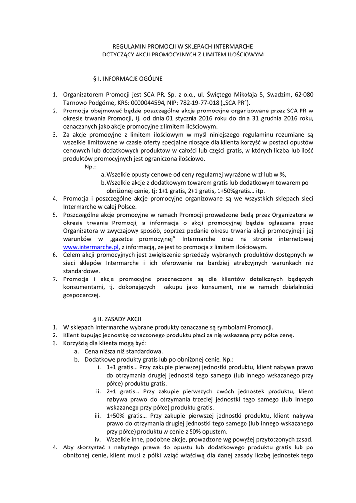 REGULAMIN PROMOCJI W SKLEPACH INTERMARCHE DOTYCZĄCY AKCJI PROMOCYJNYCH Z LIMITEM ILOŚCIOWYM § I. INFORMACJE OGÓLNE 1. Organizatorem Promocji jest SCA PR. Sp. z o.o., ul. Świętego Mikołaja 5, Swadzim, 62-080 Tarnowo Podgórne, KRS: 0000044594, NIP: 782-19-77-018 („SCA PR”). 2. Promocja obejmować będzie poszczególne akcje promocyjne organizowane przez SCA PR w okresie trwania Promocji, tj. od dnia 01 stycznia 2016 roku do dnia 31 grudnia 2016 roku, oznaczanych jako akcje promocyjne z limitem ilościowym. 3. Za akcje promocyjne z limitem ilościowym w myśl niniejszego regulaminu rozumiane są wszelkie limitowane w czasie oferty specjalne niosące dla klienta korzyść w postaci opustów cenowych lub dodatkowych produktów w całości lub części gratis, w których liczba lub ilość produktów promocyjnych jest ograniczona ilościowo. Np.: a. Wszelkie opusty cenowe od ceny regularnej wyrażone w zł lub w %, b. Wszelkie akcje z dodatkowym towarem gratis lub dodatkowym towarem po obniżonej cenie, tj: 1+1 gratis, 2+1 gratis, 1+50%gratis… itp. 4. Promocja i poszczególne akcje promocyjne organizowane są we wszystkich sklepach sieci Intermarche w całej Polsce. 5. Poszczególne akcje promocyjne w ramach Promocji prowadzone będą przez Organizatora w okresie trwania Promocji, a informacja o akcji promocyjnej będzie ogłaszana przez Organizatora w zwyczajowy sposób, poprzez podanie okresu trwania akcji promocyjnej i jej warunków w „gazetce promocyjnej” Intermarche oraz na stronie internetowej www.intermarche.pl, z informacją, że jest to promocja z limitem ilościowym. 6. Celem akcji promocyjnych jest zwiększenie sprzedaży wybranych produktów dostępnych w sieci sklepów Intermarche i ich oferowanie na bardziej atrakcyjnych warunkach niż standardowe. 7. Promocja i akcje promocyjne przeznaczone są dla klientów detalicznych będących konsumentami, tj. dokonujących zakupu jako konsument, nie w ramach działalności gospodarczej. § II. ZASADY AKCJI 1. W sklepach Intermarche wybrane produkty oznaczane są symbolami Promocji. 2. Klient kupując jednostkę oznaczonego produktu płaci za nią wskazaną przy półce cenę. 3. Korzyścią dla klienta mogą być: a. Cena niższa niż standardowa. b. Dodatkowe produkty gratis lub po obniżonej cenie. Np.: i. 1+1 gratis… Przy zakupie pierwszej jednostki produktu, klient nabywa prawo do otrzymania drugiej jednostki tego samego (lub innego wskazanego przy półce) produktu gratis. ii. 2+1 gratis… Przy zakupie pierwszych dwóch jednostek produktu, klient nabywa prawo do otrzymania trzeciej jednostki tego samego (lub innego wskazanego przy półce) produktu gratis. iii. 1+50% gratis… Przy zakupie pierwszej jednostki produktu, klient nabywa prawo do otrzymania drugiej jednostki tego samego (lub innego wskazanego przy półce) produktu w cenie z 50% opustem. iv. Wszelkie inne, podobne akcje, prowadzone wg powyżej przytoczonych zasad. 4. Aby skorzystać z nabytego prawa do opustu lub dodatkowego produktu gratis lub po obniżonej cenie, klient musi z półki wziąć właściwą dla danej zasady liczbę jednostek tego samego (lub innego wskazanego przy półce) produktu i przedstawić ją w kasie. System kasowy w takim przypadku naliczy cenę właściwą po opuście lub po przeliczeniu zgodnej z zasadą akcji liczby produktów gratis. 5. Klient ma prawo do wielokrotnego skorzystania z zakupu w ramach akcji promocyjnej, z zastrzeżeniem, że dla wybranych akcji maksymalna liczba transakcji promocyjnych z jakiej może skorzystać jeden klient wynosi dokładnie tyle ile wynosi limit dla pojedynczych jednostek produktowych. Tzn. a. Przykład 1. Klient biorący udział w limitowanej promocji produktu „A”, limitowanego do 6 szt., polegającej na upuście X% ma prawo z tym upustem zakupić 6 takich produktów. Kolejne zakupy dokonywane są w cenie standardowej i nie są objęte akcją promocyjną. b. Przykład 2. Klient biorący udział w limitowanej promocji produktu „A”, limitowanego do 6 szt, polegającej na sprzedaży 2+1 gratis ma prawo do 6 takich transakcji, co oznacza ilość produktów wyrażoną równaniem: 2x6+1x6 = 18 produktów. Kolejne będzie musiał zakupić w cenie standardowej, bez promocji 2+1gratis. 6. W przypadku produktów „na wagę” limitem jest określona w gazetce promocyjnej liczba kilogramów. 7. Akcje objęte limitem ilościowym oznaczone są w gazetce promocyjnej tekstem: „PROMOCJA DLA KLIENTÓW DETALICZNYCH, MAKSYMALNA LICZBA NA JEDNEGO KLIENTA WYNOSI:…” Dla każdego produktu objętego limitem zostanie dokładnie określona liczba maksymalna. 8. Zwyczajowo, poza sytuacjami wyjątkowymi, ilość wyznaczającą limit dla każdego produktu będzie równa ilości pojedynczych sztuk w opakowaniu zbiorczym. 9. Produkty objęte akcjami promocyjnymi są widocznie oznaczone przy półkach w sklepach Intermarche oraz w ofercie: „gazetce promocyjnej” Intermarche i na stronie internetowej www.intermarche.pl. Produkty mają oznaczoną cenę standardową oraz zasady promocji tj. wysokość opustu cenowego lub skrócone zasady otrzymania przez klienta całości lub części produktu gratis. 10. W przypadku niektórych promocji z opustem cenowym oraz wszystkich promocji z całością towaru lub jego częścią gratis, ostateczna cena jaką zapłaci klient może być dla niego widoczna dopiero przy kasie. W przypadku tych akcji cena towaru eksponowana przy półce jest ceną standardową i jest wyraźnie oznaczona tekstem „RABAT NALICZANY PRZY KASIE”, co oznacza że właściwą ostateczną cenę jaką zapłaci klient po uwzględnieniu zasad akcji promocyjnej będzie cena naliczona przez system kasowy. § II. POSTANOWIENIA KOŃCOWE 1. Klient przystępując do udziału w Promocji i akcjach promocyjnych Intermarche akceptuje zasady ich prowadzenia zawarte w niniejszym regulaminie. 2. Kasjerzy w sklepach Intermarche mają prawo odmówić sprzedaży na zasadach promocyjnych klientom nie dokonując