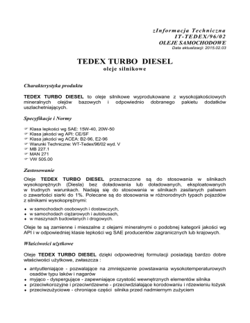 z I n f o rm a c ja Te c h n i c z n a I T- TE DE X / 9 6 / 0 2 OLEJE SAMOCHODOWE Data aktualizacji: 2015.02.03 TEDEX TURBO DIESEL oleje silnikowe Charakterystyka produktu TEDEX TURBO DIESEL to oleje silnikowe wyprodukowane z wysokojakościowych mineralnych olejów bazowych i odpowiednio dobranego pakietu dodatków uszlachetniających. Specyfikacje i Normy Klasa lepkości wg SAE: 15W-40, 20W-50 Klasa jakości wg API: CE/SF Klasa jakości wg ACEA: B2-96, E2-96 Warunki Techniczne: WT-Tedex/96/02 wyd. V MB 227.1 MAN 271 VW 505.00 Zastosowanie Oleje TEDEX TURBO DIESEL przeznaczone są do stosowania w silnikach wysokoprężnych (Diesla) bez doładowania lub doładowanych, eksploatowanych w trudnych warunkach. Nadają się do stosowania w silnikach zasilanych paliwem o zawartości siarki do 1%. Polecane są do stosowania w różnorodnych typach pojazdów z silnikami wysokoprężnymi: w samochodach osobowych i dostawczych, w samochodach ciężarowych i autobusach, w maszynach budowlanych i drogowych. Oleje te są zamienne i mieszalne z olejami mineralnymi o podobnej kategorii jakości wg API i w odpowiedniej klasie lepkości wg SAE producentów zagranicznych lub krajowych. Właściwości użytkowe Oleje TEDEX TURBO DIESEL dzięki odpowiedniej formulacji posiadają bardzo dobre właściwości użytkowe, zwłaszcza : antyutleniające - pozwalające na zmniejszenie powstawania wysokotemperaturowych osadów typu laków i nagarów myjąco - dyspergujące - zapewniające czystość wewnętrznych elementów silnika przeciwkorozyjne i przeciwrdzewne - przeciwdziałające korodowaniu i rdzewieniu łożysk przeciwzużyciowe - chroniące części silnika przed nadmiernym zużyciem A także w przypadku oleju wielosezonowego w klasie lepkości SAE 15W-40 właściwości: lepkościowo - temperaturowe - zapewniające bezproblemowy rozruch zimnego silnika przy ujemnych temperaturach otoczenia oraz niezawodne smarowanie w całym zakresie temperatur pracy silnika. Własności fizyko-chemiczne - wartości typowe TEDEX TURBO DIESEL SAE 15W-40 20W-50 14,4 17,5 Lepkość kinematyczna w 100°C, mm2/s Wskaźnik lepkości 136 125 9000 Lepkość strukturalna w -15°C, mPa∙s, 6600 - 20°C, mPa∙s, 230 238 Temperatura zapłonu, °C -33 -30 Temperatura płynięcia, °C Liczba zasadowa (TBN), mg KOH/g 10.5 10,7 Popiół siarczanowy, % wag. 1,26 1,26 Podane parametry są danymi standardowymi, zastrzegamy sobie prawo zmian wynikających z postępu technicznego. Własności BHP i przeciwpożarowe oleje nie zawierają w swoim składzie substancji toksycznych lotność olejów w stosunku do eteru bardzo mała ciecze trudno palne, skłonność do samozapalenia niska klasa niebezpieczeństwa pożarowego - IV Przechowywanie i transport Oleje TEDEX TURBO DIESEL należy przechowywać w opakowaniach zamkniętych, które chronią je przed dostępem wilgoci, wody i zanieczyszczeń mechanicznych. Oleje mogą być przewożone środkami transportu kolejowego i samochodowego, zarówno luzem jak i w beczkach oraz innych opakowaniach jednostkowych - nie stwarzają zagrożeń. Informacje o stosowaniu olejów i smarów TEDEX udziela : T E D EX S . A . 9 7 - 2 0 0 Tomaszów Mazowiecki,Cygan2 tel. (0-44) 724 95 62, (0-44) 725 29 15
