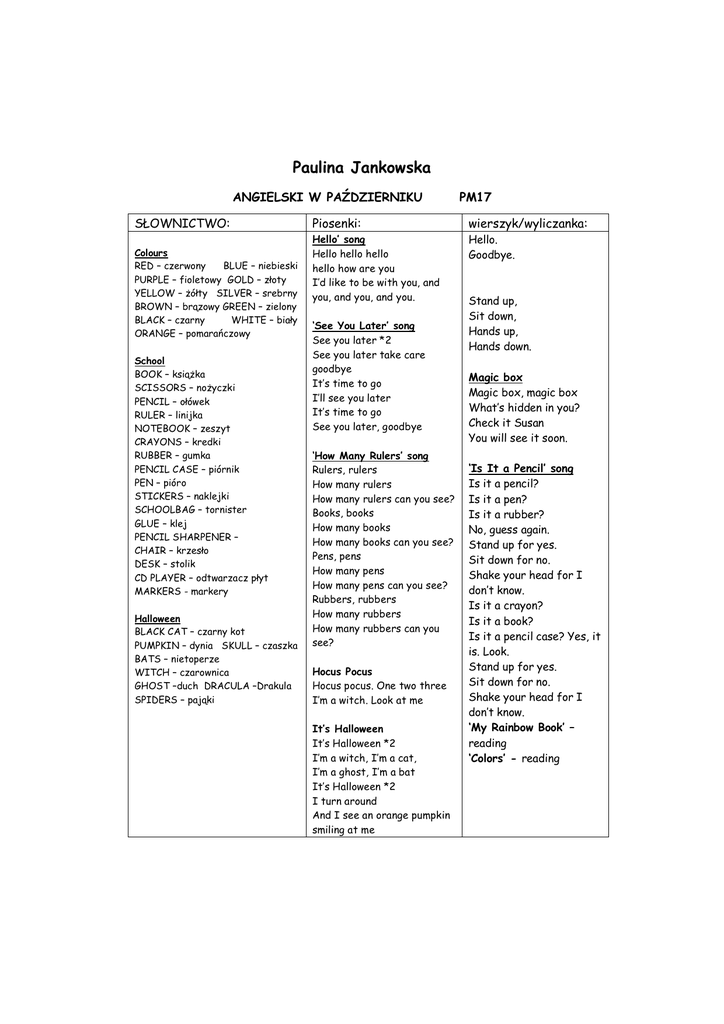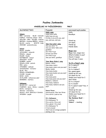 Paulina Jankowska ANGIELSKI W PAŹDZIERNIKU SŁOWNICTWO: Colours RED – czerwony BLUE – niebieski PURPLE – fioletowy GOLD – złoty YELLOW – żółty SILVER – srebrny BROWN – brązowy GREEN – zielony BLACK – czarny WHITE – biały ORANGE – pomarańczowy School BOOK – książka SCISSORS – nożyczki PENCIL – ołówek RULER – linijka NOTEBOOK – zeszyt CRAYONS – kredki RUBBER – gumka PENCIL CASE – piórnik PEN – pióro STICKERS – naklejki SCHOOLBAG – tornister GLUE – klej PENCIL SHARPENER – CHAIR – krzesło DESK – stolik CD PLAYER – odtwarzacz płyt MARKERS - markery Halloween BLACK CAT – czarny kot PUMPKIN – dynia SKULL – czaszka BATS – nietoperze WITCH – czarownica GHOST –duch DRACULA –Drakula SPIDERS – pająki PM17 Piosenki: wierszyk/wyliczanka: Hello’ song Hello hello hello hello how are you I’d like to be with you, and you, and you, and you. Hello. Goodbye. ‘See You Later’ song See you later *2 See you later take care goodbye It’s time to go I’ll see you later It’s time to go See you later, goodbye ‘How Many Rulers’ song Rulers, rulers How many rulers How many rulers can you see? Books, books How many books How many books can you see? Pens, pens How many pens How many pens can you see? Rubbers, rubbers How many rubbers How many rubbers can you see? Hocus Pocus Hocus pocus. One two three I’m a witch. Look at me It’s Halloween It’s Halloween *2 I’m a witch, I’m a cat, I’m a ghost, I’m a bat It’s Halloween *2 I turn around And I see an orange pumpkin smiling at me Stand up, Sit down, Hands up, Hands down. Magic box Magic box, magic box What’s hidden in you? Check it Susan You will see it soon. ‘Is It a Pencil’ song Is it a pencil? Is it a pen? Is it a rubber? No, guess again. Stand up for yes. Sit down for no. Shake your head for I don’t know. Is it a crayon? Is it a book? Is it a pencil case? Yes, it is. Look. Stand up for yes. Sit down for no. Shake your head for I don’t know. ‘My Rainbow Book’ – reading ‘Colors’ - reading