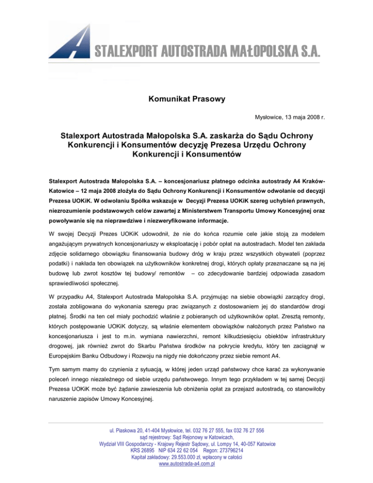 STALEXPORT AUTOSTRADA MAŁOPOLSKA S.A. Komunikat Prasowy Mysłowice, 13 maja 2008 r. Stalexport Autostrada Małopolska S.A. zaskarża do Sądu Ochrony Konkurencji i Konsumentów decyzję Prezesa Urzędu Ochrony Konkurencji i Konsumentów Stalexport Autostrada Małopolska S.A. – koncesjonariusz płatnego odcinka autostrady A4 KrakówKatowice – 12 maja 2008 złożyła do Sądu Ochrony Konkurencji i Konsumentów odwołanie od decyzji Prezesa UOKiK. W odwołaniu Spółka wskazuje w Decyzji Prezesa UOKiK szereg uchybień prawnych, niezrozumienie podstawowych celów zawartej z Ministerstwem Transportu Umowy Koncesyjnej oraz powoływanie się na nieprawdziwe i niezweryfikowane informacje. W swojej Decyzji Prezes UOKiK udowodnił, że nie do końca rozumie cele jakie stoją za modelem angażującym prywatnych koncesjonariuszy w eksploatację i pobór opłat na autostradach. Model ten zakłada zdjęcie solidarnego obowiązku finansowania budowy dróg w kraju przez wszystkich obywateli (poprzez podatki) i nakłada ten obowiązek na użytkowników konkretnej drogi, których opłaty przeznaczane są na jej budowę lub zwrot kosztów tej budowy/ remontów – co zdecydowanie bardziej odpowiada zasadom sprawiedliwości społecznej. W przypadku A4, Stalexport Autostrada Małopolska S.A. przyjmując na siebie obowiązki zarządcy drogi, została zobligowana do wykonania szeregu prac związanych z dostosowaniem jej do standardów drogi płatnej. Środki na ten cel miały pochodzić właśnie z pobieranych od użytkowników opłat. Zresztą remonty, których postępowanie UOKiK dotyczy, są właśnie elementem obowiązków nałożonych przez Państwo na koncesjonariusza i jest to m.in. wymiana nawierzchni, remont kilkudziesięciu obiektów infrastruktury drogowej, jak również zwrot do Skarbu Państwa środków na pokrycie kredytu, który ten zaciągnął w Europejskim Banku Odbudowy i Rozwoju na nigdy nie dokończony przez siebie remont A4. Tym samym mamy do czynienia z sytuacją, w której jeden urząd państwowy chce karać za wykonywanie poleceń innego niezależnego od siebie urzędu państwowego. Innym tego przykładem w tej samej Decyzji Prezesa UOKiK może być żądanie zawieszenia lub obniżenia opłat za przejazd autostradą, co stanowiłoby naruszenie zapisów Umowy Koncesyjnej. ul. Piaskowa 20, 41-404 Mysłowice, tel. 032 76 27 555, fax 032 76 27 556 sąd rejestrowy: Sąd Rejonowy w Katowicach, Wydział VIII Gospodarczy - Krajowy Rejestr Sądowy, ul. Lompy 14, 40-057 Katowice KRS 26895 NIP 634 22 62 054 Regon: 273796214 Kapitał zakładowy: 29.553.000 zł, wpłacony w całości www.autostrada-a4.com.pl STALEXPORT AUTOSTRADA MAŁOPOLSKA S.A. Spółka nie zgadza się również z twierdzeniem Prezesa UOKiK, ze pobierane, także w czasie trwania prac drogowych, opłaty za przejazd autostradą są zbyt wysokie. Niewystarczająco przekonujące dla UOKiK okazały się tłumaczenia, że od wprowadzenia w 2006 roku poboru opłat na obecnym poziomie, pomimo wzrostu inflacji, stawki opłat pozostały niezmienione i stanowią niecałe 60% maksymalnej ustalonej możliwej stawki dla samochodów osobowych. W swoim odwołaniu Spółka wnosi również, że stawki na kwestionowanym, stałym poziomie były akceptowane przez GDDKiA i wprowadzone w 2006 roku, czyli w czasie kiedy dokładnie znany był już zakres prac remontowych przewidzianych na A4 w latach 2006-09. Tak więc planowane utrudnienia musiały już wtedy zostać wzięte pod uwagę – co zresztą wynika z dokumentów zgromadzonych w sprawie. Inną sprawą jest, że nigdzie na świecie, na żadnej autostradzie, stawki opłat za przejazd nie ulegają pomniejszeniu w związku z prowadzonymi pracami remontowymi. Stalexport Autostrada Małopolska S.A. zwraca również uwagę na szereg gołosłownych i nieprawdziwych argumentów jakie znalazły się w uzasadnieniu Decyzji Prezesa UOKiK. Dla przykładu, prezes UOKiK stwierdza w uzasadnieniu swojej Decyzji, że utrudnienia powodowały zdecydowane pogorszenie warunków bezpieczeństwa przejazdu i zwiększyły ryzyko wypadku. Jest to tyle nie poparte jakimikolwiek faktami, co nieprawdziwe. W rzeczywistości liczba wypadków na A4 w okresach remontów utrzymywała się na takim samym poziomie, jak w okresach przed rozpoczęciem robót – co na pewno nie może być postrzegane jako dowód na poparcie tezy stawianej przez Prezesa UOKiK. Innym przykładem powoływania się na nieprawdziwe informacje w uzasadnieniu Decyzji jest twierdzenie, że Spółka prowadziła roboty remontowe na odcinkach rzekomo przekraczających dozwolone łączne długości. Prawda jest natomiast taka, że w Umowie Koncesyjnej nie istnieje żaden zapis zobowiązujący koncesjonariusza do zachowania określonej długości odcinków jezdni wyłączonych z ruchu, a same przykłady wykazywane przez Prezesa UOKiK są nieprawdziwe ponieważ odnoszą się do innych kwestii. W złożonym wczoraj odwołaniu od Decyzji prezesa UOKiK, Stalexport Autostrada Małopolska S.A. potrzymała swoją wcześniejszą argumentację, zarzucając Urzędowi poważne błędy prawne. Dotyczą one m.in. faktu, że prezes UOKiK nie jest organem odpowiednim do rozstrzygania w tego rodzaju sprawach oraz że opłaty pobierane za przejazd autostradą na rzecz i w imieniu Skarbu Państwa, jak to ma miejsce w tym przypadku, nie podlegają przepisom ustawy antymonopolowej. Zgodnie bowiem z licznymi wykładniami (w tym wyrokiem Trybunału Konstytucyjnego), opłata za przejazd autostradą nie jest ceną za przejazd, a opłatą o charakterze daniny publicznej, podobnie jak winiety. Główne wady prawne Decyzji prezesa UOKiK: • W polskim systemie prawnym budowa i eksploatacja autostrad należy do zadań Państwa. Zgodnie z przepisami ustawy o drogach publicznych funkcję zarządcy dróg krajowych, w którego zakresie ul. Piaskowa 20, 41-404 Mysłowice, tel. 032 76 27 555, fax 032 76 27 556 sąd rejestrowy: Sąd Rejonowy w Katowicach, Wydział VIII Gospodarczy - Krajowy 