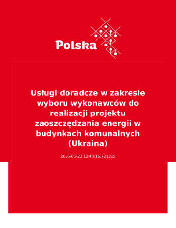 Usługi doradcze w zakresie wyboru wykonawców do realizacji projektu zaoszczędzania energii w budynkach komunalnych (Ukraina) 2016-05-23 12:40:16.721285 2 3 Ta oferta nie stanowi informacji handlowej Dane kontaktowe Nordycka Ekologiczna Korporacja Finansowa (NEFCO) FI-00171 Helsinki Fabianinkatu 34 Finlandia Osoba kontaktowa Amund Beitnes [email protected], [email protected] Tel: +358 10 618 0658 www.nefco.org/sites/nefco.org/files/pdf-files/invitation4eoi_fcc_ukraine_esc _4.5.2016.pdf Opis przedmiotu zamówienia Usługi doradcze w zakresie wyboru wykonawców do realizacji projektu zaoszczędzania energii w budynkach komunalnych (Ukraina) (w ramach projektu: „Energy Saving Credits” finansowanego ze środków kredytowych Nordyckiej Ekologicznej Korporacji Finansowej (NEFCO)) Nazwa instytucji ogłaszającej przetarg: Nordycka Ekologiczna Korporacja Finansowa (NEFCO); P.O. Box 249, Fabianinkatu 34, FI-00171 Helsinki, Finland Rodzaj ogłoszenia: Zapytanie o wyrażenie zainteresowania (Invitation for expression of interest) Planowany budżet projektu: 300 000 EUR Termin składania ofert: 27 maja 2016 roku Rodzaj przetargu: Przetarg otwarty Państwo/Rynek: Ukraina Informacje uzupełniające Temat przetargu, zakres: Konkurs na wybór czterech Konsultantów do dokonania oceny i wstępnego wyboru wykonawców prac w ramach projektu Nordyckiej 4 Ekologicznej Korporacji Finansowej (NEFCO) pt. „Energy Saving Credits” dotyczącego finansowania działań na rzecz oszczędzania energii w budynkach komunalnych, np. szkołach, przedszkolach, szpitalach i in. CPV ● ● Usługi architektoniczne, budowlane, inżynieryjne i kontrolne Usługi biznesowe: prawnicze, marketingowe, konsultingowe, rekrutacji, drukowania i zabezpieczania Forma przetargu Międzynarodowy Kraj Finlandia Zakres przetargu Osoba kontaktowa: p. Amund Beitnes, Starszy Doradca Inwestycyjny, tel: +358 10 618 0658, e-mail: [email protected], [email protected] Informacja o przetargu na stronie internetowej: http://www.nefco.org/sites/nefco.org/files/pdf-files/invitation4eoi_fcc_ukraine_esc_4.5 .2016.pdf http://www.nefco.org/sites/nefco.org/files/pdf-files/tor_esc_fcc_-_schedule_a_4.5.201 6.pdf Adres WWW www.nefco.org/sites/nefco.org/files/pdf-files/invitation4eoi_fcc_ukraine_esc_4.5.2016 .pdf Termin składania ofert 27.05.2016 5 Ważna od 23.05.2016 Branże Energia i surowce odnawialne, Doradztwo/consulting/edukacja, Budownictwo i architektura, 6