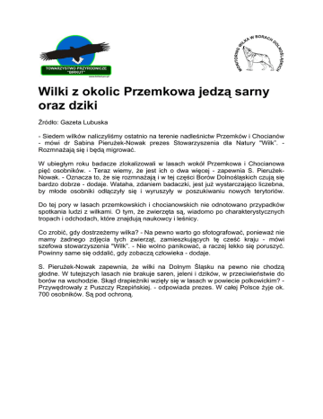 Wilki z okolic Przemkowa jedzą sarny oraz dziki Źródło: Gazeta Lubuska - Siedem wilków naliczyliśmy ostatnio na terenie nadleśnictw Przemków i Chocianów - mówi dr Sabina Pierużek-Nowak prezes Stowarzyszenia dla Natury "Wilk”. Rozmnażają się i będą migrować. W ubiegłym roku badacze zlokalizowali w lasach wokół Przemkowa i Chocianowa pięć osobników. - Teraz wiemy, że jest ich o dwa więcej - zapewnia S. PierużekNowak. - Oznacza to, że się rozmnażają i w tej części Borów Dolnośląskich czują się bardzo dobrze - dodaje. Wataha, zdaniem badaczki, jest już wystarczająco liczebna, by młode osobniki odłączyły się i wyruszyły w poszukiwaniu nowych terytoriów. Do tej pory w lasach przemkowskich i chocianowskich nie odnotowano przypadków spotkania ludzi z wilkami. O tym, że zwierzęta są, wiadomo po charakterystycznych tropach i odchodach, które znajdują naukowcy i leśnicy. Co zrobić, gdy dostrzeżemy wilka? - Na pewno warto go sfotografować, ponieważ nie mamy żadnego zdjęcia tych zwierząt, zamieszkujących tę cześć kraju - mówi szefowa stowarzyszenia "Wilk”. - Nie wolno panikować, a raczej lekko się poruszyć. Powinny same się oddalić, gdy zobaczą człowieka - dodaje. S. Pierużek-Nowak zapewnia, że wilki na Dolnym Śląsku na pewno nie chodzą głodne. W tutejszych lasach nie brakuje saren, jeleni i dzików, w przeciwieństwie do borów na wschodzie. Skąd drapieżniki wzięły się w lasach w powiecie polkowickim? Przywędrowały z Puszczy Rzepińskiej. - odpowiada prezes. W całej Polsce żyje ok. 700 osobników. Są pod ochroną.