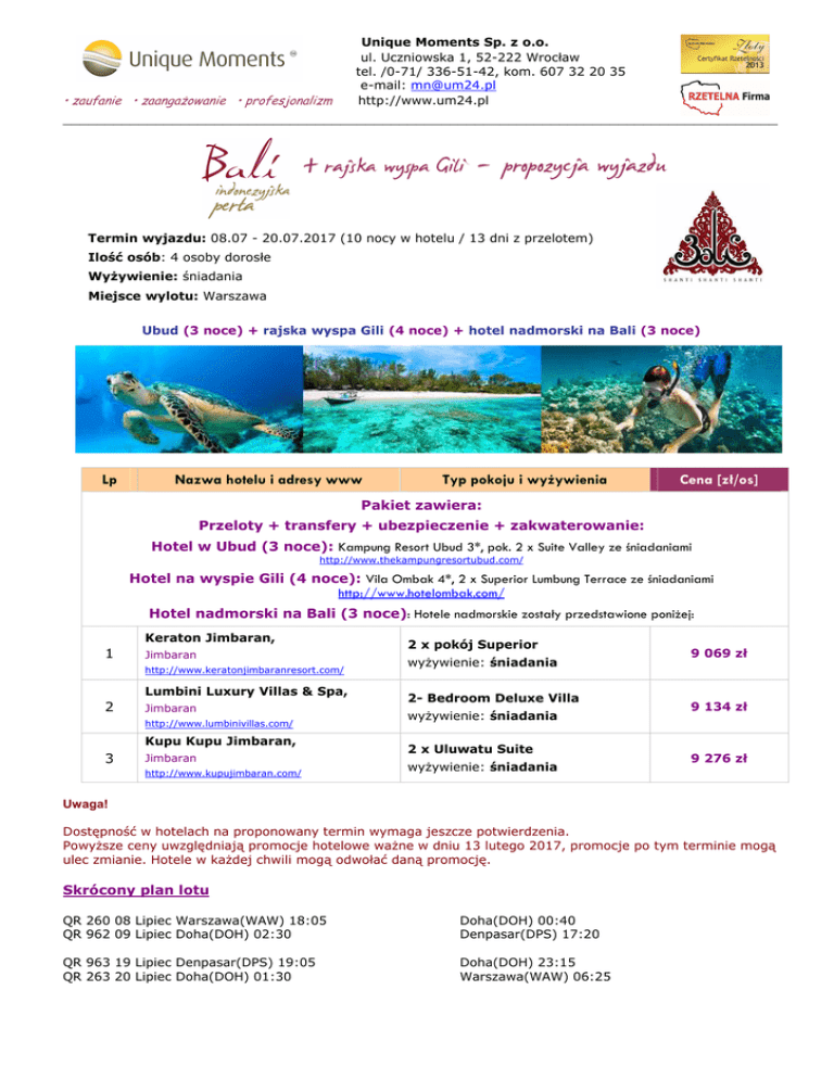 • zaufanie • zaangażowanie • profesjonalizm Unique Moments Sp. z o.o. ul. Uczniowska 1, 52-222 Wrocław tel. /0-71/ 336-51-42, kom. 607 32 20 35 e-mail: [email protected] http://www.um24.pl _____________________________________________________________________________________ + rajska wyspa Gili - propozycja wyjazdu Termin wyjazdu: 08.07 - 20.07.2017 (10 nocy w hotelu / 13 dni z przelotem) Ilość osób: 4 osoby dorosłe Wyżywienie: śniadania Miejsce wylotu: Warszawa Ubud (3 noce) + rajska wyspa Gili (4 noce) + hotel nadmorski na Bali (3 noce) Lp Nazwa hotelu i adresy www Typ pokoju i wyżywienia Cena [zł/os] Pakiet zawiera: Przeloty + transfery + ubezpieczenie + zakwaterowanie: Hotel w Ubud (3 noce): Kampung Resort Ubud 3*, pok. 2 x Suite Valley ze śniadaniami http://www.thekampungresortubud.com/ Hotel na wyspie Gili (4 noce): Vila Ombak 4*, 2 x Superior Lumbung Terrace ze śniadaniami http://www.hotelombak.com/ Hotel nadmorski na Bali (3 noce): Hotele nadmorskie zostały przedstawione poniżej: Keraton Jimbaran, 1 Jimbaran http://www.keratonjimbaranresort.com/ Lumbini Luxury Villas & Spa, 2 Jimbaran http://www.lumbinivillas.com/ Kupu Kupu Jimbaran, 3 Jimbaran http://www.kupujimbaran.com/ 2 x pokój Superior wyżywienie: śniadania 2- Bedroom Deluxe Villa wyżywienie: śniadania 2 x Uluwatu Suite wyżywienie: śniadania 9 069 zł 9 134 zł 9 276 zł Uwaga! Dostępność w hotelach na proponowany termin wymaga jeszcze potwierdzenia. Powyższe ceny uwzględniają promocje hotelowe ważne w dniu 13 lutego 2017, promocje po tym terminie mogą ulec zmianie. Hotele w każdej chwili mogą odwołać daną promocję. Skrócony plan lotu QR 260 08 Lipiec Warszawa(WAW) 18:05 QR 962 09 Lipiec Doha(DOH) 02:30 Doha(DOH) 00:40 Denpasar(DPS) 17:20 QR 963 19 Lipiec Denpasar(DPS) 19:05 QR 263 20 Lipiec Doha(DOH) 01:30 Doha(DOH) 23:15 Warszawa(WAW) 06:25 Cena wyjazdu (za osobę) zawiera: - przelot w 2 strony z Warszawy na Bali ze wszystkimi opłatami renomowanymi liniami - przywitanie na lotnisku przez polskiego rezydenta, przekazanie najważniejszych informacji i karty do telefonu oraz transfery luksusowym mini-busem na trasie lotnisko-hotel-lotnisko oraz hotel-port-hotel - transfery szybką łodzią motorową pomiędzy Bali a Gili Trawangan - zakwaterowanie w wybranych hotelach w Ubud (3 noce), na Gili Trawangan (4 noce) i na Bali (3 noce) - opiekę profesjonalnego polskiego rezydenta na Bali - ubezpieczenie KL(30.000 EUR), NNW(NWI 15.000 PLN i NWS 7.500 PLN) oraz bagażu (2.000 PLN)TU Signal Iduna - najwyższej jakości obsługę podczas wyjazdu Cena nie zawiera: - dodatkowych atrakcji i wycieczek - dodatkowych napoi i posiłków Warunki płatności: - I rata w wysokości 30 % wartości rezerwacji przy dokonaniu rezerwacji (po wpłacie I raty wystawiamy w 24h ‘elektroniczne bilety lotnicze’ (w 2 strony)). - II rata w wysokości 70 % wartości rezerwacji na 30 dni przed planowanym wyjazdem Oferta wymaga potwierdzenia, ze względu na brak rezerwacji biletów lotniczych. Do rezerwacji biletów wymagane są imiona i nazwiska wszystkich potencjalnych pasażerów. Istnieje możliwość wystawienia faktury VAT (VAT 0%). Treść usługi do uzgodnienia. Decydując się na wyjazd z naszym Biurem otrzymuje Pani rabat w wysokości 2,5% ważny 1 rok na inne egzotyczne kierunki. Zapraszamy! Oferta ważna do dnia 15.02.2017r.
