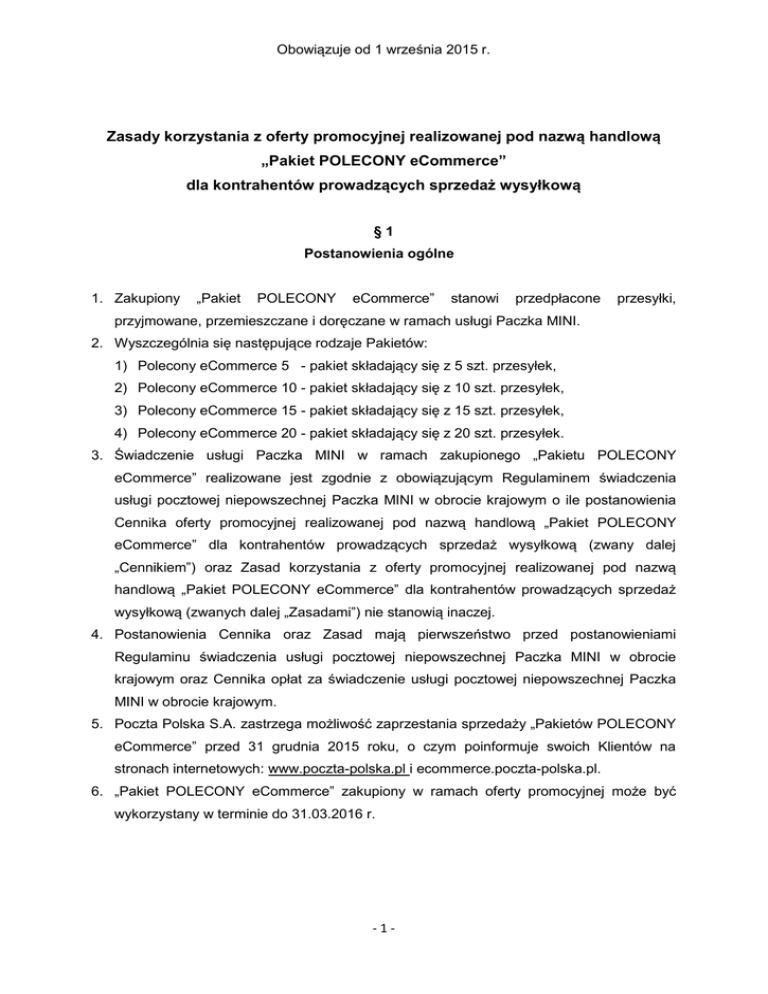 Obowiązuje od 1 września 2015 r. Zasady korzystania z oferty promocyjnej realizowanej pod nazwą handlową „Pakiet POLECONY eCommerce” dla kontrahentów prowadzących sprzedaż wysyłkową §1 Postanowienia ogólne 1. Zakupiony „Pakiet POLECONY eCommerce” stanowi przedpłacone przesyłki, przyjmowane, przemieszczane i doręczane w ramach usługi Paczka MINI. 2. Wyszczególnia się następujące rodzaje Pakietów: 1) Polecony eCommerce 5 - pakiet składający się z 5 szt. przesyłek, 2) Polecony eCommerce 10 - pakiet składający się z 10 szt. przesyłek, 3) Polecony eCommerce 15 - pakiet składający się z 15 szt. przesyłek, 4) Polecony eCommerce 20 - pakiet składający się z 20 szt. przesyłek. 3. Świadczenie usługi Paczka MINI w ramach zakupionego „Pakietu POLECONY eCommerce” realizowane jest zgodnie z obowiązującym Regulaminem świadczenia usługi pocztowej niepowszechnej Paczka MINI w obrocie krajowym o ile postanowienia Cennika oferty promocyjnej realizowanej pod nazwą handlową „Pakiet POLECONY eCommerce” dla kontrahentów prowadzących sprzedaż wysyłkową (zwany dalej „Cennikiem”) oraz Zasad korzystania z oferty promocyjnej realizowanej pod nazwą handlową „Pakiet POLECONY eCommerce” dla kontrahentów prowadzących sprzedaż wysyłkową (zwanych dalej „Zasadami”) nie stanowią inaczej. 4. Postanowienia Cennika oraz Zasad mają pierwszeństwo przed postanowieniami Regulaminu świadczenia usługi pocztowej niepowszechnej Paczka MINI w obrocie krajowym oraz Cennika opłat za świadczenie usługi pocztowej niepowszechnej Paczka MINI w obrocie krajowym. 5. Poczta Polska S.A. zastrzega możliwość zaprzestania sprzedaży „Pakietów POLECONY eCommerce” przed 31 grudnia 2015 roku, o czym poinformuje swoich Klientów na stronach internetowych: www.poczta-polska.pl i ecommerce.poczta-polska.pl. 6. „Pakiet POLECONY eCommerce” zakupiony w ramach oferty promocyjnej może być wykorzystany w terminie do 31.03.2016 r. -1- §2 Warunki korzystania z oferty 1. Oferta promocyjna „Pakiet POLECONY eCommerce” przeznaczona jest dla podmiotów prowadzących sprzedaż wysyłkową (zwanych dalej „Klientami”). 2. Oferta promocyjna „Pakiet POLECONY eCommerce” nie jest przeznaczona dla konsumentów, w rozumieniu art. 221 Kodeksu cywilnego. 3. „Pakiet POLEOCNY eCommerce” świadczony jest na terenie Rzeczpospolitej Polskiej. 4. Aby skorzystać z oferty promocyjnej „Pakiet POLECONY eCommerce” należy złożyć zamówienie na stronie internetowej ecommerce.poczta-polska.pl. 5. Złożenie zamówienia na „Pakiet POLECONY eCommerce” stanowi potwierdzenie, iż Klient zapoznał się i akceptuje Cennik oraz Zasady, co potwierdza na złożonym Formularzu zamówienia. 6. Klient może zamówić „Pakiet POLECONY eCommerce” całodobowo przez 7 dni w tygodniu na stronie internetowej ecommerce.poczta-polska.pl poprzez wypełnienie Formularza zamówienia, z zastrzeżeniem, że zamówienia złożone w dniu roboczym po godzinie 15:00, w sobotę albo w dni ustawowo wolne od pracy traktowane są jak złożone w następnym dniu roboczym. 7. Po złożeniu zamówienia i dokonaniu wpłaty przelewem elektronicznym za wybrany „Pakiet POLECONY eCommerce” (dokonanie wpłaty jest jednym z elementów zamówienia; po dokonaniu przelewu Klient jest automatycznie przekierowany na stronę ecommerce.poczta-polska.pl celem zakończenia zamówienia), zamówienie zostaje przyjęte do realizacji. 8. Umowę zakupu „Pakietu POLECONY eCommerce” uważa się za zawartą z chwilą zaksięgowania na koncie bankowym Poczty Polskiej S.A. wpłaty w wysokości odpowiadającej cenie za zamówiony „Pakiet Polecony eCommerce”. 9. Poczta Polska S.A. po otrzymaniu opłaty za „Pakiet POLECONY eCommerce” wystawi fakturę VAT, zgodnie z obowiązującymi przepisami prawa w zakresie podatku od towarów i usług. 10. Klient otrzymuje fakturę VAT wraz ze zrealizowanym zamówieniem. 11. Po stwierdzeniu przez Pocztę Polską S.A. dokonania wpłaty za „Pakiet POLECONY eCommerce”, w ciągu 2 dni roboczych, zostanie nadana do Klienta przesyłka zawierająca wykupiony „Pakiet POLECONY eCommerce” z opakowaniami firmowymi Paczki MINI, przy czym każde opakowanie będzie oznaczone nadrukiem „POLECONY eCommerce”. 12. „Pakiet POLECONY eCommerce” będzie wysyłany do Klienta bez pobierania dodatkowej opłaty. -2- 13. Klient w ramach jednego zamówienia może zamówić dowolną liczbę „Pakietów POLECONY eCommerce” oraz różne ich rodzaje. 14. W okresie trwania oferty promocyjnej, Klient ma możliwość wielokrotnego zakupu „Pakietu POLECONY eCommerce”. 15. Wszelkie nieprawidłowości dotyczące zakupu „Pakietu POLECONY eCommerce” należy zgłaszać drogą elektroniczną na adres [email protected], w temacie wiadomości wpisując: „Zamówienie nr …….................. Pakiet Polecony eCommerce …”. §3 Warunki dodatkowe Cena za daną przesyłkę wystawioną na platformie sprzedażowej/w sklepie internetowym przez Klienta, nie może być wyższa niż cena jednostkowa przesyłki w ramach zakupionego przez Klienta Pakietu. §4 1. W przypadku przekazania do przemieszczenia i doręczenia przesyłki w ramach usługi Paczka MINI o masie przekraczającej 1 000 g, Poczta Polska S.A. powiadomi o tym fakcie Klienta telefonicznie albo e-mailem celem uiszczenia przez niego gotówką dodatkowej opłaty zgodnie z Cennikiem. 2. W przypadku odmowy uiszczenia opłaty, Poczta Polska S.A. odstąpi od realizacji usługi Paczka MINI z przyczyn leżących po stronie Klienta. 3. W przypadku, o którym mowa w ust. 2, Klient zobowiązany jest do odbioru przesyłki w terminie 3 dni roboczych od dnia powiadomienia, bez prawa dochodzenia odszkodowania lub zwrotu poniesionych kosztów. 4. W przypadku niezgłoszenia się Klienta po odbiór przesyłki w terminie 3 dni roboczych, od dnia powiadomienia, Poczta Polska S.A. postępuje zgodnie z przepisami art. 33 ustawy z dnia 23 listop