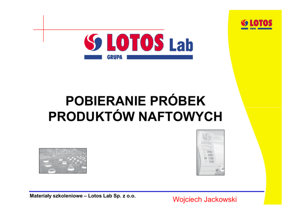 POBIERANIE PRÓBEK PRODUKTÓW NAFTOWYCH Materiały szkoleniowe – Lotos Lab Sp. z o.o. Wojciech Jackowski Pobieranie próbek produktów naftowych 2 UDZIAŁ POBIERANIA PRÓBKI W CAŁKOWITYM BŁĘDZIE UZYSKIWANIA WYNIKU ANALITYCZNEGO POMIAR I KALIBRACJA; 30% PRZYGOTOWANIE PRÓBKI; 12% POBIERANIE PRÓBKI; 48% OBRÓBKA DANYCH; 10% Materiały szkoleniowe – Lotos Lab Sp. z o.o. Pobieranie próbek produktów naftowych 3 ROZPORZĄDZENIA I NORMY DOTYCZĄCE POBIERANIA PRÓBEK 1/ Dz.U. Nr 64 poz. 595 z dnia 31.03.2007 – W sprawie monitorowania i kontrolowania paliw ciekłych i biopaliw ciekłych 2/ Dz.U. Nr 44 poz. 279 i 280 z dnia 31.01.2007 – W sprawie pobierania próbek gazu skroplonego (LPG) 3/ PN-EN ISO 3170:2006 – Ciekłe przetwory naftowe. Ręczne pobieranie próbek. 4/ PN-EN 14275:2005 – Ocena jakości benzyn i olejów napędowych. Pobieranie próbek z dystrybutorów detalicznych i przemysłowych. 5/ PN-EN ISO 4257:2004 – Skroplone gazy węglowodorowe. Metoda pobierania próbek. 6/ ZN/MG/CN-18:2007 – Pobieranie próbek LPG z odmierzacza Materiały szkoleniowe – Lotos Lab Sp. z o.o. Pobieranie próbek produktów naftowych PN-EN ISO 3170:2006 Ciekłe przetwory naftowe. Ręczne pobieranie próbek. ZAKRES NORMY Ręczne pobieranie próbek ciekłych lub półciekłych węglowodorów i pozostałości z: zbiorników stacjonarnych, cystern kolejowych, pojazdów drogowych, statków i barek, bębnów i pojemników, cieczy pompowanych rurociągami. Materiały szkoleniowe – Lotos Lab Sp. z o.o. 4 Pobieranie próbek produktów naftowych 5 PODSTAWOWE DEFINICJE Próbka przekrojowa – próbka otrzymana z zastosowaniem przyrządu, który napełnia się podczas przechodzenia przez wszystkie warstwy cieczy w jednym kierunku, z wyłączeniem wolnej wody. Próbka denna – próbka punktowa pobrana z warstwy przydennej powierzchni dna zbiornika lub pojemnika. Próbka ogólna – próbka otrzymana przez połączenie próbek punktowych w określonych proporcjach w taki sposób, aby otrzymać próbkę reprezentatywną dla danej partii produktu. Próbka dolna – próbka pobrana z 5/6 wysokości słupa cieczy poniżej górnej powierzchni. Materiały szkoleniowe – Lotos Lab Sp. z o.o. Pobieranie próbek produktów naftowych 6 ..cd podstawowe definicje Próbka środkowa – próbka pobrana z ½ wysokości słupa cieczy poniżej górnej powierzchni. Próbka górna – próbka pobrana z 1/6 wysokości słupa cieczy poniżej jej górnej powierzchni. Próbka szczytowa – próbka punktowa uzyskana na głębokości 150 mm poniżej powierzchni cieczy. Próbka reprezentatywna – próbka, której własności fizykochemiczne są zgodne ze średnimi właściwościami całej objętości produktu, z którego pobrano próbę. Próbka dwukierunkowa – próbka zgromadzona w próbopobieralniku przechodzącym przez całą warstwę cieczy w górę i w dół, z wyłączeniem wolnej wody. Próbka punktowa – próbka pobrana z określonego miejsca zbiornika lub rurociągu. Materiały szkoleniowe – Lotos Lab Sp. z o.o. Pobieranie próbek produktów naftowych 7 cd podstawowe definicje Hermetyczne pobieranie próbek - proces pobierania próbek w warunkach hermetycznych, nie pozwalający na przedostanie się do atmosfery jakiejkolwiek zawartości zbiornika lub par. Otwarte pobieranie próbek – tradycyjny proces pobierania próbek ze zbiornika przez otwarty właz kontrolny albo króćce próbobiorcze. Wiarygodność próbki – warunek pozostania próbki w stanie niezmienionym, tzn. takim, że próbka zachowuje taki sam skład, jak miała w chwili pobrania z partii cieczy. Materiały szkoleniowe – Lotos Lab Sp. z o.o. Pobieranie próbek produktów naftowych 8 Podstawowe sposoby ręcznego pobierania próbek naftowych: • • Statyczne pobieranie próbek (ze zbiorników) Dynamiczne pobieranie próbek (z rurociągów) STATYCZNE POBIERANIE PRÓBEK • • zawartość zbiornika w spoczynku pobieranie próbek: góra, środek, dół lub góra, środek i poziom rury odpływowej – sprawdzenie jednorodności zawartości zbiornika. Materiały szkoleniowe – Lotos Lab Sp. z o.o. Pobieranie próbek produktów naftowych 9 Rodzaje próbopobieralników Punktowe i strefowe Denne Dwukierunkowe * Pojemnik w koszu * Typu bańka obciążona * Strefowo/Rdzeniowe (pobieranie słupa cieczy z dowolnie wybranego poziomu) Materiały szkoleniowe – Lotos Lab Sp. z o.o. Przekrojowe * Typu „góra/dół” Do pozostałości / osadów * Chwytakowy * Grawitacyjny z rdzeniem tłokowym Pobieranie próbek produktów naftowych 10 Próbopobieralniki do pobireania próbek punktowych i rdzeniowych Przykłady próbników punktowych i strefowych: A/ Pojemnik w koszu (butelka w koszu) - konstrukcja umożliwiająca pobór próbek z dowolnego poziomu w zbiorniku Materiały szkoleniowe – Lotos Lab Sp. z o.o. Pobieranie próbek produktów naftowych ..cd Przykłady próbników punktowych i strefowych B/ Typu „bańka obciążona” - zawiera specjalne obciążenie ułatwiające zatopienie się w cieczy Materiały szkoleniowe – Lotos Lab Sp. z o.o. 11 Pobieranie próbek produktów naftowych 12 ..cd Przykłady próbników punktowych i strefowych C/ Próbniki strefowe/rdzeniowe - konstrukcja umożliwia swobodny przepływ podczas zanurzania w produkcie oraz pobranie pionowego słupa cieczy z dowolnie wybranego poziomu. Materiały szkoleniowe – Lotos Lab Sp. z o.o. Pobieranie próbek produktów naftowych ..cd Przykłady próbników punktowych i strefowych Próbniki denne - specjalny zawór wlotowy Materiały szkoleniowe – Lotos Lab Sp. z o.o. 13 Pobieranie próbek produktów naftowych ..cd Przykłady próbników punktowych i strefowych Próbniki do pozostałości / osadów - specjalna konstrukcja zaworu - próbniki chwytakowe (zamknięcie uruchamiane za pomocą sprężyny) - próbniki grawitacyjne z rdzeniem tłokowym (wyposażony w urządzenie ssące) Materiały szkoleniowe – Lotos Lab Sp. z o.o. 14 Pobieranie próbek produktów naftowych 15 ..cd 