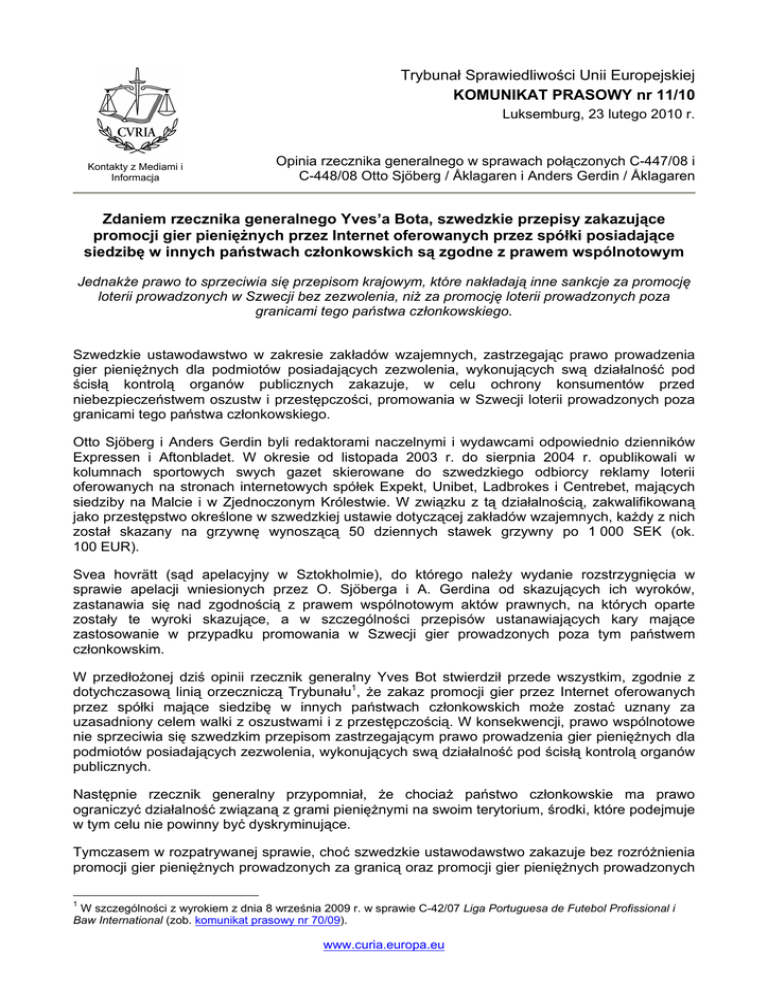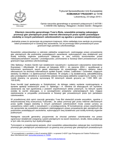 Trybunał Sprawiedliwości Unii Europejskiej KOMUNIKAT PRASOWY nr 11/10 Luksemburg, 23 lutego 2010 r. Kontakty z Mediami i Informacja Opinia rzecznika generalnego w sprawach połączonych C-447/08 i C-448/08 Otto Sjöberg / Åklagaren i Anders Gerdin / Åklagaren Zdaniem rzecznika generalnego Yves’a Bota, szwedzkie przepisy zakazujące promocji gier pieniężnych przez Internet oferowanych przez spółki posiadające siedzibę w innych państwach członkowskich są zgodne z prawem wspólnotowym Jednakże prawo to sprzeciwia się przepisom krajowym, które nakładają inne sankcje za promocję loterii prowadzonych w Szwecji bez zezwolenia, niż za promocję loterii prowadzonych poza granicami tego państwa członkowskiego. Szwedzkie ustawodawstwo w zakresie zakładów wzajemnych, zastrzegając prawo prowadzenia gier pieniężnych dla podmiotów posiadających zezwolenia, wykonujących swą działalność pod ścisłą kontrolą organów publicznych zakazuje, w celu ochrony konsumentów przed niebezpieczeństwem oszustw i przestępczości, promowania w Szwecji loterii prowadzonych poza granicami tego państwa członkowskiego. Otto Sjöberg i Anders Gerdin byli redaktorami naczelnymi i wydawcami odpowiednio dzienników Expressen i Aftonbladet. W okresie od listopada 2003 r. do sierpnia 2004 r. opublikowali w kolumnach sportowych swych gazet skierowane do szwedzkiego odbiorcy reklamy loterii oferowanych na stronach internetowych spółek Expekt, Unibet, Ladbrokes i Centrebet, mających siedziby na Malcie i w Zjednoczonym Królestwie. W związku z tą działalnością, zakwalifikowaną jako przestępstwo określone w szwedzkiej ustawie dotyczącej zakładów wzajemnych, każdy z nich został skazany na grzywnę wynoszącą 50 dziennych stawek grzywny po 1 000 SEK (ok. 100 EUR). Svea hovrätt (sąd apelacyjny w Sztokholmie), do którego należy wydanie rozstrzygnięcia w sprawie apelacji wniesionych przez O. Sjöberga i A. Gerdina od skazujących ich wyroków, zastanawia się nad zgodnością z prawem wspólnotowym aktów prawnych, na których oparte zostały te wyroki skazujące, a w szczególności przepisów ustanawiających kary mające zastosowanie w przypadku promowania w Szwecji gier prowadzonych poza tym państwem członkowskim. W przedłożonej dziś opinii rzecznik generalny Yves Bot stwierdził przede wszystkim, zgodnie z dotychczasową linią orzeczniczą Trybunału1, że zakaz promocji gier przez Internet oferowanych przez spółki mające siedzibę w innych państwach członkowskich może zostać uznany za uzasadniony celem walki z oszustwami i z przestępczością. W konsekwencji, prawo wspólnotowe nie sprzeciwia się szwedzkim przepisom zastrzegającym prawo prowadzenia gier pieniężnych dla podmiotów posiadających zezwolenia, wykonujących swą działalność pod ścisłą kontrolą organów publicznych. Następnie rzecznik generalny przypomniał, że chociaż państwo członkowskie ma prawo ograniczyć działalność związaną z grami pieniężnymi na swoim terytorium, środki, które podejmuje w tym celu nie powinny być dyskryminujące. Tymczasem w rozpatrywanej sprawie, choć szwedzkie ustawodawstwo zakazuje bez rozróżnienia promocji gier pieniężnych prowadzonych za granicą oraz promocji gier pieniężnych prowadzonych 1 W szczególności z wyrokiem z dnia 8 września 2009 r. w sprawie C-42/07 Liga Portuguesa de Futebol Profissional i Baw International (zob. komunikat prasowy nr 70/09). www.curia.europa.eu na terytorium krajowym bez zezwolenia, różne są kary przewidziane w przypadku naruszenia tego zakazu. I tak, podczas gdy wobec osób, które reklamują gry prowadzone za granicą przewidziane są kary grzywny i pozbawienia wolności do sześciu miesięcy, osoby promujące gry prowadzone w Szwecji bez zezwolenia nie podlegają równoważnym sankcjom karnym, lecz tylko karom administracyjnym. Dlatego takie prawo krajowe wprowadza różnicę w traktowaniu porównywalnych sytuacji, na niekorzyść spółek mających siedzibę w innych państwach członkowskich. Ta różnica w traktowaniu nie może być uzasadniona tym, że dwie rozpatrywane tu kategorie naruszeń różnią się znacznie w zakresie powodowanych przez nie niedogodności lub warunków, na jakich mogą zostać stwierdzone. Gry przez Internet prowadzone przez spółkę mającą siedzibę w innym państwie członkowskim niekoniecznie stanowią większe niebezpieczeństwo pod względem oszustw i przestępczości na szkodę konsumentów niż gry prowadzone potajemnie przez spółkę mającą siedzibę na terytorium krajowym. W konsekwencji, rzecznik generalny stwierdził, że prawo wspólnotowe sprzeciwia się przepisom krajowym, zgodnie z którymi ten, kto promuje udział w grach przez Internet prowadzonych przez spółkę mającą siedzibę w innym państwie członkowskim podlega sankcjom karnym, podczas gdy ten, kto promuje udział w takich grach prowadzonych bez zezwolenia na terytorium krajowym nie podlega takiej karze. UWAGA: Opinia rzecznika generalnego nie wiąże Trybunału Sprawiedliwości. Zadanie rzeczników generalnych polega na przedkładaniu Trybunałowi, przy zachowaniu całkowitej niezależności, propozycji rozstrzygnięć prawnych w sprawach, które rozpatrują. Sędziowie Trybunału rozpoczynają właśnie obrady w tej sprawie. Wyrok zostanie wydany w terminie późniejszym. UWAGA: Odesłanie prejudycjalne pozwala sądom państw członkowskich, w ramach rozpatrywanego przez nie sporu, zwrócić się do Trybunału z pytaniem o wykładnię prawa Unii lub o ocenę ważności aktu Unii. Trybunał nie rozpoznaje sporu krajowego. Do sądu krajowego należy rozstrzygnięcie sprawy zgodnie z orzeczeniem Trybunału. Orzeczenie to wiąże w ten sam sposób inne sądy krajowe, które spotkają się z podobnym problemem. Dokument nieoficjalny, sporządzony na użytek mediów, który nie wiąże Trybunału Sprawiedliwości. Pełny tekst opinii jest publikowany na stronie internetowej CURIA w dn