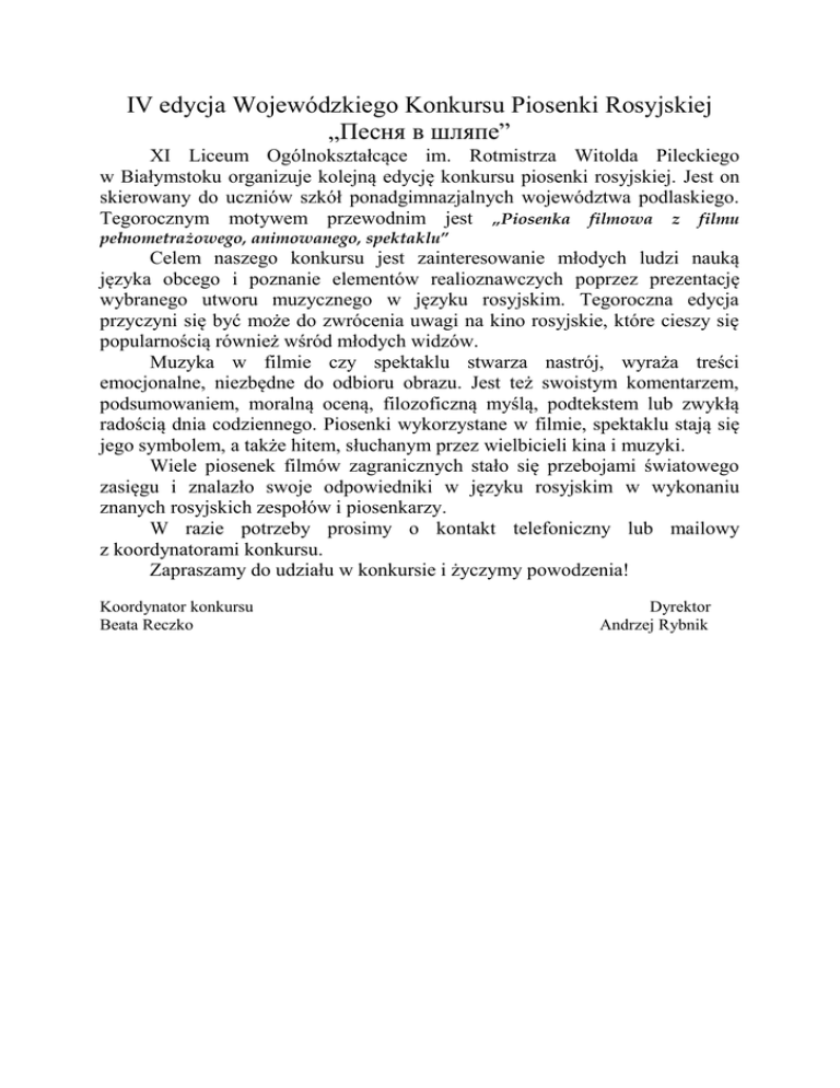 IV edycja Wojewódzkiego Konkursu Piosenki Rosyjskiej „Песня в шляпе” XI Liceum Ogólnokształcące im. Rotmistrza Witolda Pileckiego w Białymstoku organizuje kolejną edycję konkursu piosenki rosyjskiej. Jest on skierowany do uczniów szkół ponadgimnazjalnych województwa podlaskiego. Tegorocznym motywem przewodnim jest „Piosenka filmowa z filmu pełnometrażowego, animowanego, spektaklu” Celem naszego konkursu jest zainteresowanie młodych ludzi nauką języka obcego i poznanie elementów realioznawczych poprzez prezentację wybranego utworu muzycznego w języku rosyjskim. Tegoroczna edycja przyczyni się być może do zwrócenia uwagi na kino rosyjskie, które cieszy się popularnością również wśród młodych widzów. Muzyka w filmie czy spektaklu stwarza nastrój, wyraża treści emocjonalne, niezbędne do odbioru obrazu. Jest też swoistym komentarzem, podsumowaniem, moralną oceną, filozoficzną myślą, podtekstem lub zwykłą radością dnia codziennego. Piosenki wykorzystane w filmie, spektaklu stają się jego symbolem, a także hitem, słuchanym przez wielbicieli kina i muzyki. Wiele piosenek filmów zagranicznych stało się przebojami światowego zasięgu i znalazło swoje odpowiedniki w języku rosyjskim w wykonaniu znanych rosyjskich zespołów i piosenkarzy. W razie potrzeby prosimy o kontakt telefoniczny lub mailowy z koordynatorami konkursu. Zapraszamy do udziału w konkursie i życzymy powodzenia! Koordynator konkursu Beata Reczko Dyrektor Andrzej Rybnik z apr asz a do udzia łu w : X I Li ceum Ogól noks zta ł cą ce i m. R otmis tr za Witol da Pi l eckiego w Bi ał y ms to ku za pras za do udzia ł u w : WOJEWÓDZKIM KONKURSIE PIOSENKI ROSYJSKIEJ w roku szkolnym 2014/2015 pt. „П Е С Н Я В Ш Л Я П Е” Motyw przewodni „Piosenka filmowa z filmu pełnometrażowego, animowanego, spektaklu”. po d ho no row ym pa tro na tem: Prezydenta Miasta Białegostoku Instytutu Filologii Wschodniosłowiańskiej Uniwersytetu w Białymstoku Rosyjskiego Ośrodka Nauki i Kultury Opera i Filharmonia Podlaska Europejskie Centrum Sztuki w Białymstoku REGULAMIN WOJEWÓDZKIEGO KONKURSU PIOSENKI ROSYJSKIEJ w roku szkolnym 2014/2015 pt. „П Е С Н Я В Ш Л Я П Е” Motyw przewodni „Piosenka filmowa z filmu pełnometrażowego, animowanego, spektaklu”. . Organizatorem konkursu jest XI Liceum Ogólnokształcące im. Rotmistrza Witolda Pileckiego w Białymstoku. Konkurs odbędzie się w XI LO im. rtm. Witolda Pileckiego w Białymstoku, ul. Grottgera 9 w dniu 15.11.2014r. Konkurs jest skierowany do uczniów szkół ponadgimnazjalnych. Zamysłem naszego konkursu jest propagowanie języka rosyjskiego poprzez piosenkę. Podstawą pomysłu była popularna gra noworoczna, w której uczestnicy losują z kapelusza słowo i śpiewają piosenkę, zawierającą właśnie to słowo. W czasie III edycji konkursu został wylosowany wątek „Piosenka filmowa z filmu pełnometrażowego, animowanego, spektaklu”, zatem zaprezentowana piosenka powinna pochodzić z filmu, animacji, spektaklu w języku rosyjskim. Gorąco zapraszamy do udziału w dobrej zabawie i życzymy sukcesów! Celem konkursu jest: - doskonalenie umiejętności językowych poprzez naukę tekstów piosenek w języku obcym, - zaprezentowanie uzdolnień wokalnych i lingwistycznych młodzieży, - zapoznanie z twórczością rosyjskich twórców i wykonawców muzycznych, - zainteresowanie uczniów językiem rosyjskim i kulturą Rosji, - zachęcenie do rozwijania umiejętności językowych i artystycznych. Warunki uczestnictwa Eliminacje szkolne powinny być przeprowadzone przez nauczycieli na terenie szkoły. Szkoła może przesłać maksymalnie dwa zgłoszenia. W prezentacji utworu mogą wziąć udział soliści lub duety. Uczestnicy konkursu prezentują jedną współczesną piosenkę rosyjskiego artysty w języku rosyjskim z elementem uczucia, np. radości, smutku, miłości, przyjaźni, szacunku, troski, itp. Utwory mogą być wykonane a'cappella lub z akompaniamentem (np. instrumenty muzyczne lub półplayback z płyty CD). Utwór powinien być dostosowany do wieku i możliwości uczestnika. Szkoła wysyła wypełnioną kartę zgłoszenia, tekst utworu oraz płytę CD z podkładem muzycznym, jeśli taki będzie użyty podczas konkursu (format audio lub mp3). Każda płyta powinna być opisana - tytuł piosenki, wykonawca, szkoła. Prosimy o wysłanie zgłoszeń z płytą do dnia 31.10.2013 na adres: XI Liceum Ogólnokształcące im. rtm. W. Pileckiego ul. Grottgera 9 15- 225 Białystok z dopiskiem: „konkurs piosenki rosyjskiej” Można też wysłać kartę - zgłoszenie, tekst utworu oraz podkład (format: mp3, wav) drogą mailową na adres e-mail: [email protected] również do dnia 31.10.2014. Karta zgłoszenia uczestnika w załączeniu do regulaminu. Jednocześnie prosimy o potwierdzenie e-mailowe, w którym zawarta będzie nazwa szkoły oraz ilość uczestników na adres e-mail: [email protected] do 31.10.2014r. O kolejności prezentacji decydują organizatorzy. Czas trwania utworu nie powinien przekroczyć 5 minut. Organizator w czasie konkursu zapewnia sprzęt nagłośnieniowy z odtwarzaczem CD, przy wcześniejszym zgłoszeniu takiej potrzeby – pianino. Nie zapewniamy akompaniatora. Organizatorzy nie ponoszą odpowiedzialności za brak możliwości odtworzenia płyty CD z winy uczestnika konkursu. Organizator nie zwraca kosztów poniesionych przez uczestników konkursu oraz ich opiekunów w związku z dojazdem, pobytem i ubezpieczeniem. Do oceny wykonawców zostanie powołane Jury: - nauczyciele rusycyści, - wykładowcy akademiccy, - artyści. Jury ocenia: ogólny wyraz artystyczny zaprezentowanego utworu, dobór repertuaru, poprawność językową i fonetyczną wykonywanego tekstu piosenki, emisję, dykcję, intonację i interpretację. Wszyscy uczestnicy otrzymają potwierdzenie udziału w konkursie. Jury po wysłuchaniu uczestników wyłoni zwycięzców I, II, III miejsc