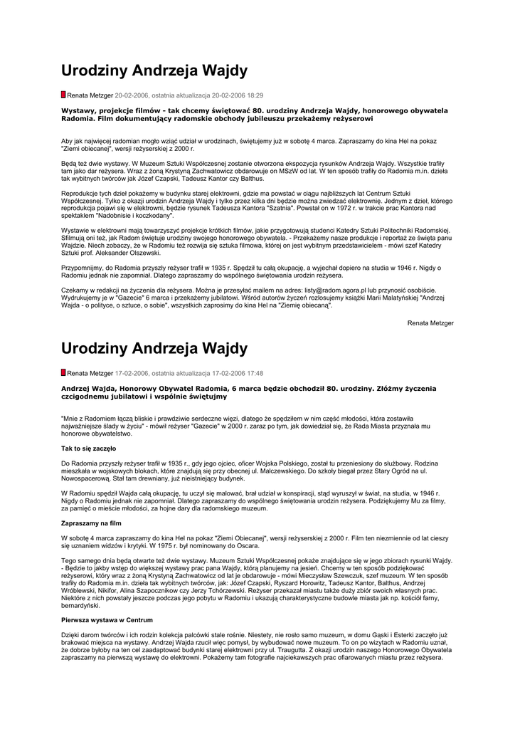 Urodziny Andrzeja Wajdy Renata Metzger 20-02-2006, ostatnia aktualizacja 20-02-2006 18:29 Wystawy, projekcje filmów - tak chcemy świętować 80. urodziny Andrzeja Wajdy, honorowego obywatela Radomia. Film dokumentujący radomskie obchody jubileuszu przekażemy reżyserowi Aby jak najwięcej radomian mogło wziąć udział w urodzinach, świętujemy już w sobotę 4 marca. Zapraszamy do kina Hel na pokaz "Ziemi obiecanej", wersji reżyserskiej z 2000 r. Będą też dwie wystawy. W Muzeum Sztuki Współczesnej zostanie otworzona ekspozycja rysunków Andrzeja Wajdy. Wszystkie trafiły tam jako dar reżysera. Wraz z żoną Krystyną Zachwatowicz obdarowuje on MSzW od lat. W ten sposób trafiły do Radomia m.in. dzieła tak wybitnych twórców jak Józef Czapski, Tadeusz Kantor czy Balthus. Reprodukcje tych dzieł pokażemy w budynku starej elektrowni, gdzie ma powstać w ciągu najbliższych lat Centrum Sztuki Współczesnej. Tylko z okazji urodzin Andrzeja Wajdy i tylko przez kilka dni będzie można zwiedzać elektrownię. Jednym z dzieł, którego reprodukcja pojawi się w elektrowni, będzie rysunek Tadeusza Kantora "Szatnia". Powstał on w 1972 r. w trakcie prac Kantora nad spektaklem "Nadobnisie i koczkodany". Wystawie w elektrowni mają towarzyszyć projekcje krótkich filmów, jakie przygotowują studenci Katedry Sztuki Politechniki Radomskiej. Sfilmują oni też, jak Radom świętuje urodziny swojego honorowego obywatela. - Przekażemy nasze produkcje i reportaż ze święta panu Wajdzie. Niech zobaczy, że w Radomiu też rozwija się sztuka filmowa, której on jest wybitnym przedstawicielem - mówi szef Katedry Sztuki prof. Aleksander Olszewski. Przypomnijmy, do Radomia przyszły reżyser trafił w 1935 r. Spędził tu całą okupację, a wyjechał dopiero na studia w 1946 r. Nigdy o Radomiu jednak nie zapomniał. Dlatego zapraszamy do wspólnego świętowania urodzin reżysera. Czekamy w redakcji na życzenia dla reżysera. Można je przesyłać mailem na adres: [email protected] lub przynosić osobiście. Wydrukujemy je w "Gazecie" 6 marca i przekażemy jubilatowi. Wśród autorów życzeń rozlosujemy książki Marii Malatyńskiej "Andrzej Wajda - o polityce, o sztuce, o sobie", wszystkich zaprosimy do kina Hel na "Ziemię obiecaną". Renata Metzger Urodziny Andrzeja Wajdy Renata Metzger 17-02-2006, ostatnia aktualizacja 17-02-2006 17:48 Andrzej Wajda, Honorowy Obywatel Radomia, 6 marca będzie obchodził 80. urodziny. Złóżmy życzenia czcigodnemu jubilatowi i wspólnie świętujmy "Mnie z Radomiem łączą bliskie i prawdziwie serdeczne więzi, dlatego że spędziłem w nim część młodości, która zostawiła najważniejsze ślady w życiu" - mówił reżyser "Gazecie" w 2000 r. zaraz po tym, jak dowiedział się, że Rada Miasta przyznała mu honorowe obywatelstwo. Tak to się zaczęło Do Radomia przyszły reżyser trafił w 1935 r., gdy jego ojciec, oficer Wojska Polskiego, został tu przeniesiony do służbowy. Rodzina mieszkała w wojskowych blokach, które znajdują się przy obecnej ul. Malczewskiego. Do szkoły biegał przez Stary Ogród na ul. Nowospacerową. Stał tam drewniany, już nieistniejący budynek. W Radomiu spędził Wajda całą okupację, tu uczył się malować, brał udział w konspiracji, stąd wyruszył w świat, na studia, w 1946 r. Nigdy o Radomiu jednak nie zapomniał. Dlatego zapraszamy do wspólnego świętowania urodzin reżysera. Podziękujemy Mu za filmy, za pamięć o mieście młodości, za hojne dary dla radomskiego muzeum. Zapraszamy na film W sobotę 4 marca zapraszamy do kina Hel na pokaz "Ziemi Obiecanej", wersji reżyserskiej z 2000 r. Film ten niezmiennie od lat cieszy się uznaniem widzów i krytyki. W 1975 r. był nominowany do Oscara. Tego samego dnia będą otwarte też dwie wystawy. Muzeum Sztuki Współczesnej pokaże znajdujące się w jego zbiorach rysunki Wajdy. - Będzie to jakby wstęp do większej wystawy prac pana Wajdy, którą planujemy na jesień. Chcemy w ten sposób podziękować reżyserowi, który wraz z żoną Krystyną Zachwatowicz od lat je obdarowuje - mówi Mieczysław Szewczuk, szef muzeum. W ten sposób trafiły do Radomia m.in. dzieła tak wybitnych twórców, jak: Józef Czapski, Ryszard Horowitz, Tadeusz Kantor, Balthus, Andrzej Wróblewski, Nikifor, Alina Szapocznikow czy Jerzy Tchórzewski. Reżyser przekazał miastu także duży zbiór swoich własnych prac. Niektóre z nich powstały jeszcze podczas jego pobytu w Radomiu i ukazują charakterystyczne budowle miasta jak np. kościół farny, bernardyński. Pierwsza wystawa w Centrum Dzięki darom twórców i ich rodzin kolekcja palcówki stale rośnie. Niestety, nie rosło samo muzeum, w domu Gąski i Esterki zaczęło już brakować miejsca na wystawy. Andrzej Wajda rzucił więc pomysł, by wybudować nowe muzeum. To on po wizytach w Radomiu uznał, że dobrze byłoby na ten cel zaadaptować budynki starej elektrowni przy ul. Traugutta. Z okazji urodzin naszego Honorowego Obywatela zapraszamy na pierwszą wystawę do elektrowni. Pokażemy tam fotografie najciekawszych prac ofiarowanych miastu przez reżysera. Tylko fotografie, bo obiekt jest jeszcze niewyremontowany i niegotowy do ekspozycji oryginałów. - Otworzymy na kilka dni podwoje elektrowni. To niezwykła okazja, bo dotychczas radomianie nie mogli w ogóle zwiedzać tego budynku. Wszystko to w uznaniu zasług pana Wajdy, który podsunął nam myśl budowy centrum. Liczymy, że nadal będzie nas wspierał - mówi Agata Morgan, pełnomocnik Zarządu Województwa Mazowieckiego ds. tworzenia Centrum Sztuki Współczesnej "Elektrownia". Od poniedziałku czekamy też w redakcji na życzenia dla reżysera. Można je przesyłać mailem na adres: [email protected] lub przynosić osobiście. Wydrukujemy je w "Gazecie" 6 marca i przekażemy jubilatowi. Wśród autorów życzeń rozlosujemy książki Marii Malatyńskiej "Andrzej Wajda - o polityce, o sztuce, o sobie", wszystkich zaprosimy do kina H